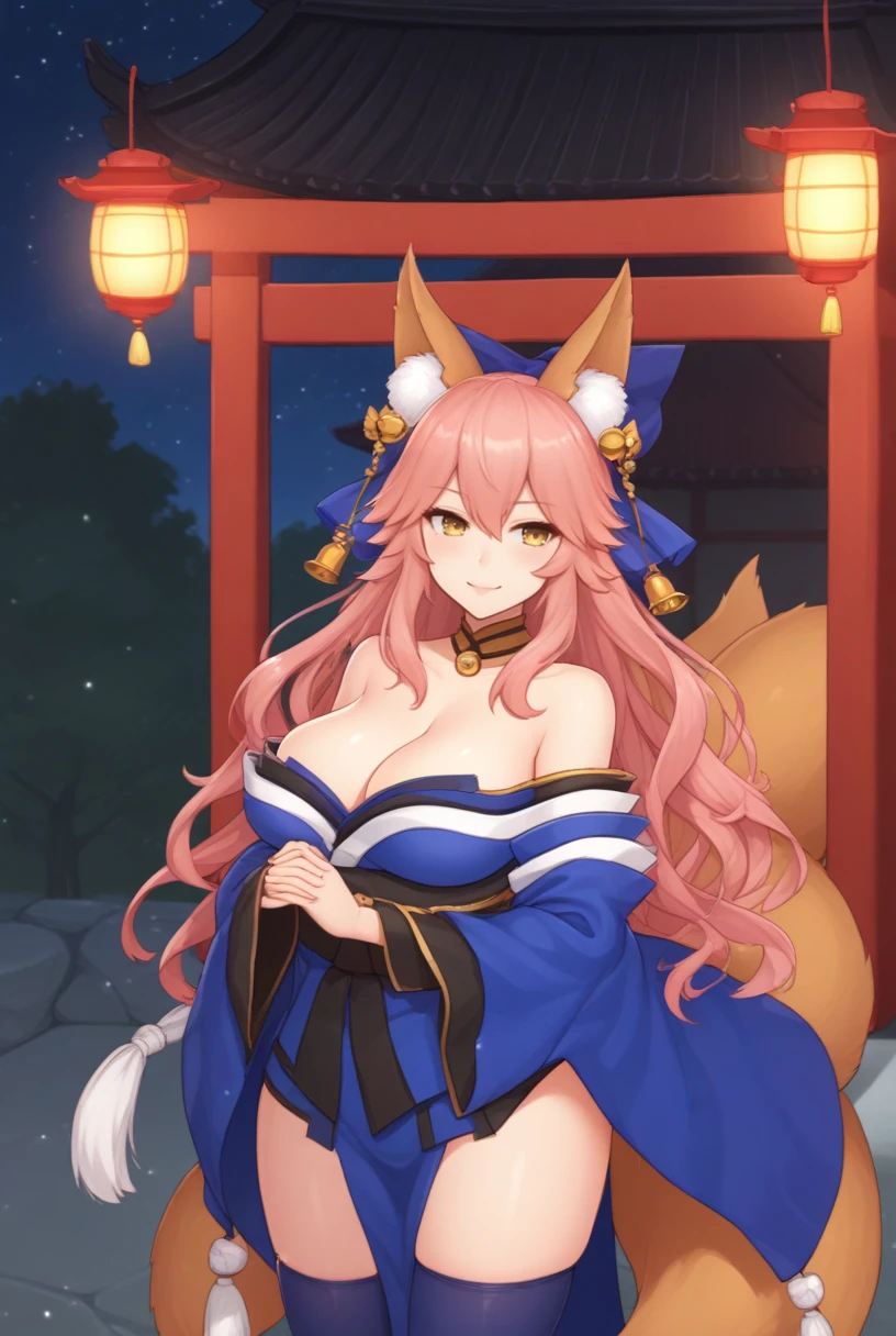 tamamo third def, yellow eyes, pink hair, wavy hair, long hair, animal ears, fox ears, animal ear fluff, fox tail, multiple tails, hair bow, hair ornament, bell, headpiece, japanese clothes, off shoulder, long sleeves, wide sleeves, obi, sash, blue thighhighs, neck ring, black ribbon, ribbonCat first Ascension: