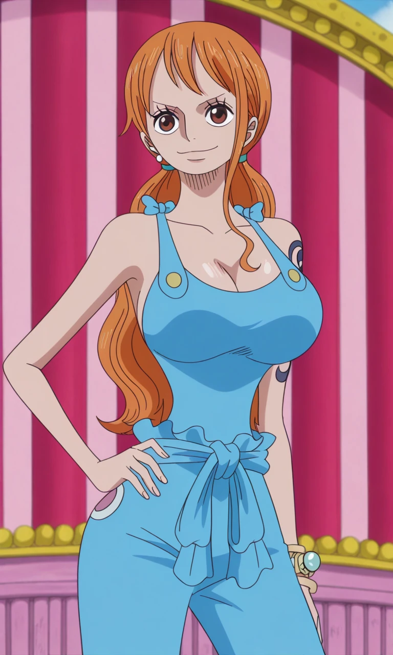 nami,1girl,solo,long hair,twintails,low twintails, orange hair,brown eyes, cleavage, earrings, jewelry, bracelet, dress, blue dress, bangle, overalls, blue overalls, bare shoulders, clothes around waist, long pants, harem pants