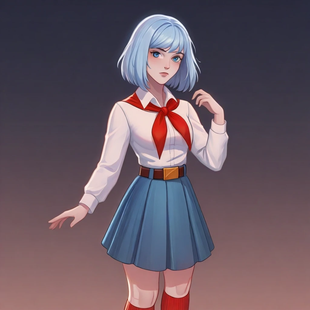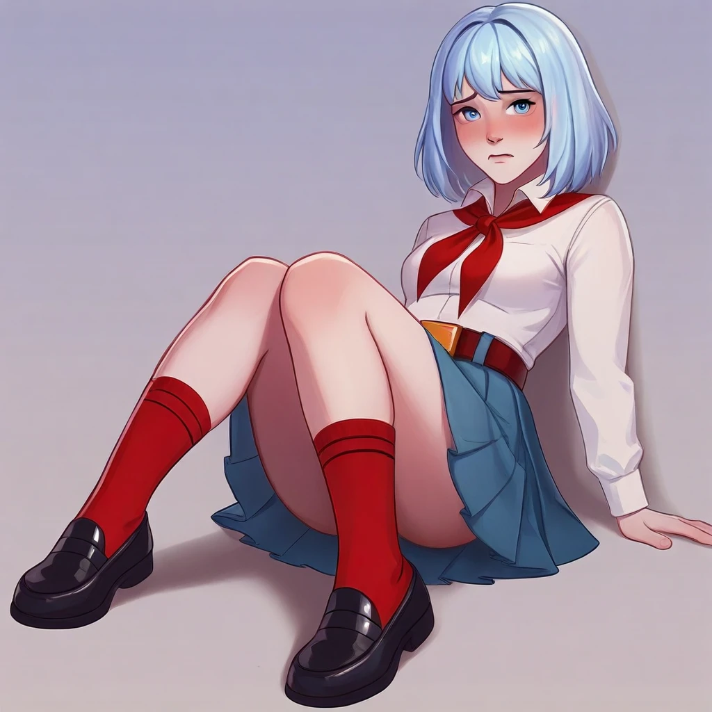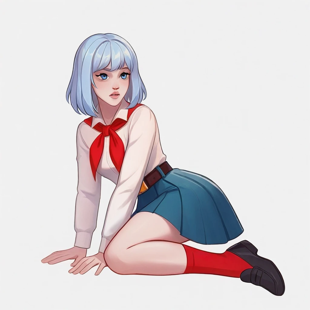 light blue hair, short hair, blue eyes, white shirt, blue skirt, pleated skirt, red neckerchief, white socks, black loafers, belt buckle