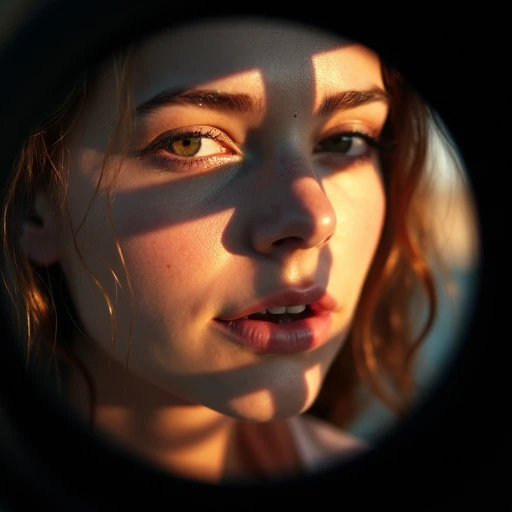 "Portrait of a woman with fairy lights behind her, cremabokeh, ovalbokeh, lights transformed into soft glowing ovals, focus on eyes, romantic mood."