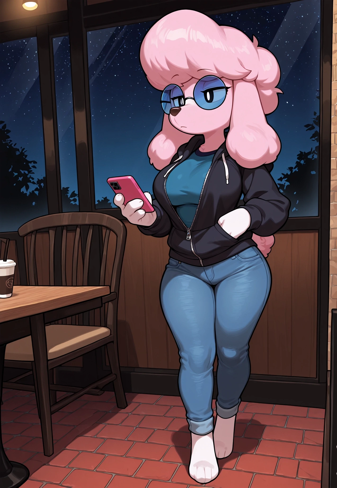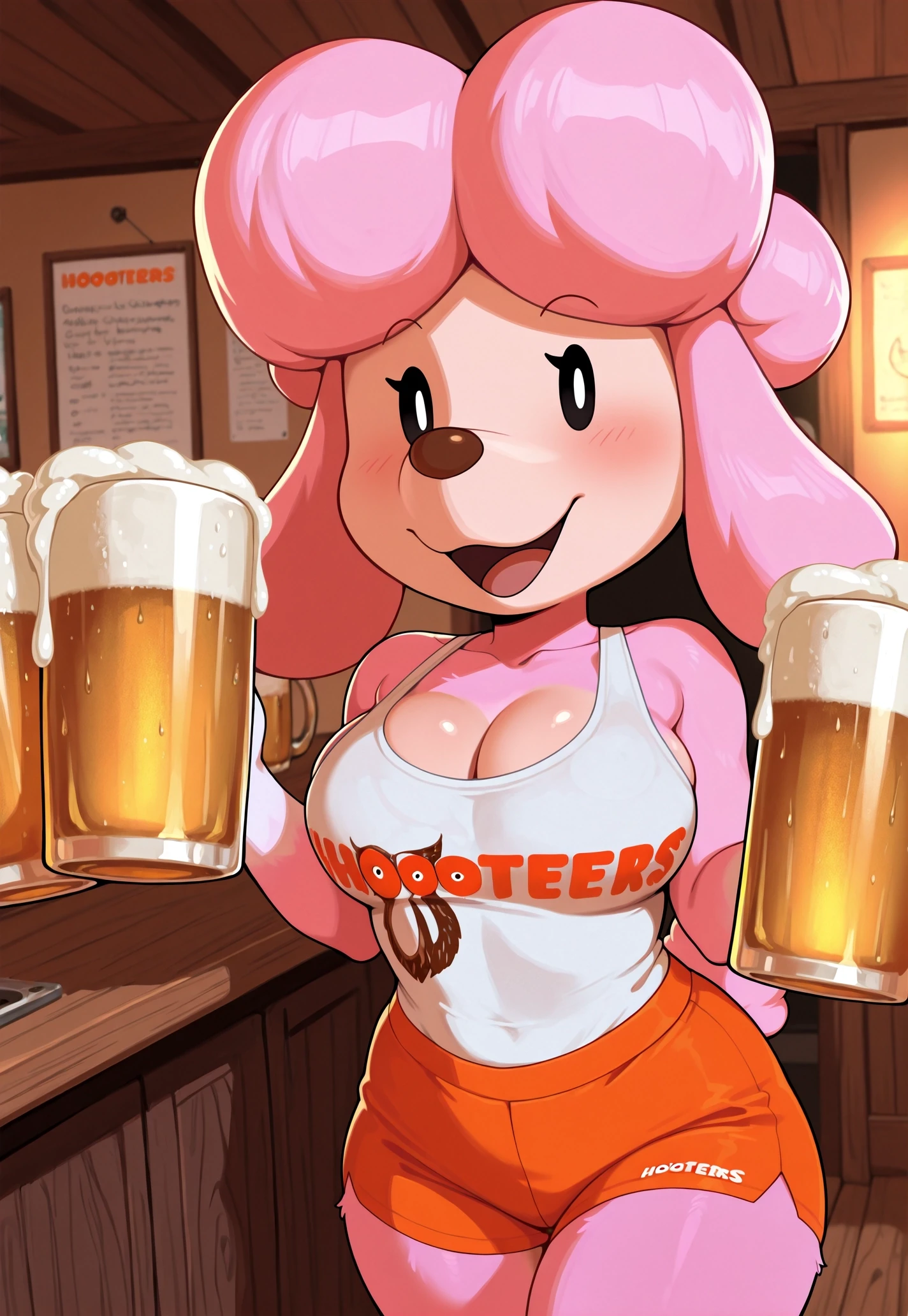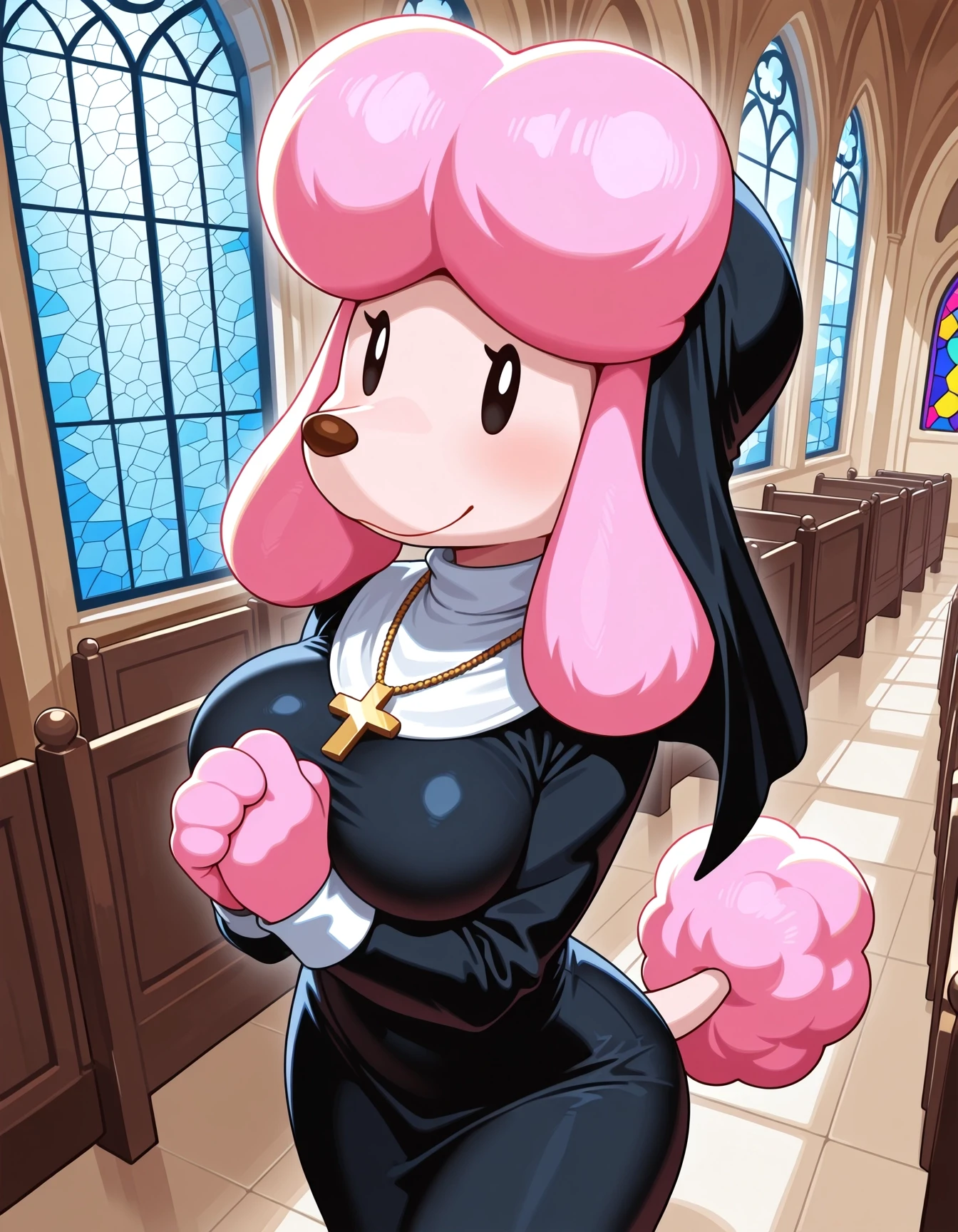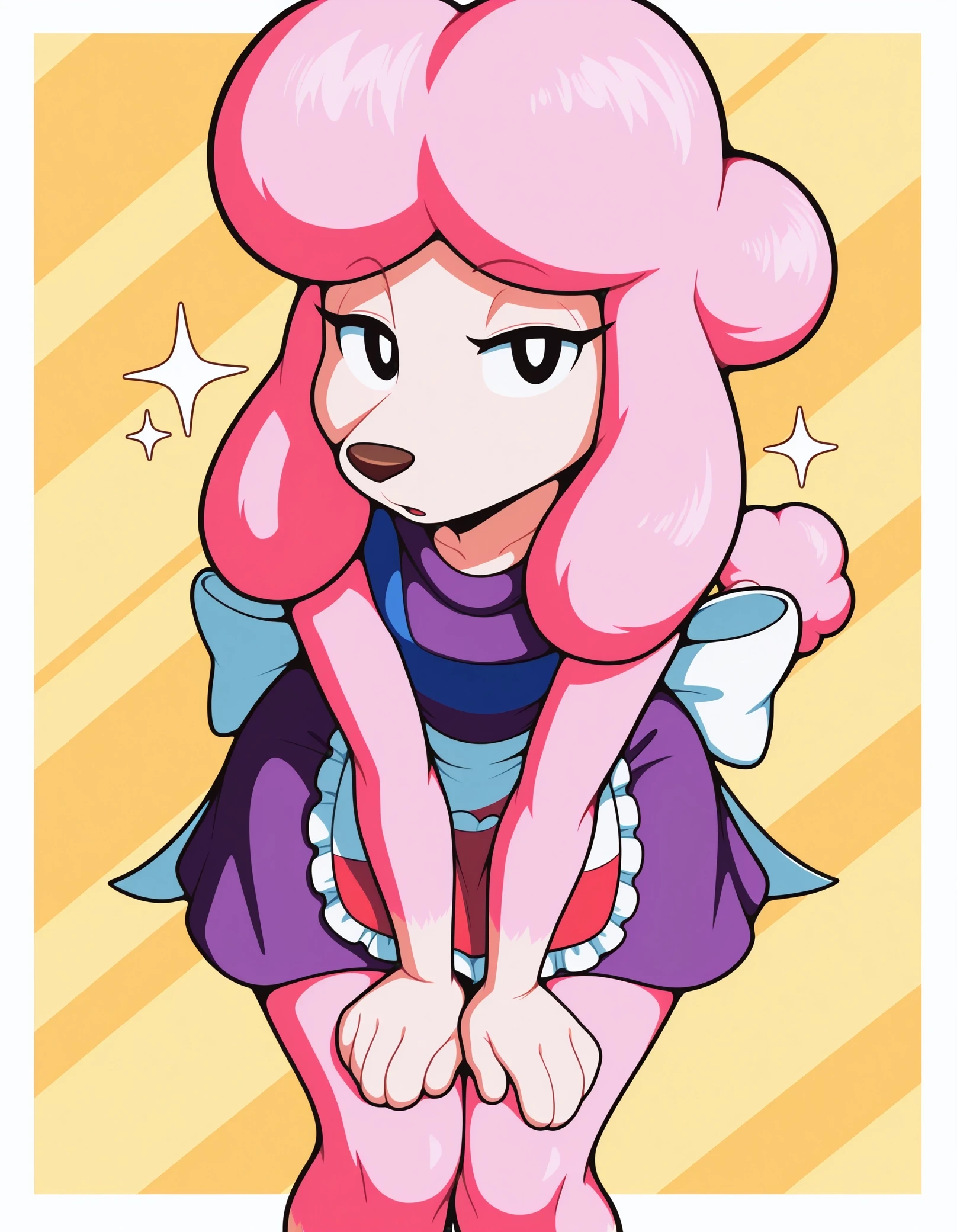 HarrietAC, 1girl, anthro female, furry female, anthro canine, (poodle tail:0.75), dog ears, animal ears, animal nose, simple eyes, solid oval eyes, black eyes, white pupils, pink fur, pink hair, long ears,