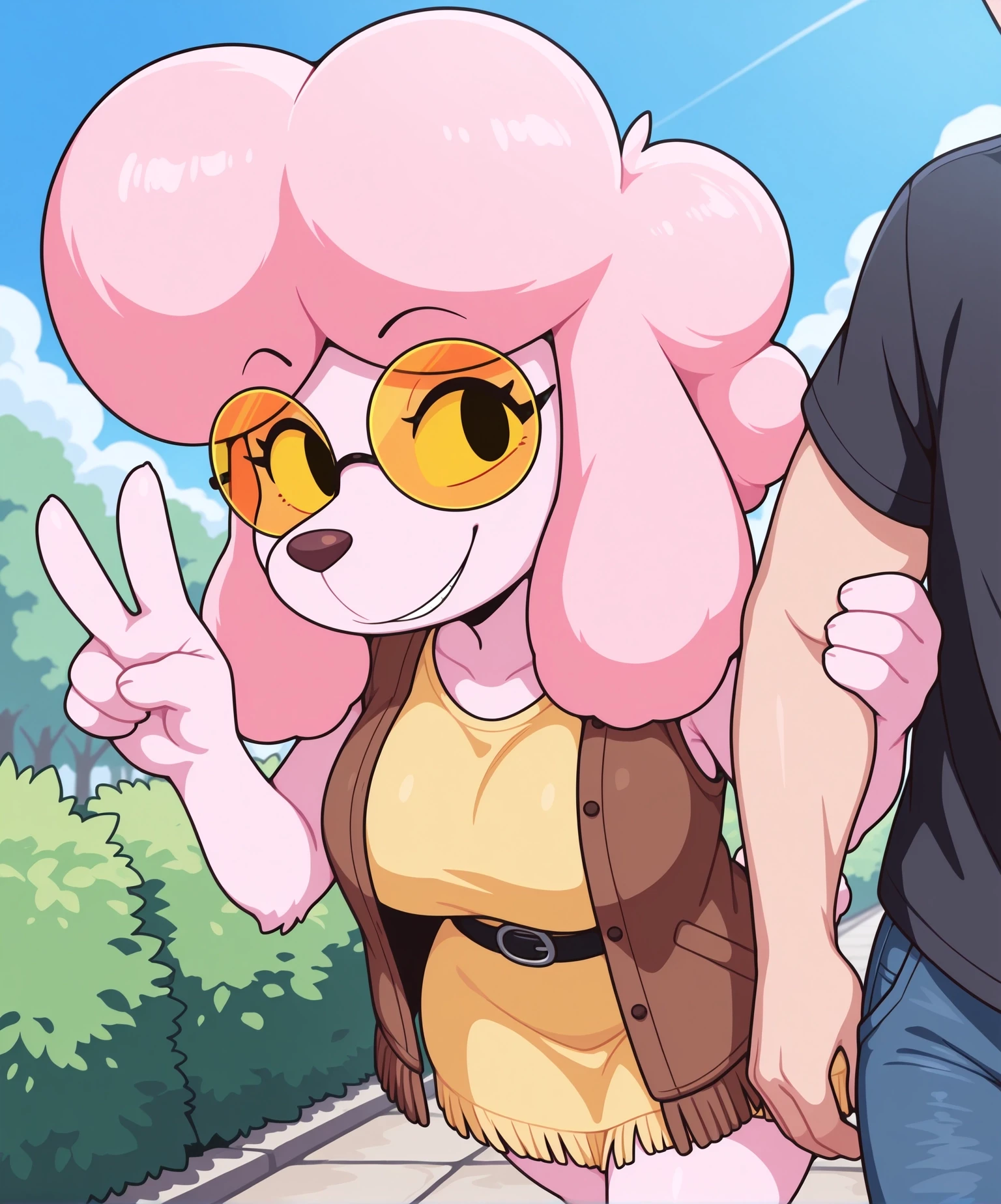neck fluff, neck ruff, wrist cuffs, flat colors,With my experience on Oops All Toons! and Banana Splitz, it may be predisposed to giving an anthro poodle neck and wrist fluff, which Harriet doesnt have, so if you dont want that, use those negatives listed, and also put Poodle in the positive prompt as little as possible (why i put weight for poodle tail so low).