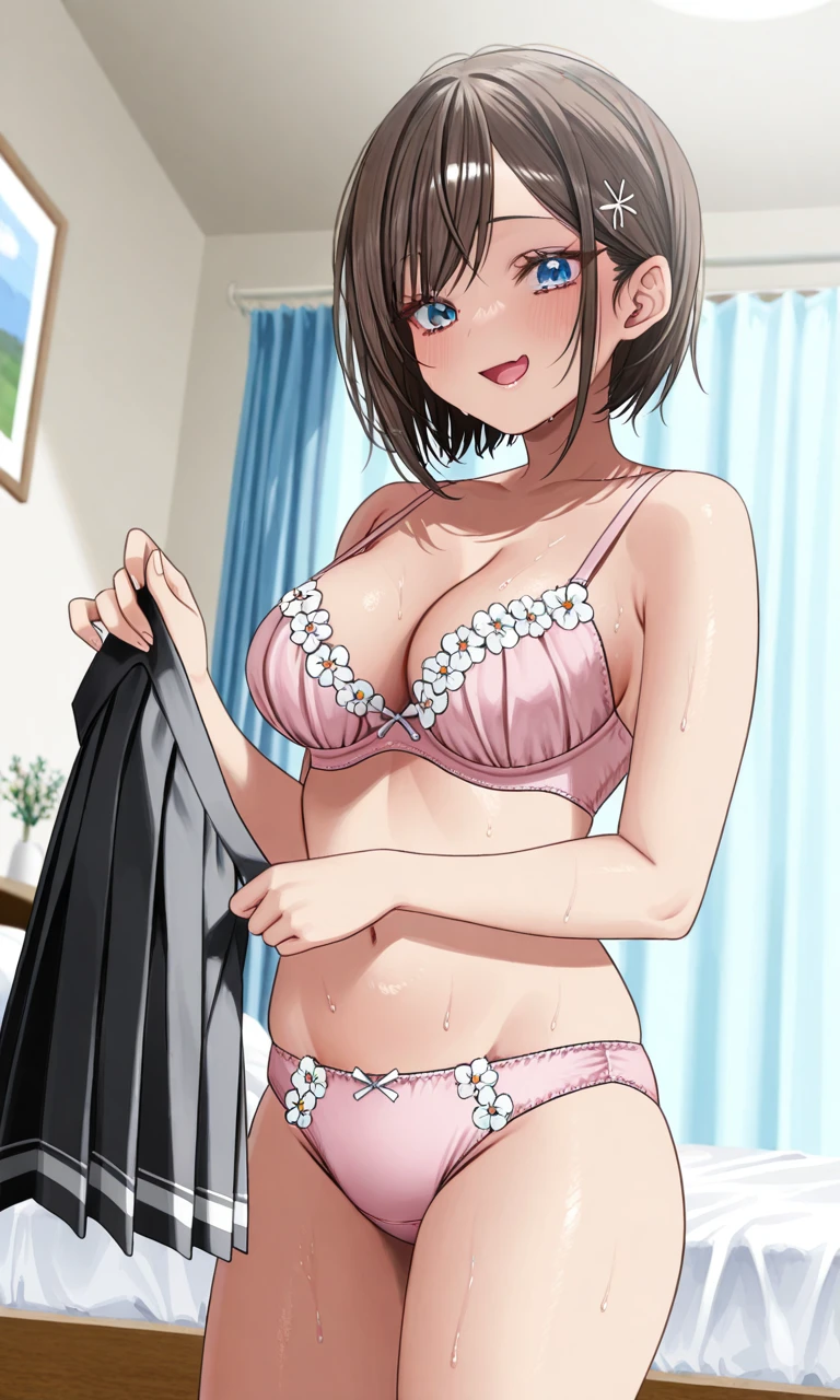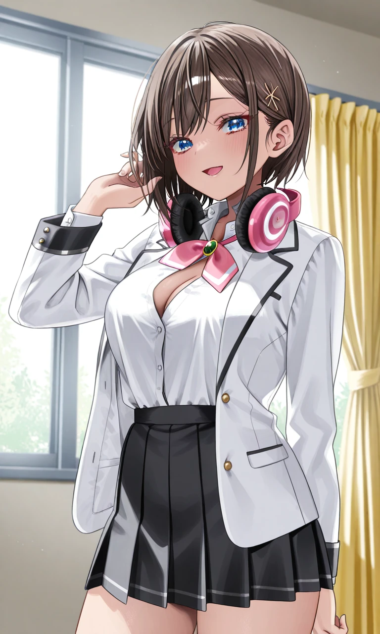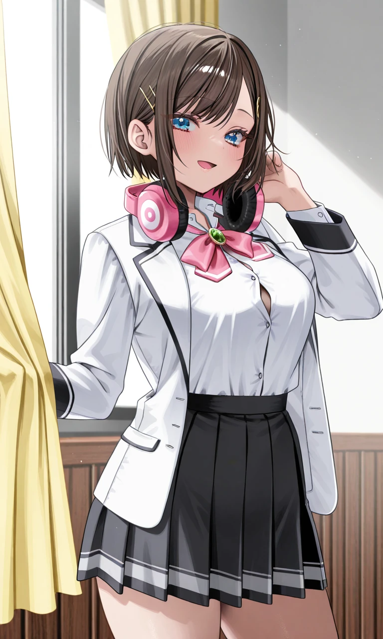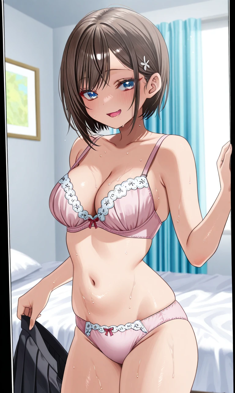 usami hikari, short hair, bob cut, layered hair, side-parted bangs, long side bangs, hair tucked behind ears, loose face-framing strands, hair strand covering ear, hair clip, blue eyes, long eyelashes, medium breasts,Outfit (still very inconsistent):