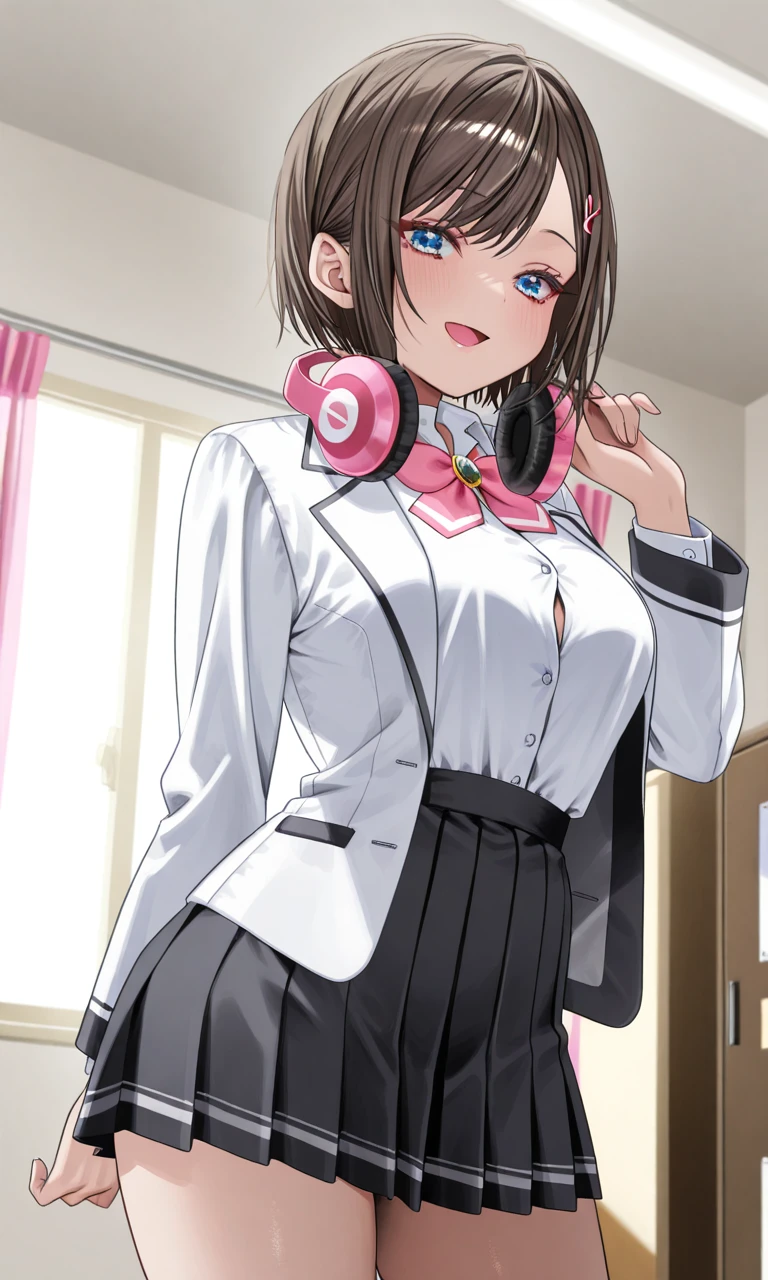 - School uniform:jacket, white blazer, school blazer, fitted blazer, single-breasted blazer, black piping trim, blazer gold buttons, front-buttoned blazer, tailored waist, structured shoulders, red inner lining, red blazer lining, contrasting inner color, open blazer,white shirt, button-up shirt, collared shirt, gray collar, gray vertical placket trim, gray trim running down shirt buttons, gray cuffs, long sleeves, shirt tucked in,black skirt, pleated skirt, short skirt, white hem stripe, double stripe hem,pink ribbon bow, gemstone brooch,