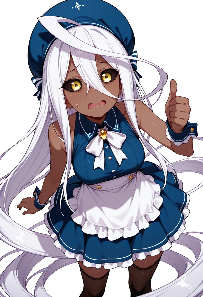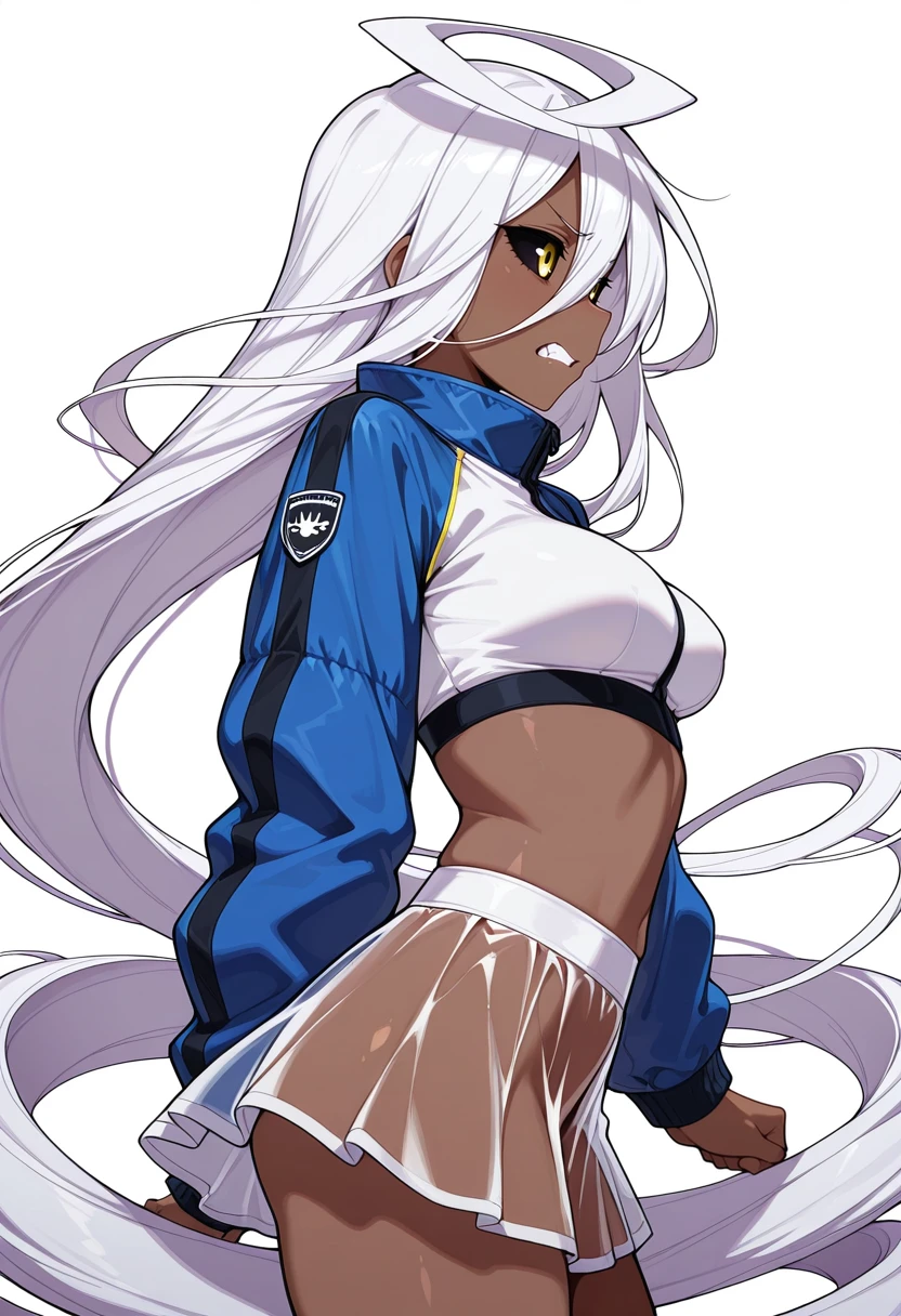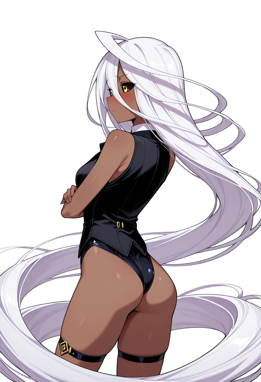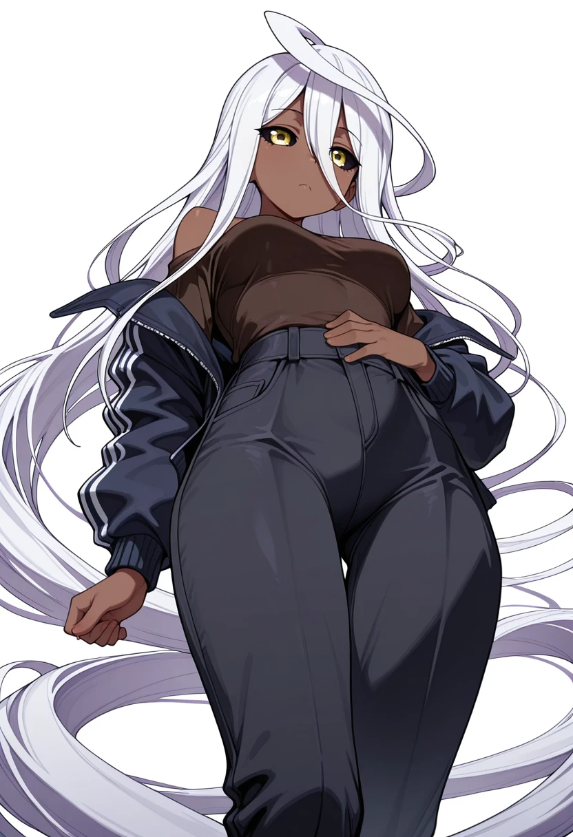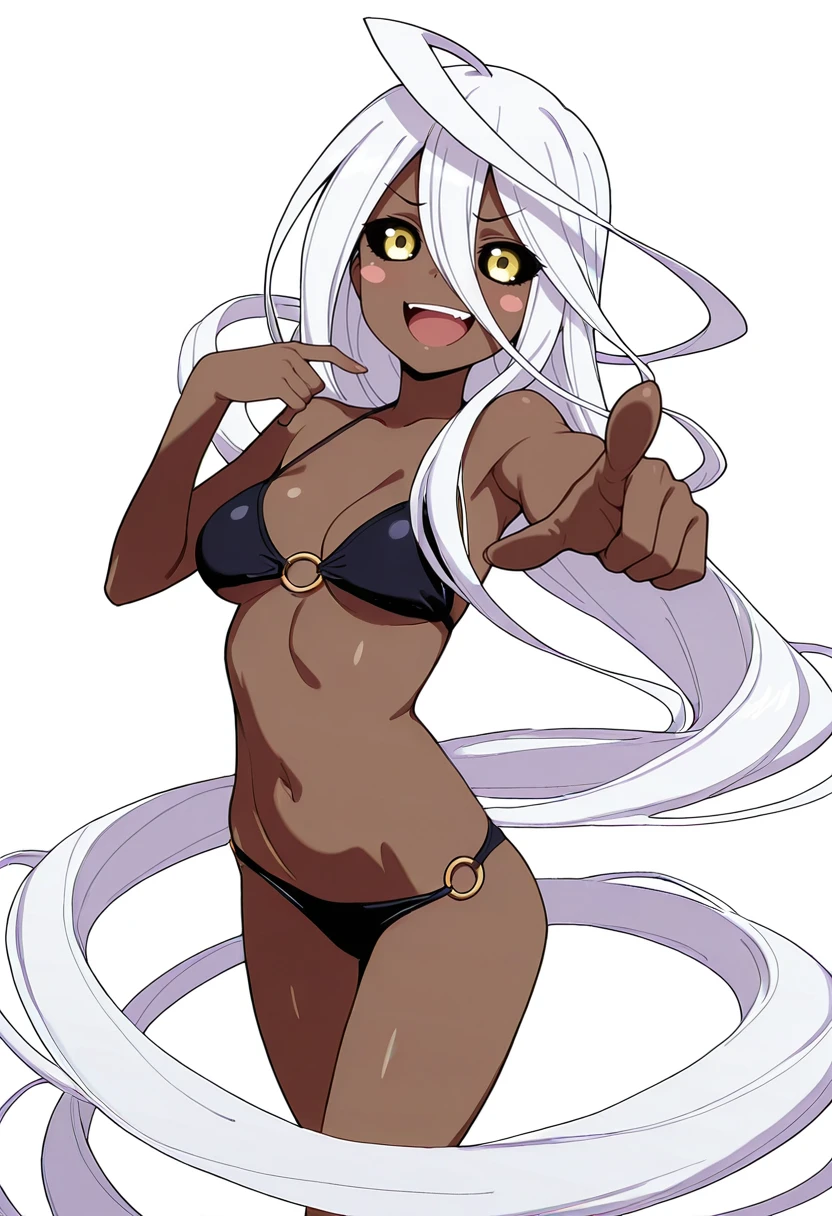 doppel_cnr, 1girl, dark-skinned female, absurdly long hair, prehensile hair, medium breasts, black sclera, yellow eyes, huge ahoge, white hair,