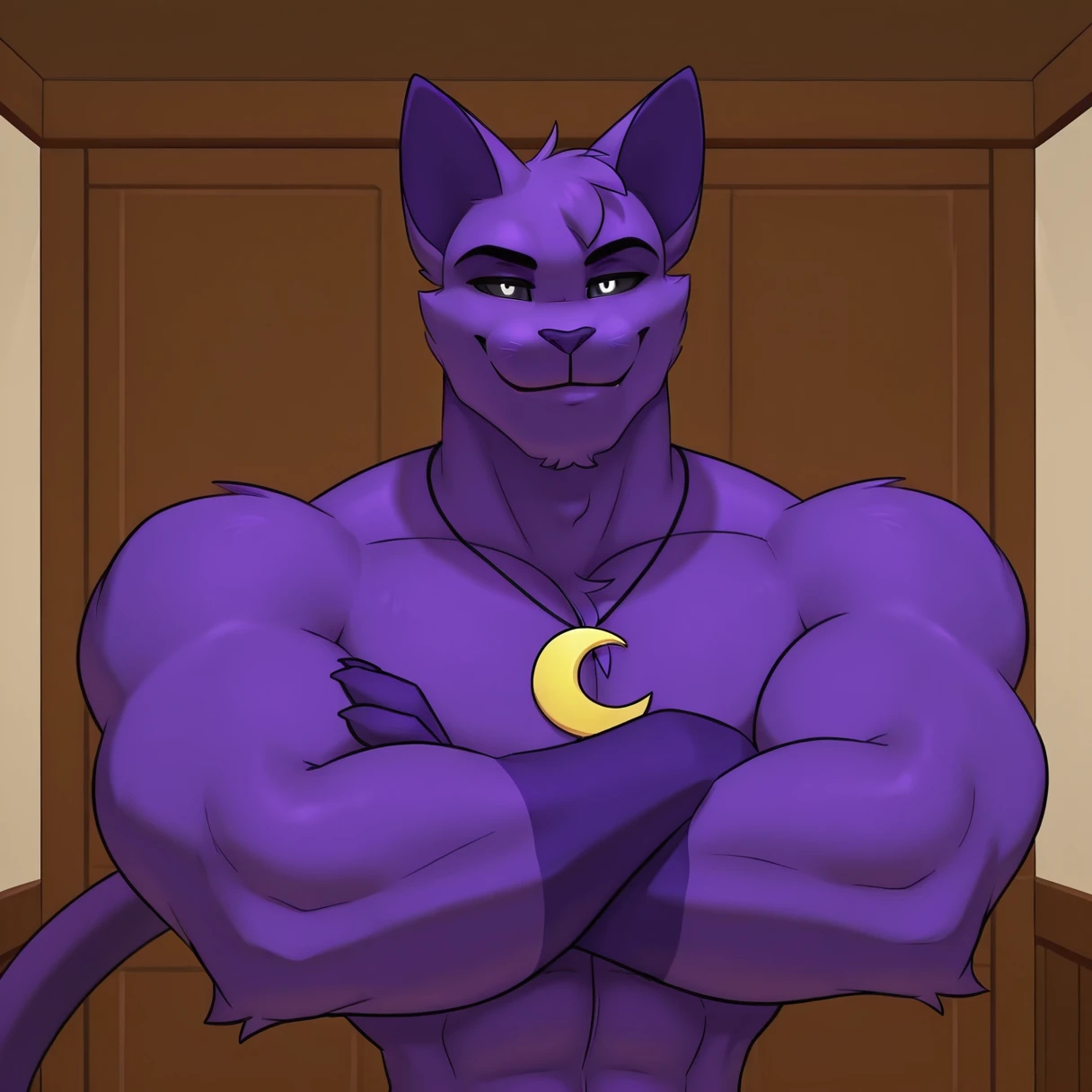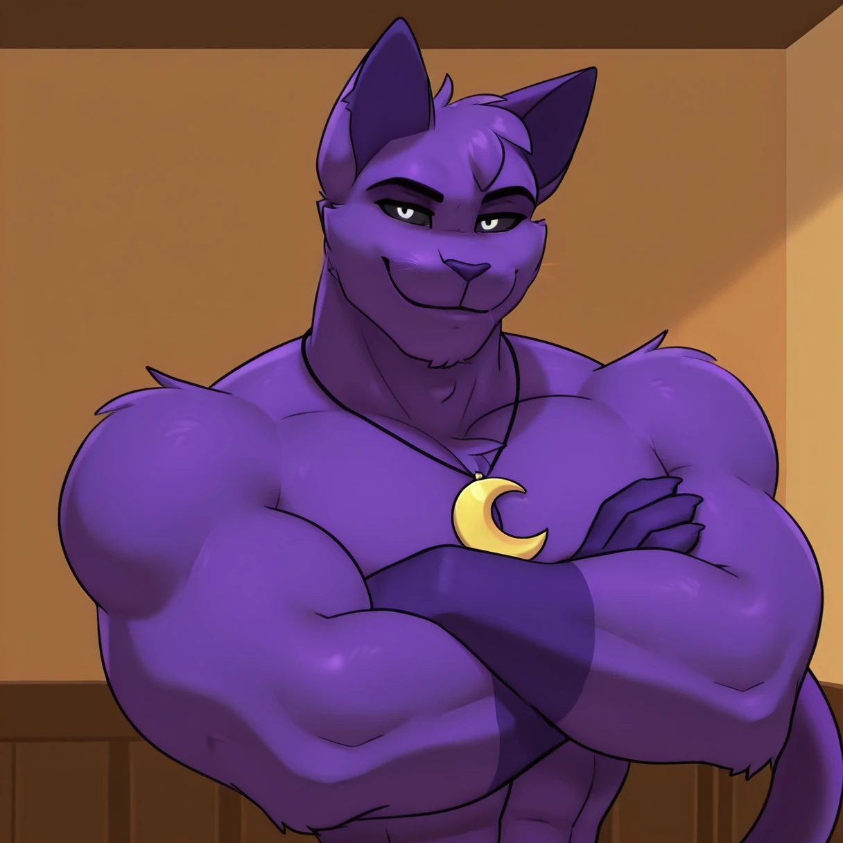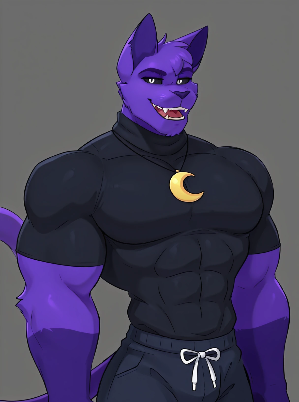 furry, anthro, cat, purple body, purple fur, black sclera, white eyes, long tail, yellow crescent necklace