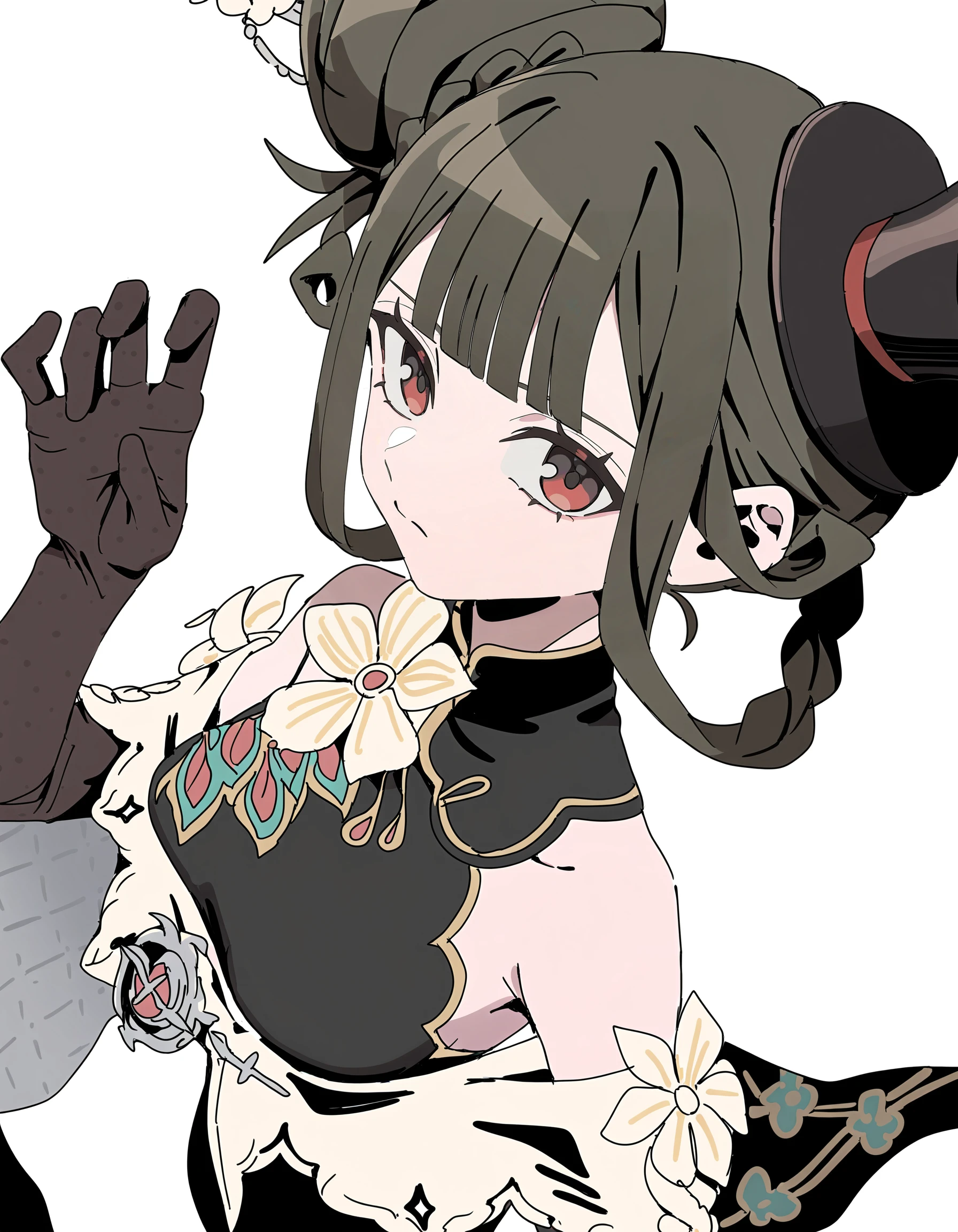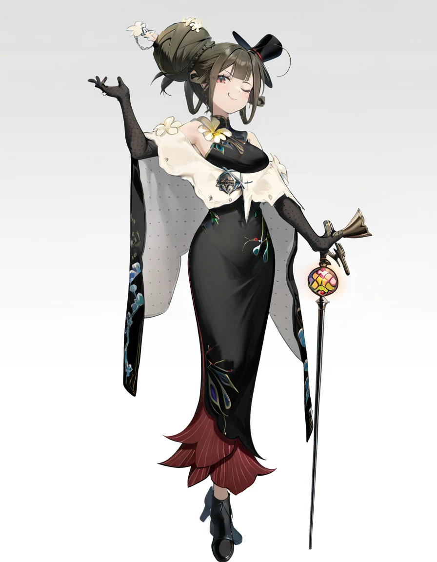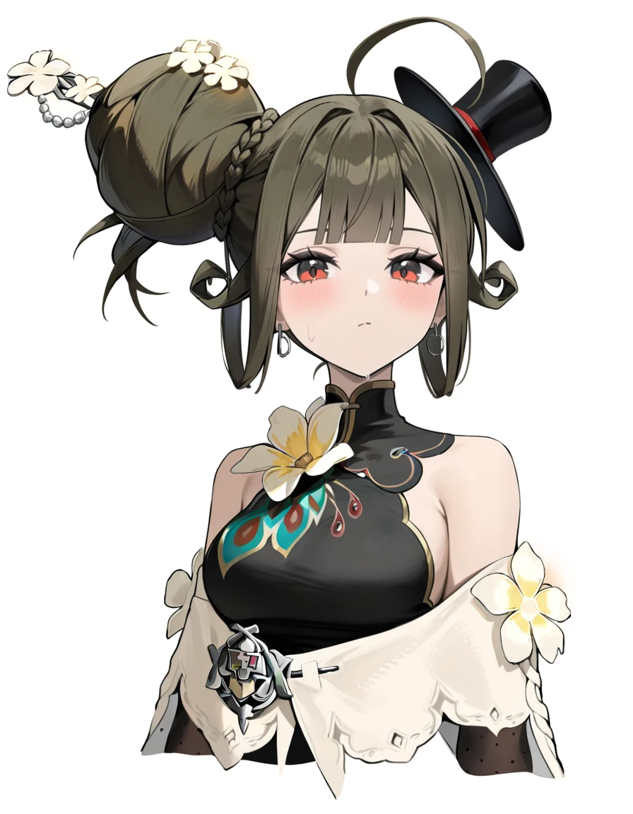 xytx-liqing,1girl,solo,red eyes,brown hair,hair bun,braid,breasts,flower,dress,bare shoulders,sleeveless,black dress,gloves,elbow gloves,black gloves,hat,black headwear,Description