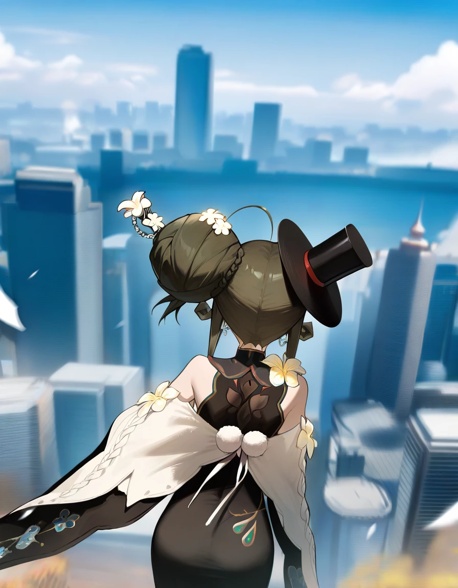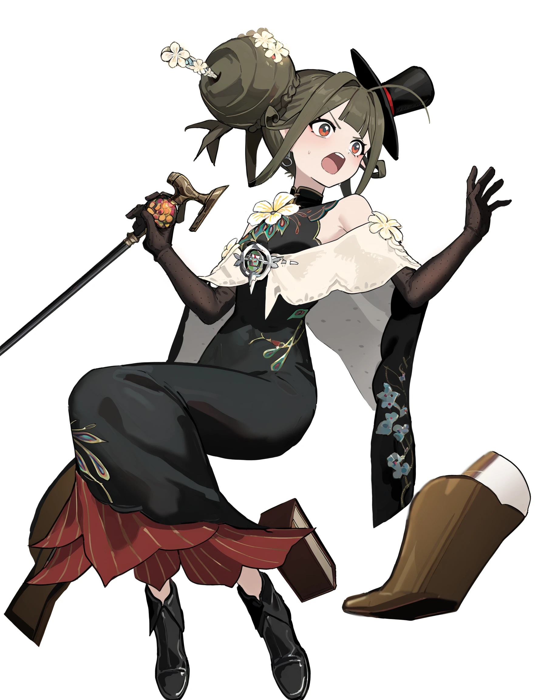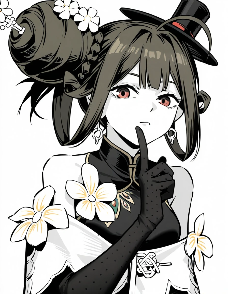 xytx-liqing,1girl,solo,red eyes,brown hair,hair bun,braid,breasts,flower,dress,bare shoulders,sleeveless,black dress,gloves,elbow gloves,black gloves,hat,black headwear,Description