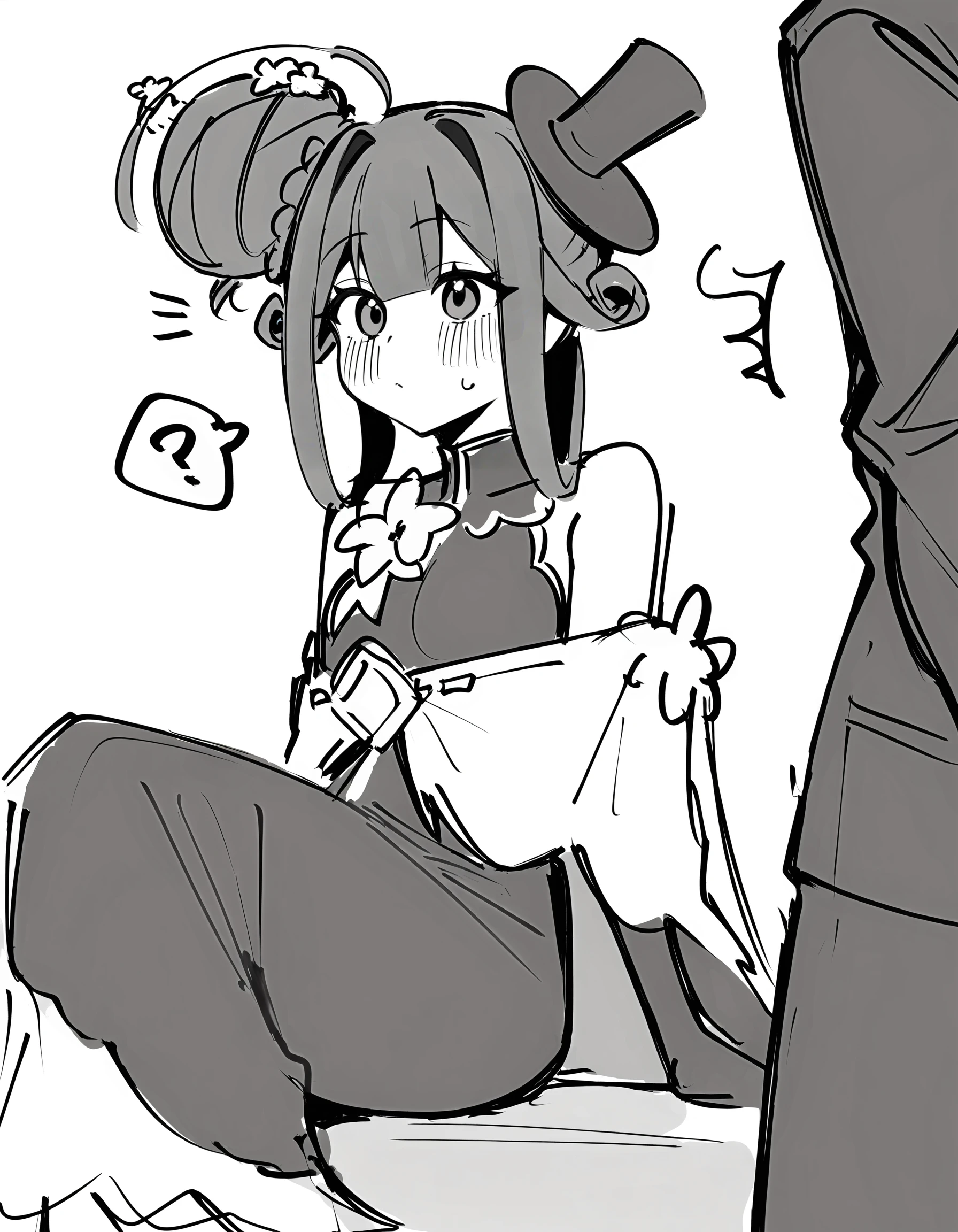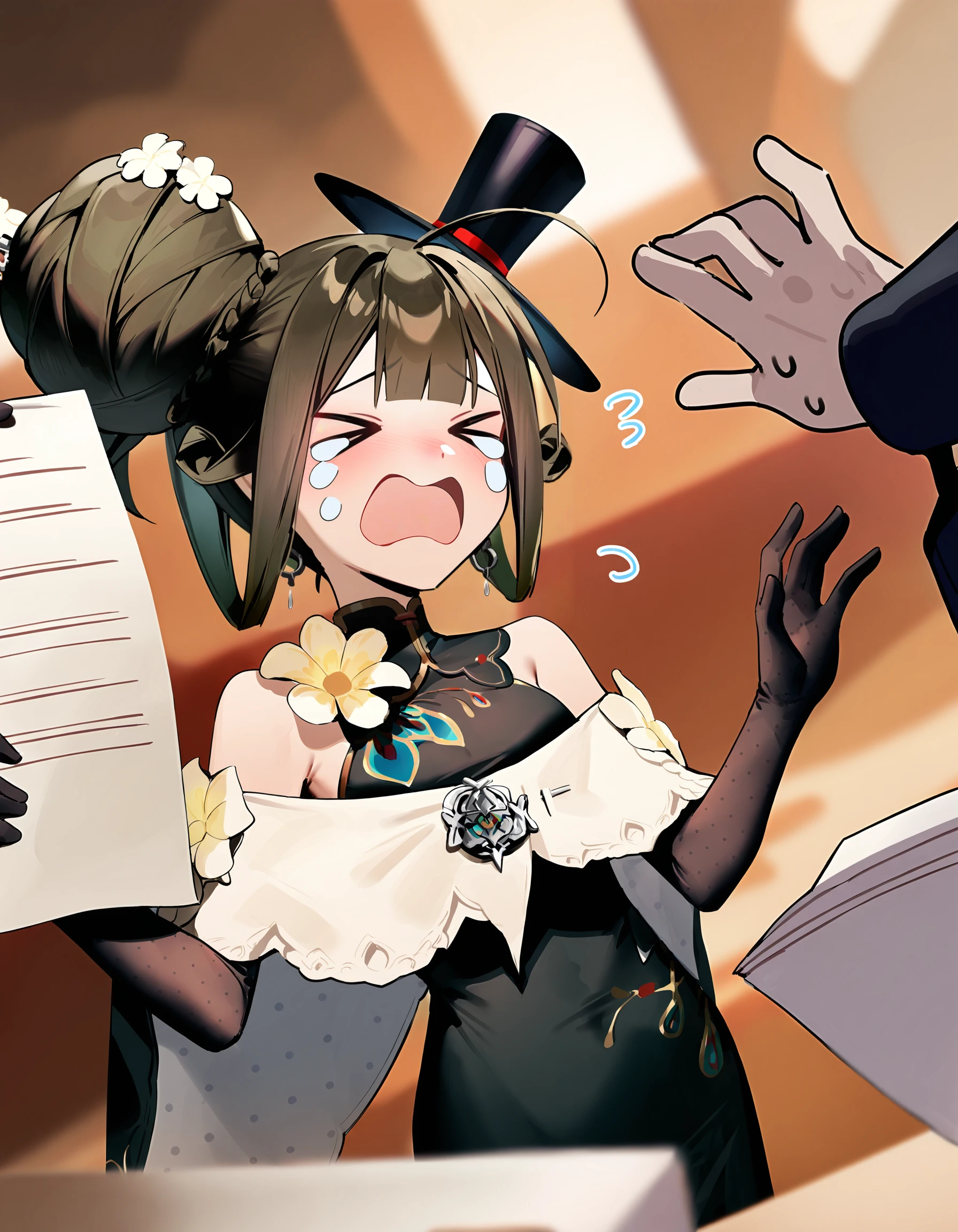 xytx-liqing,1girl,solo,red eyes,brown hair,hair bun,braid,breasts,flower,dress,bare shoulders,sleeveless,black dress,gloves,elbow gloves,black gloves,hat,black headwear,Translate using ChatGPT: