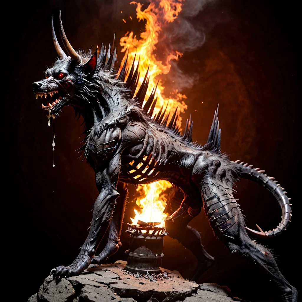 Hellhound, transformation, spikes, claws, horns, demon hound, hell fire,