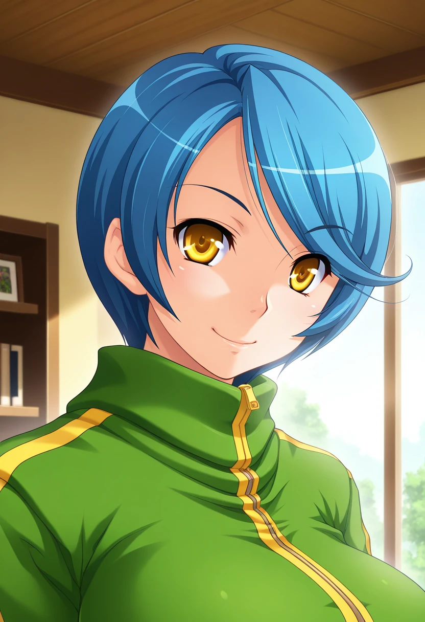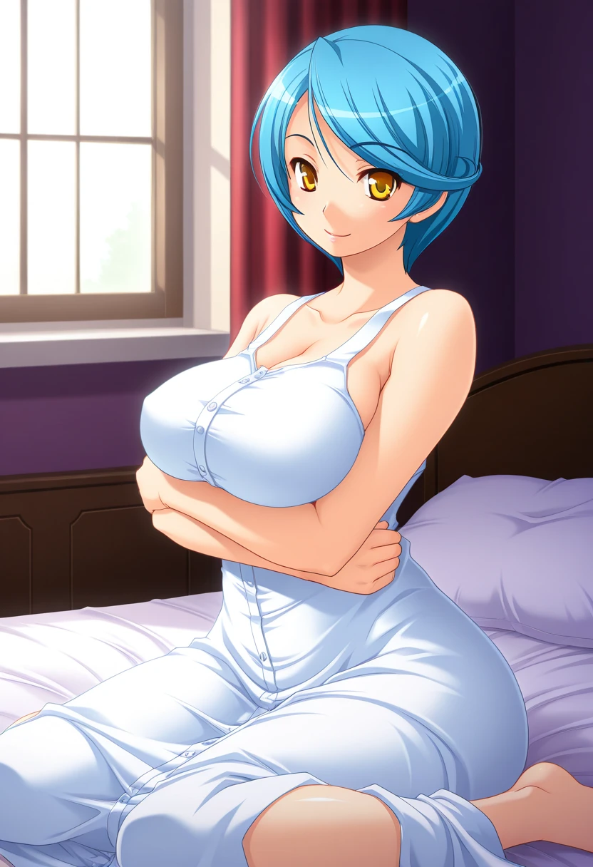 serenaww, mature female, yellow eyes, blue hair, short hair, swept bangs, large breasts,