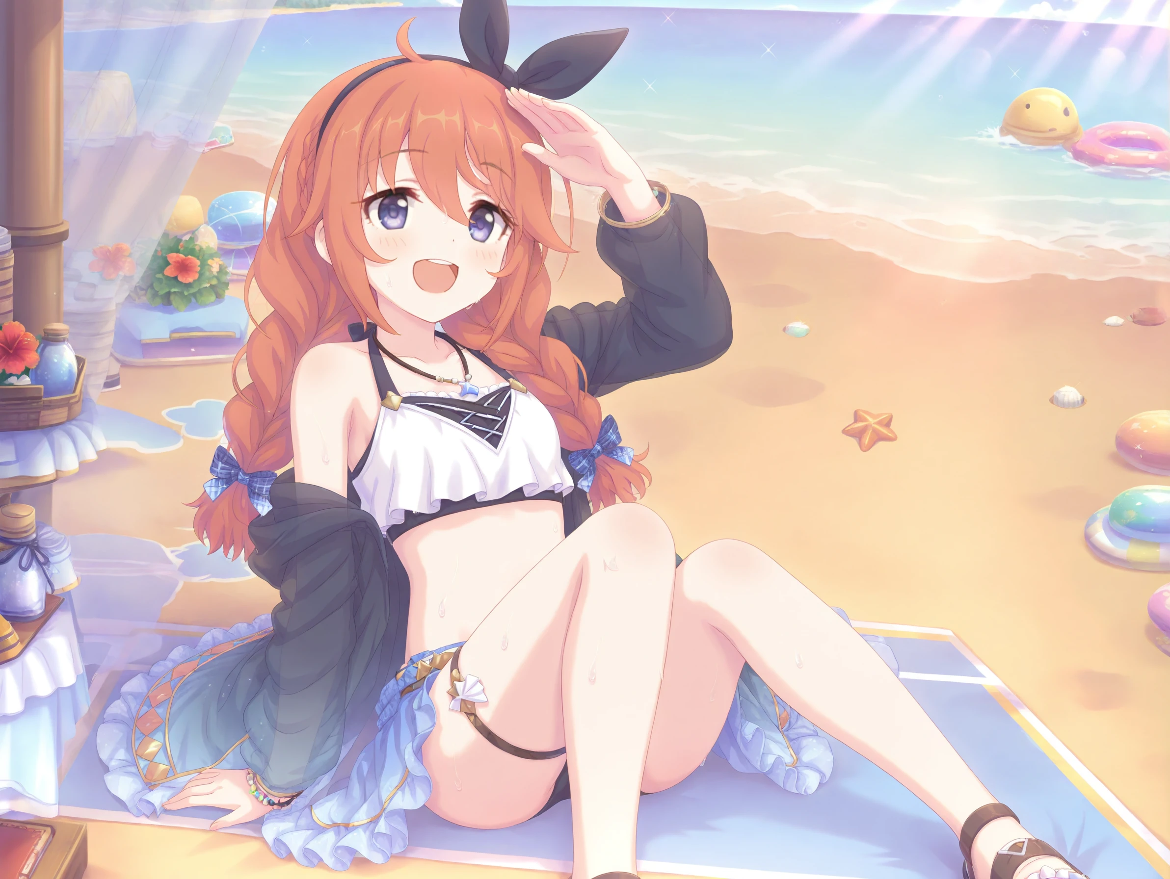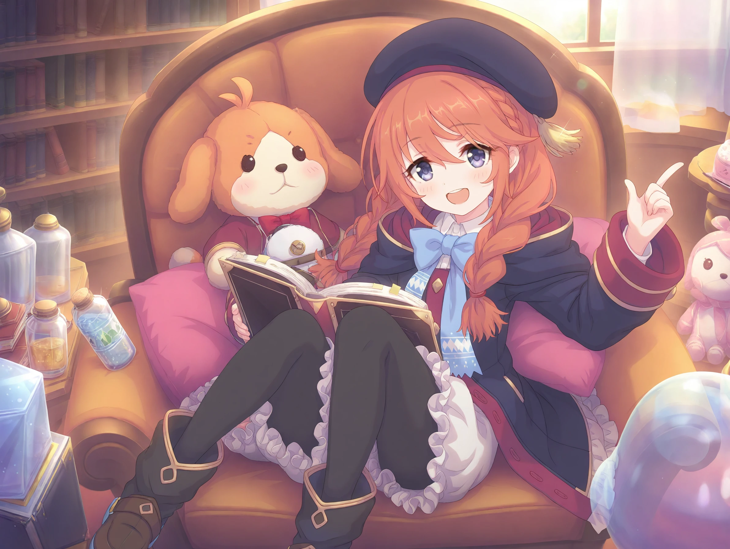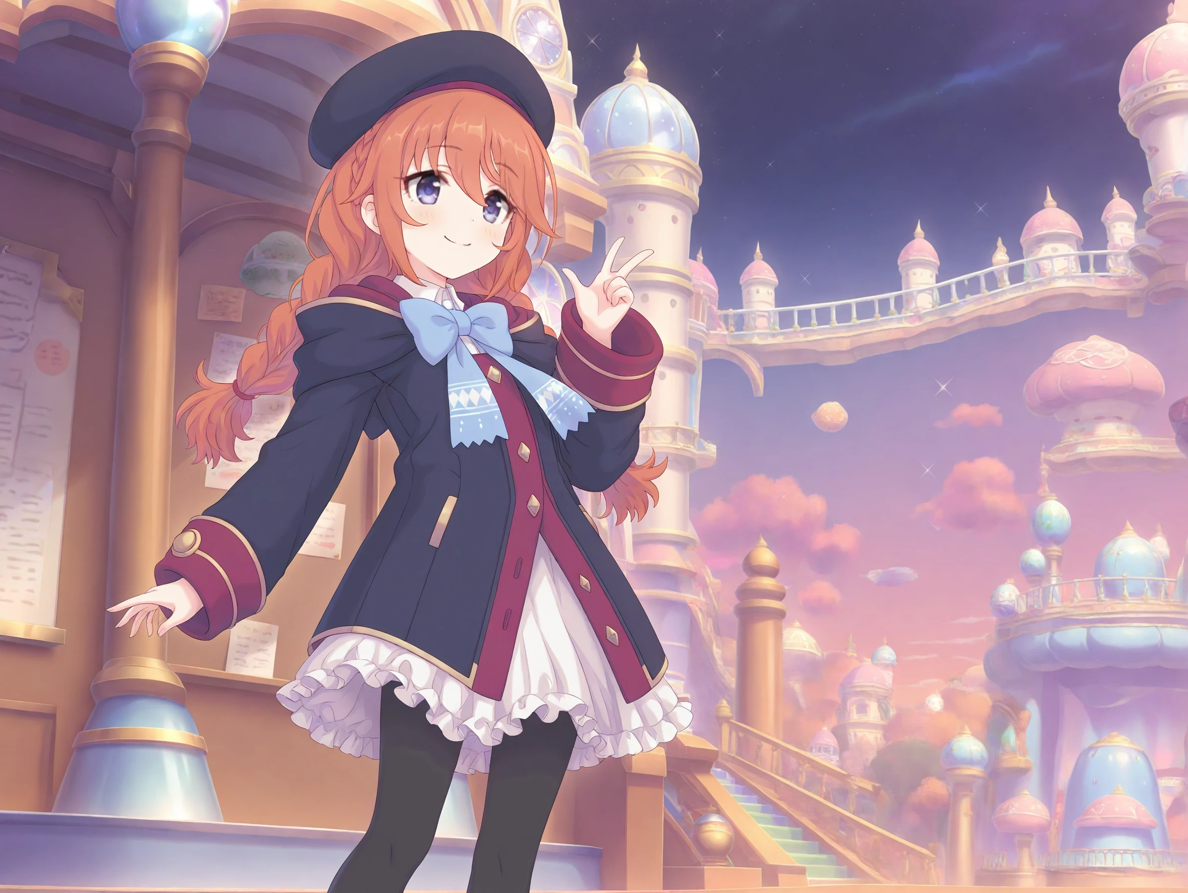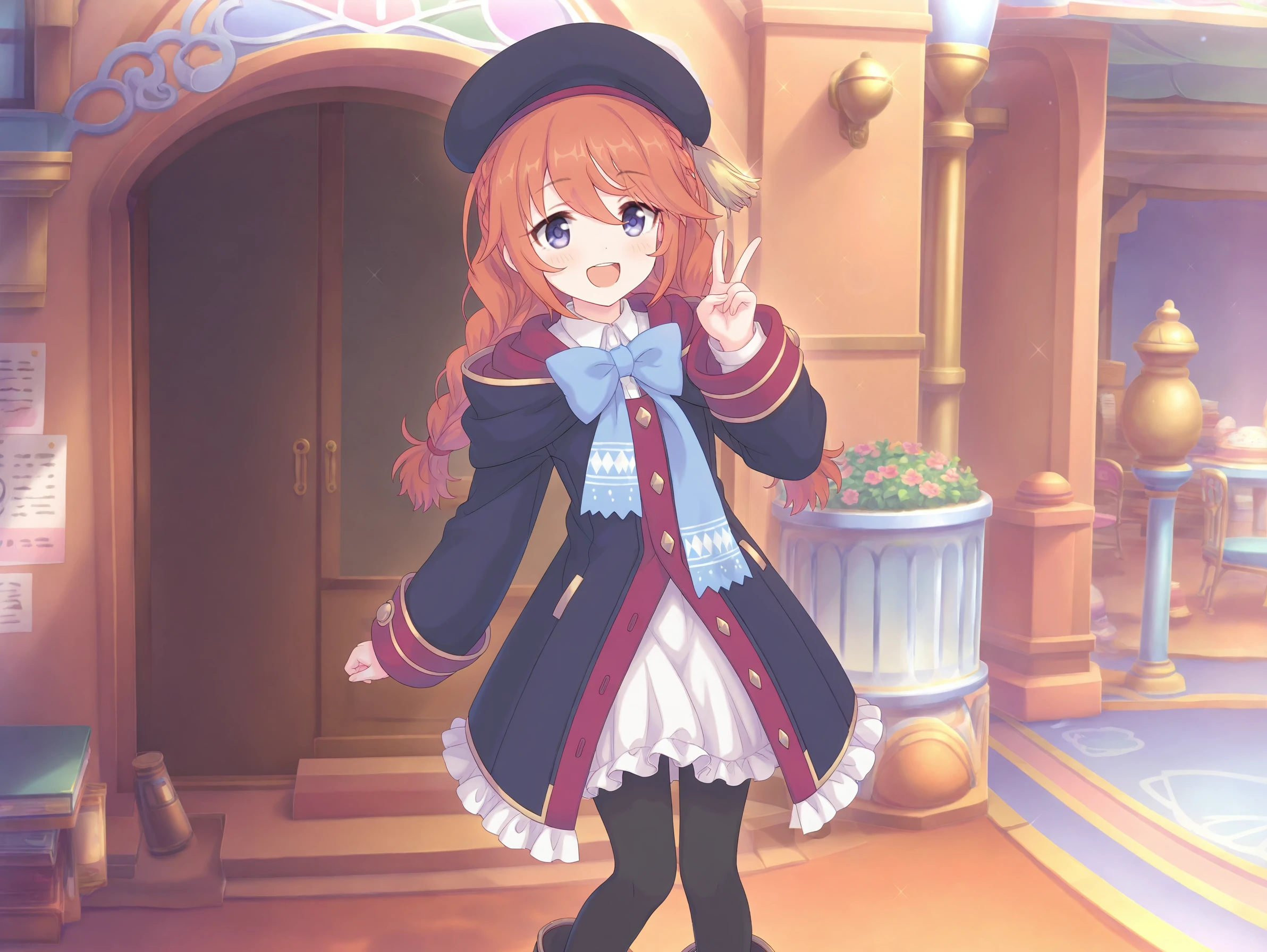 official style,<lora:Yuni54??:0.9>,yuni \(princess connect!\),1girl,st. theresa's girls academy school uniform,solo,beret,hooded coat,pantyhose,long hair,braid,blue bow,twin braids,brown footwear,black headwear,white dress,dress,boots,black coat,black pantyhose,long sleeves,frilled dress,blue eyes,brown hair,orange hair,blush,:d,