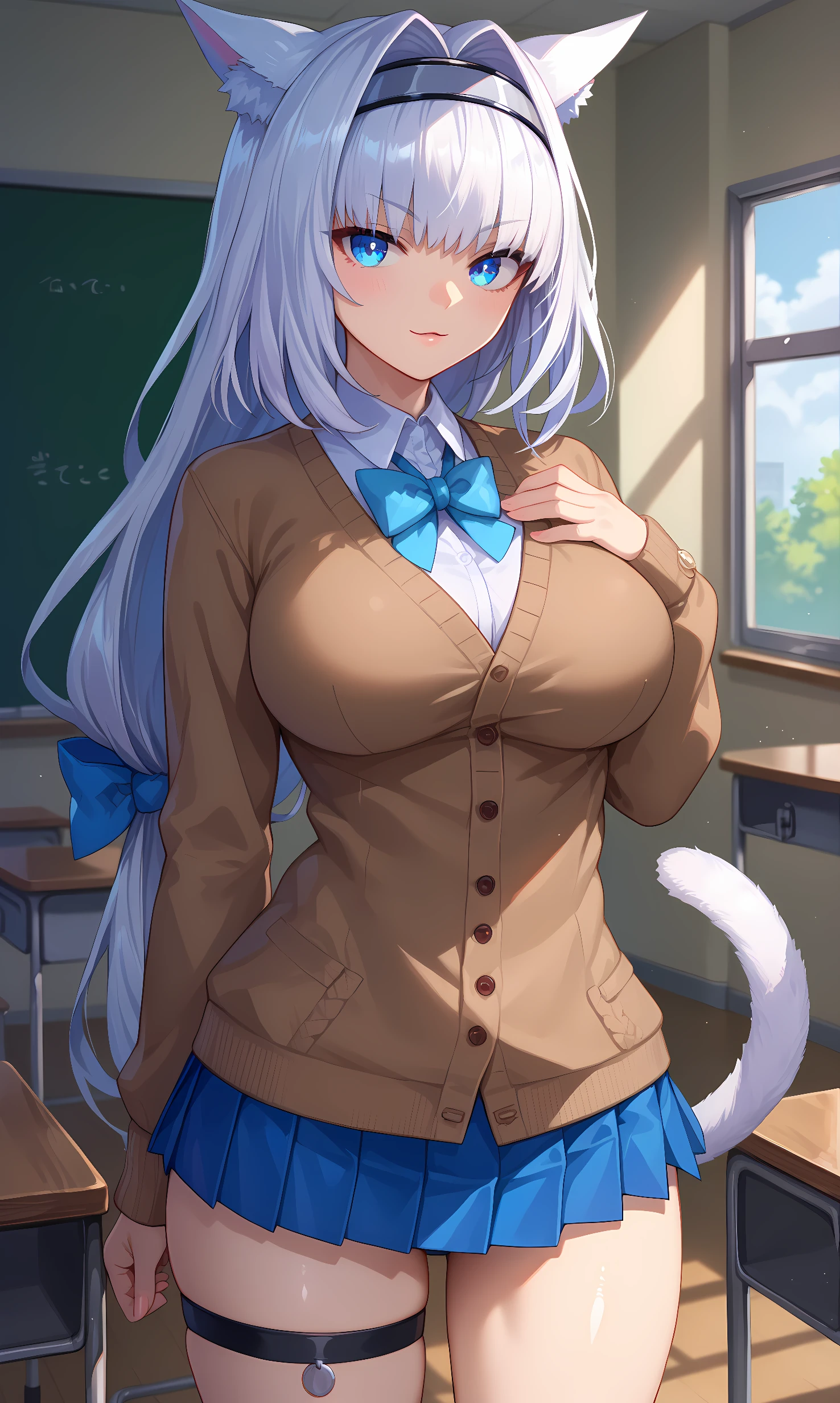 dobrynya_nikitich, blue eyes, white hair, low tied long hair, metal hairband, cat ears, cat tail, blue bow, hair bow