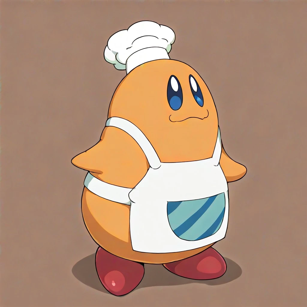 chef kawasaki, orange body, oval eyes, black/blue eyes, red/purple feet, chef hat, apron, :3