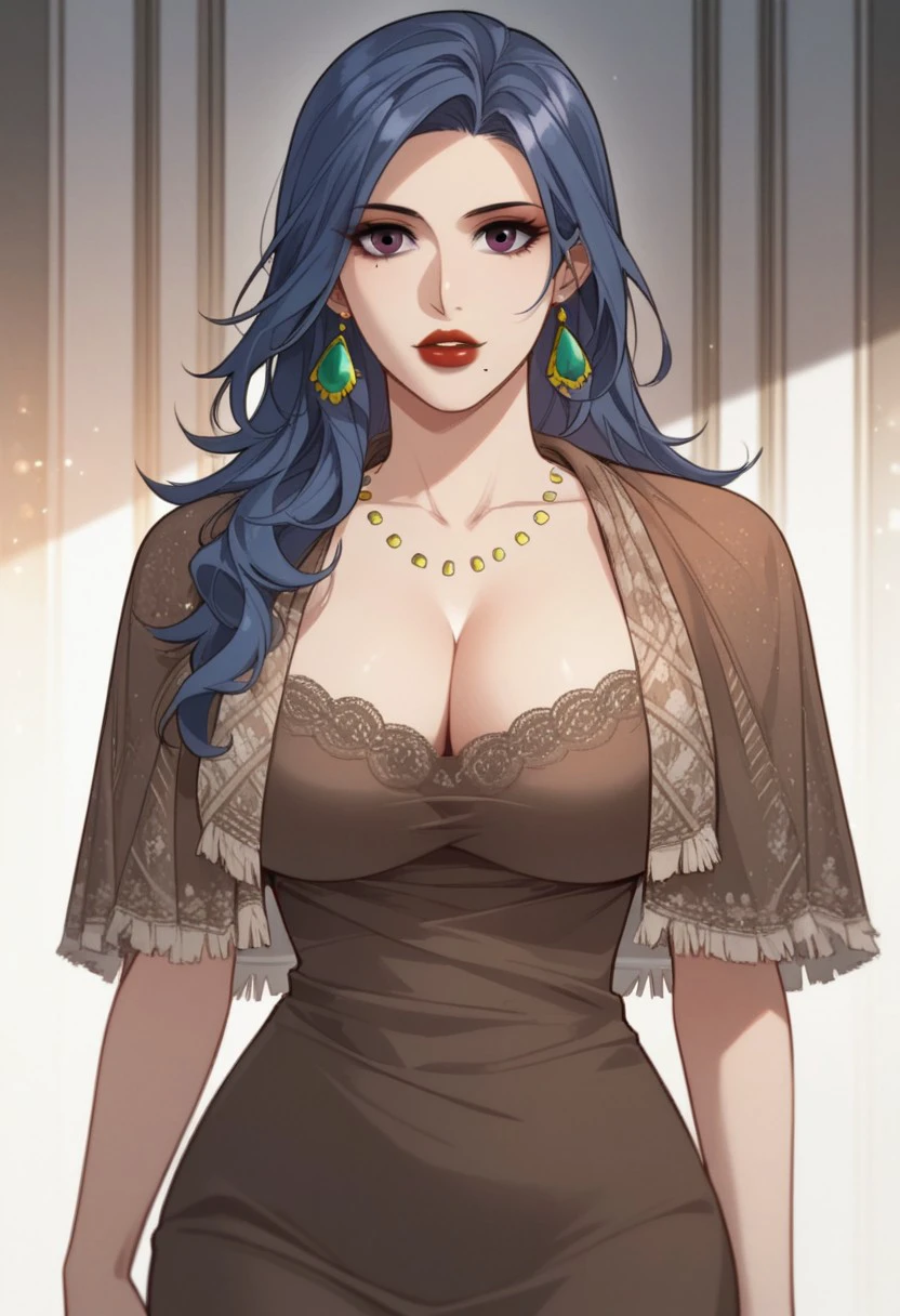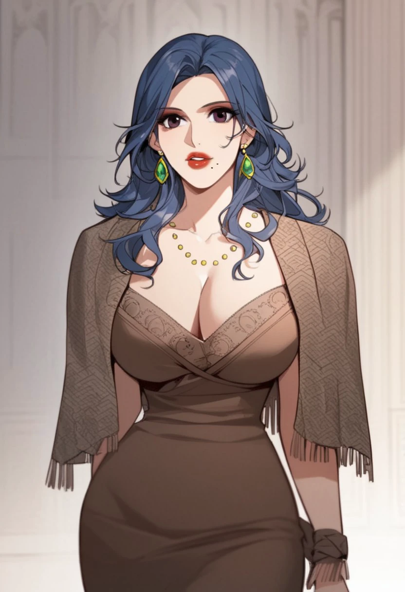 earrings, pearl necklace, cleavage, brown shawl, brown dress, brown skirt,