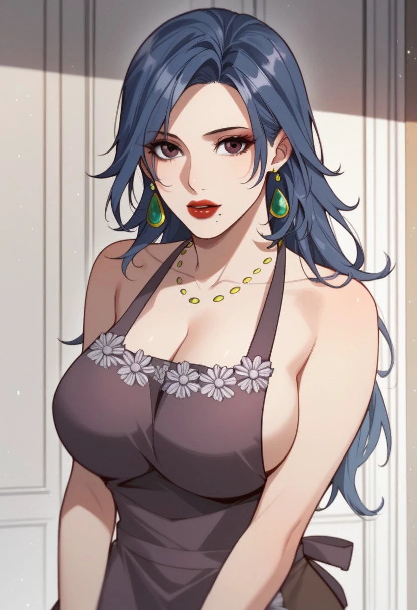 earrings, pearl necklace, cleavage, bare shoulders, purple apron, brown dress,