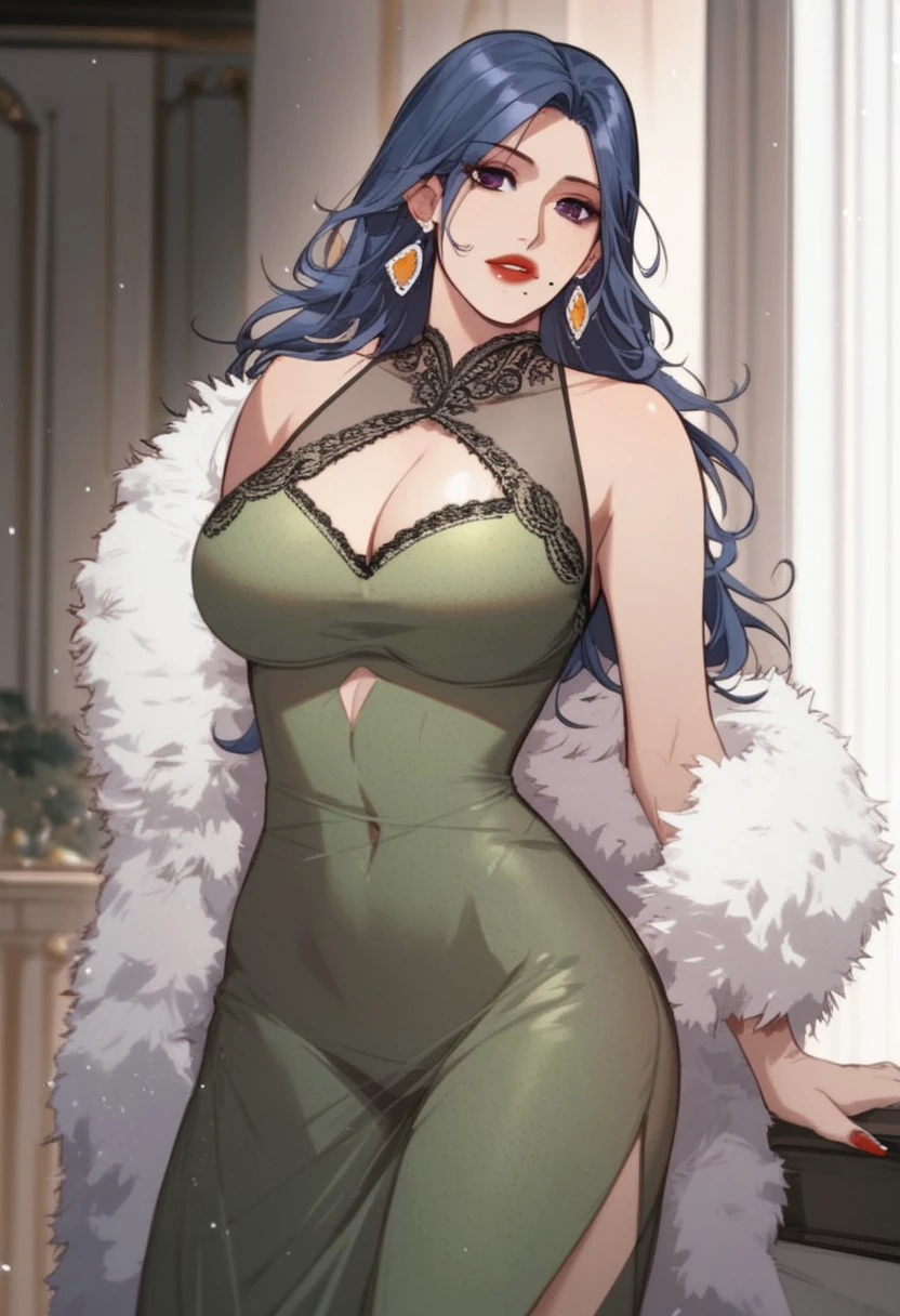 earrings, feather boa, see-through, cleavage cutout, green dress, long dress, side slit,