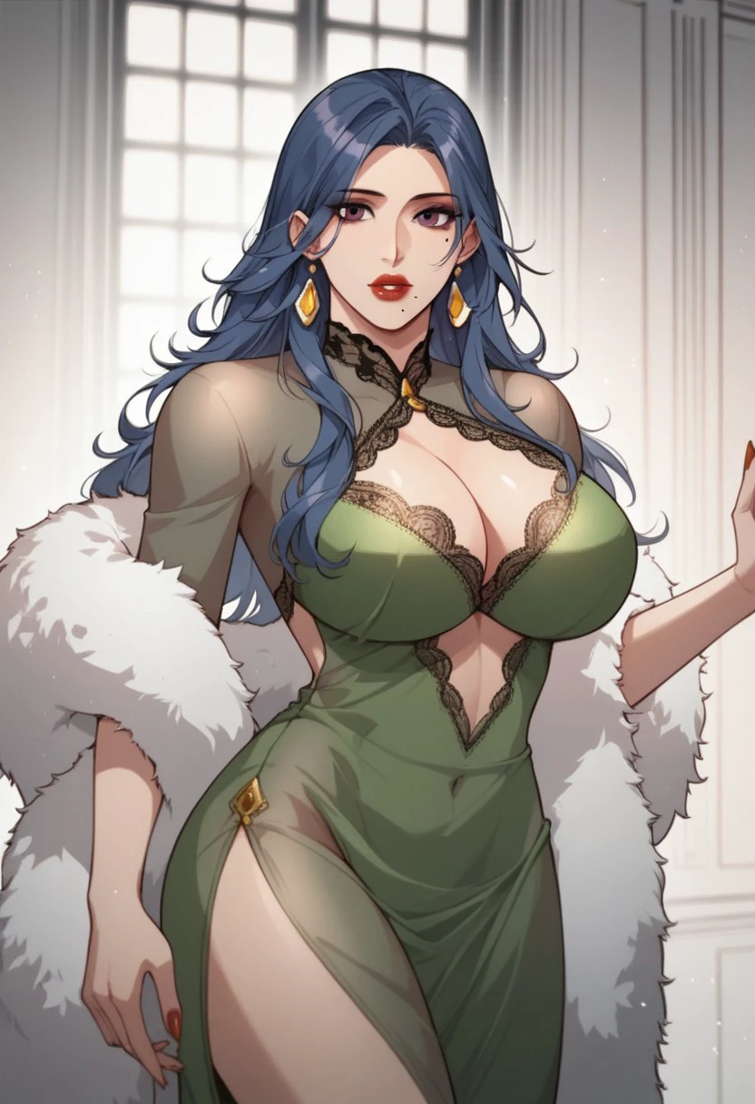long hair, blue hair, purple eyes, large breasts, mole under mouth,