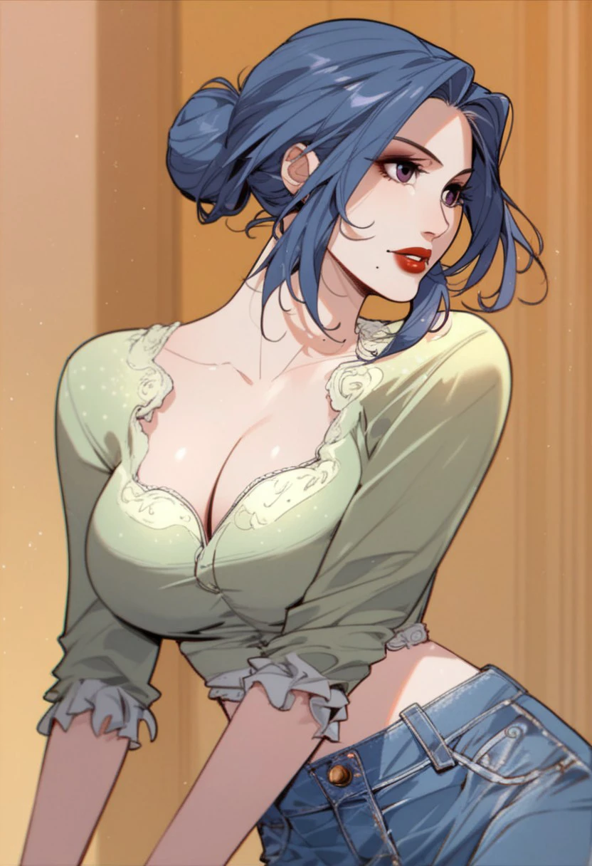 single hair bun, cleavage, green shirt, midriff, jeans,