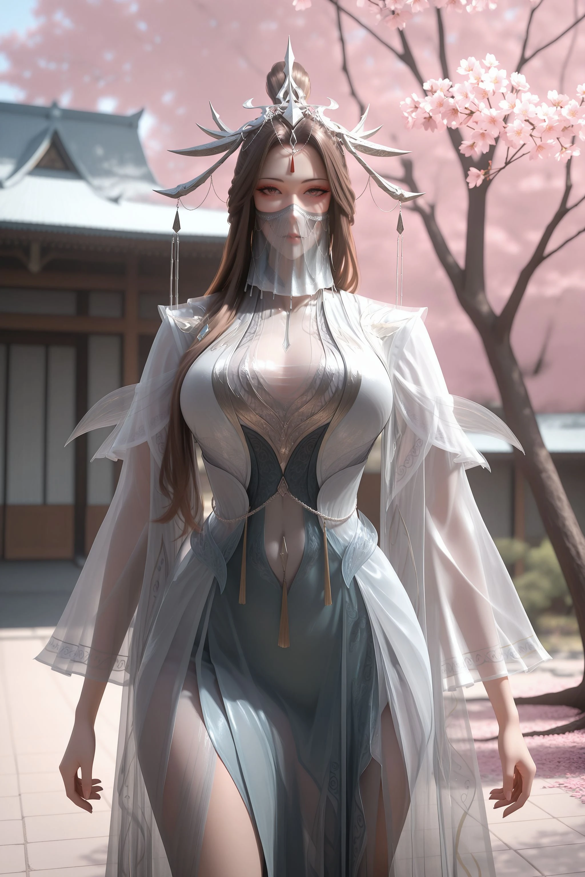 1girl, solo, veil, long hair, mouth veil, dress, brown hair, hair ornament, see-through