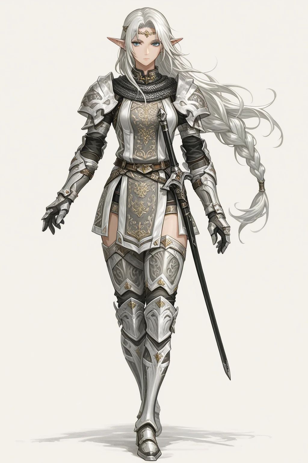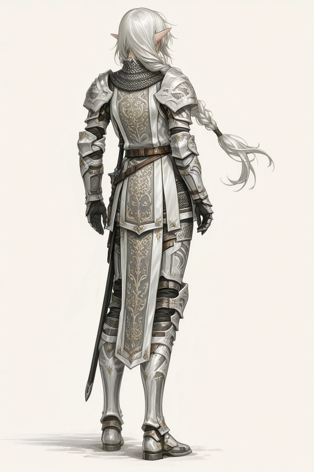 white armor, full armor, pauldrons, white tabard, elbow guards, gauntlets, chainmail, patterned clothes, belt, scabbard, sheathed sword, cuisses, armored boots, white clothes, black trim, black shirt, gold patterns, (no cape, no pelvic curtain:1.4), Note