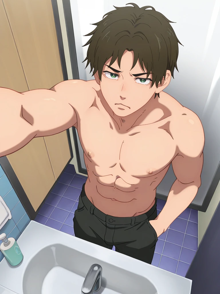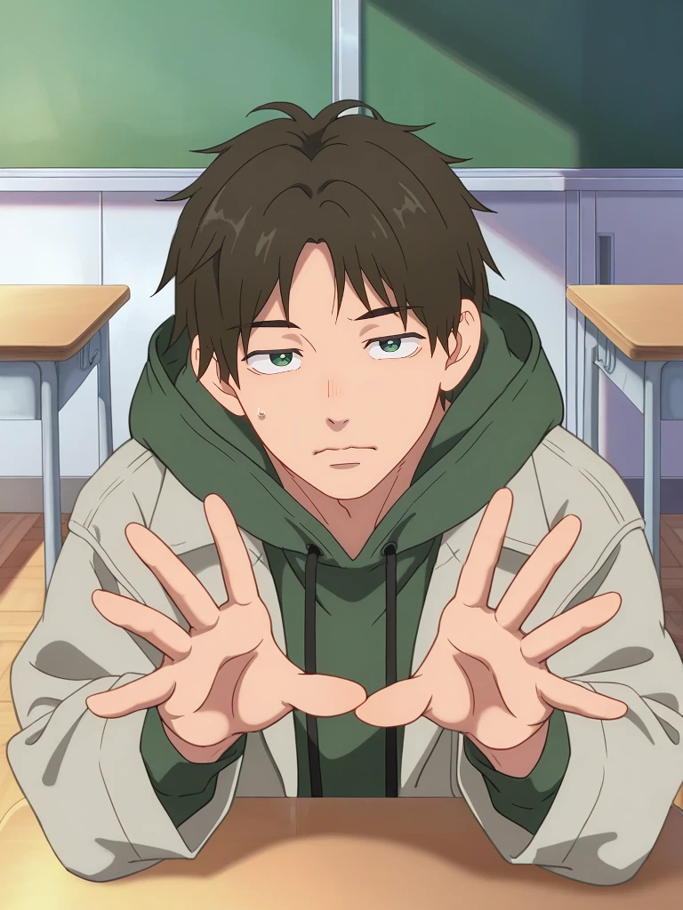 Prompt: oushioki, green eyes, brown hair