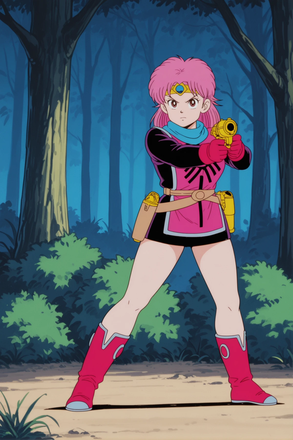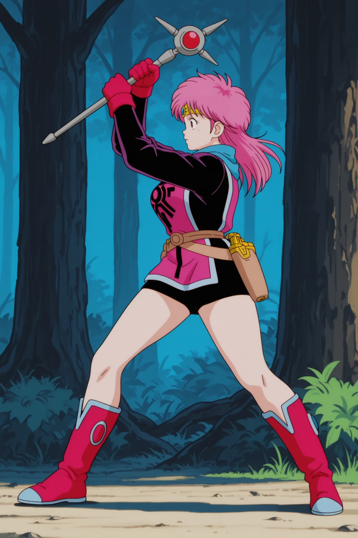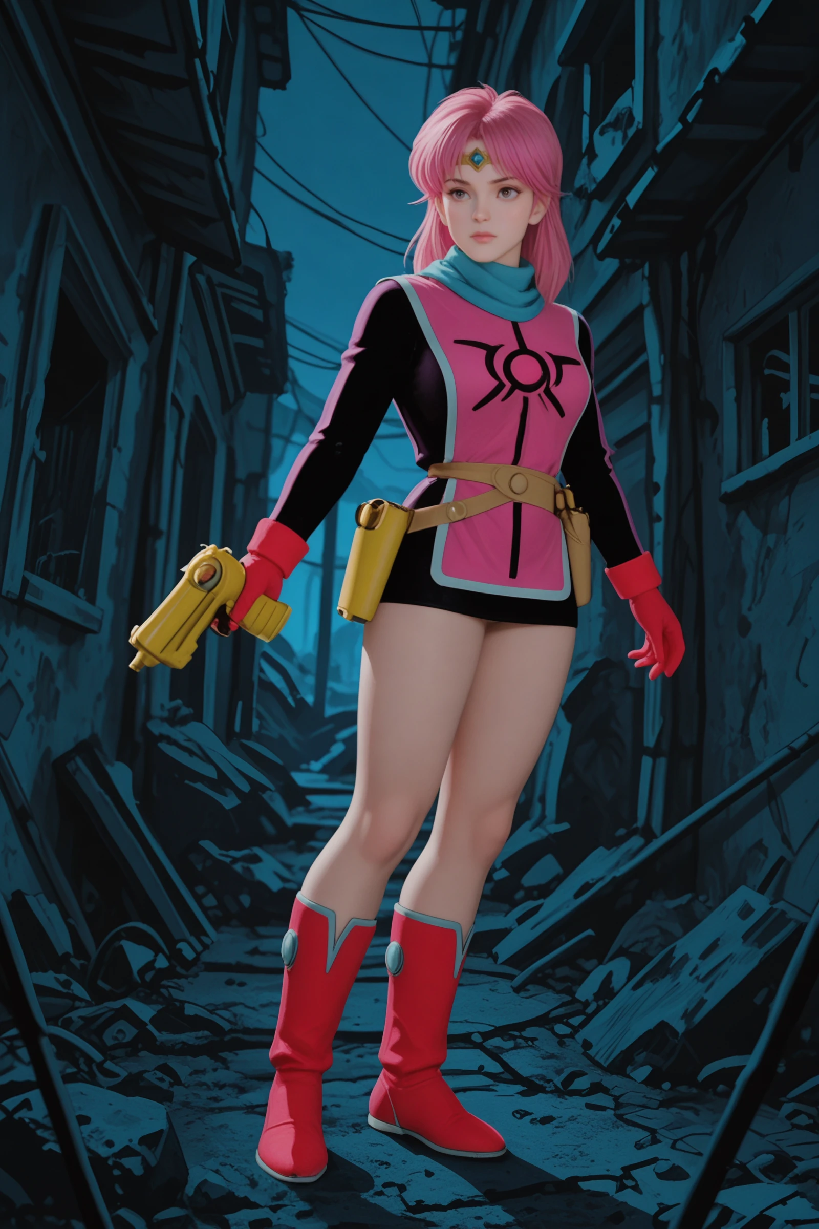 maam_papunika_ill, magik_gun, cross_staff, 1girl, retro artstyle, pink hair, big breasts, solo, long hair, gloves, 1980s (style), scarf, red gloves, 1990s (style), belt, long sleeves, boots, gem, tabard, town's ruins, night,