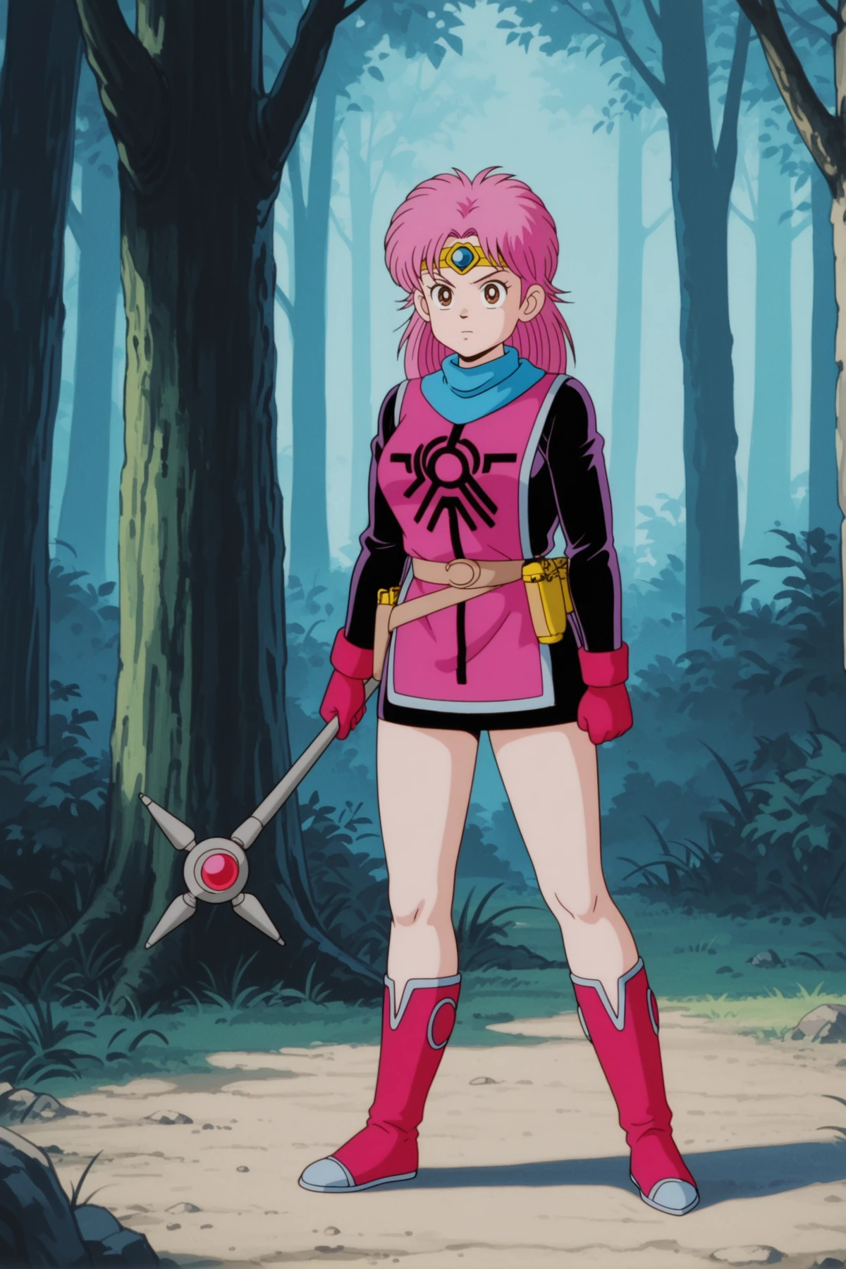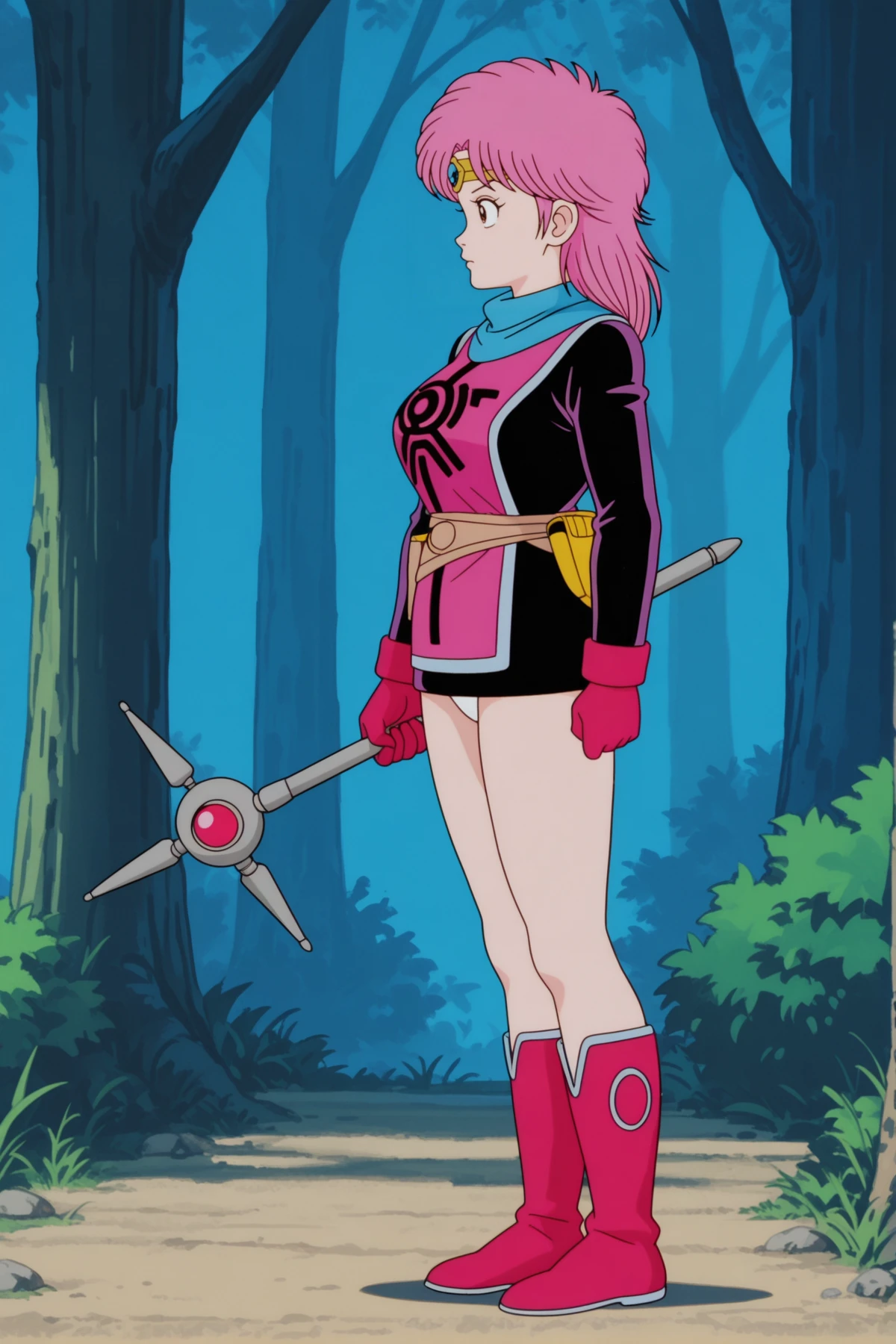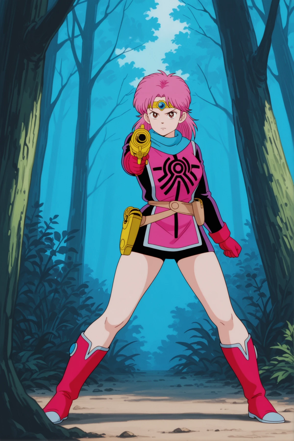 maam_papunika_ill, magik_gun, cross_staff, 1girl, retro artstyle, pink hair, big breasts, solo, long hair, gloves, 1980s (style), scarf, red gloves, 1990s (style), belt, long sleeves, boots, gem, tabard, town's ruins, night,
