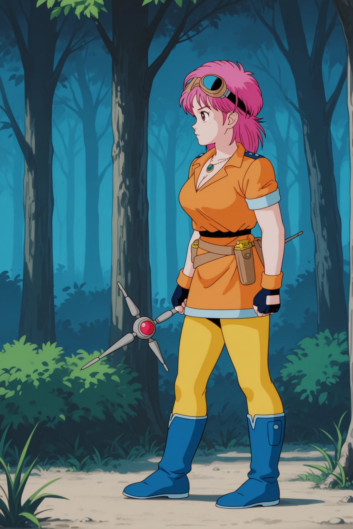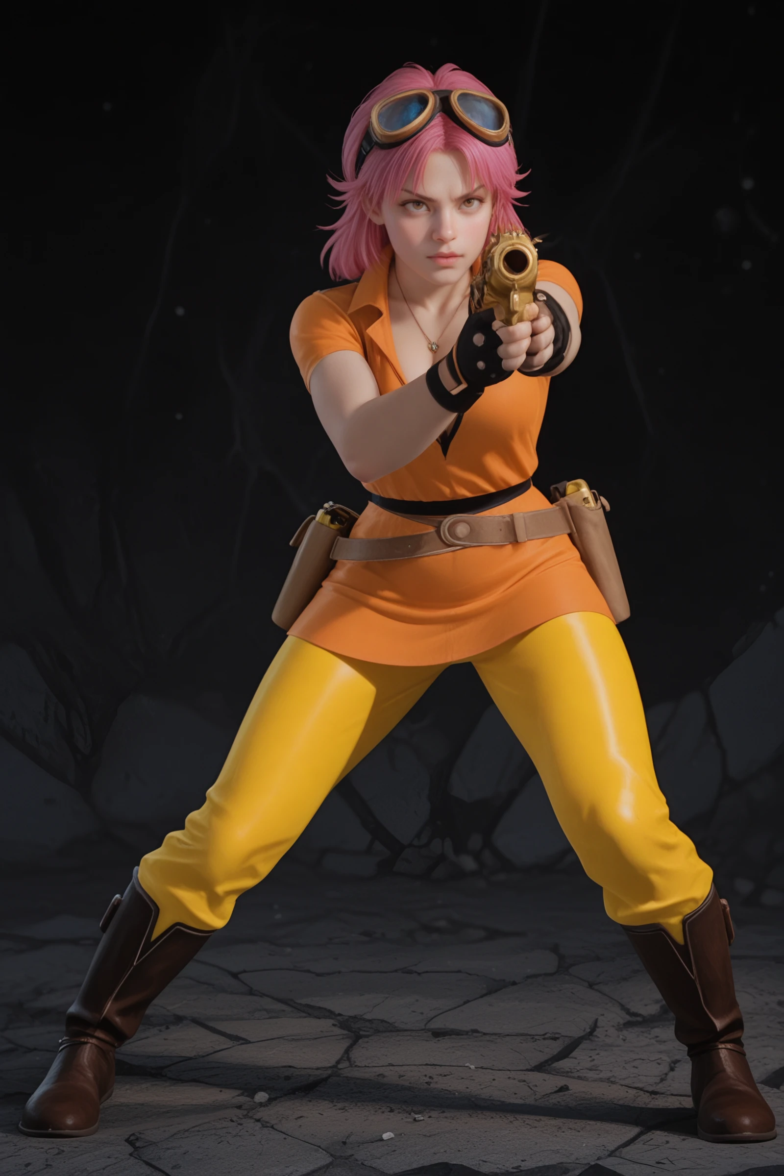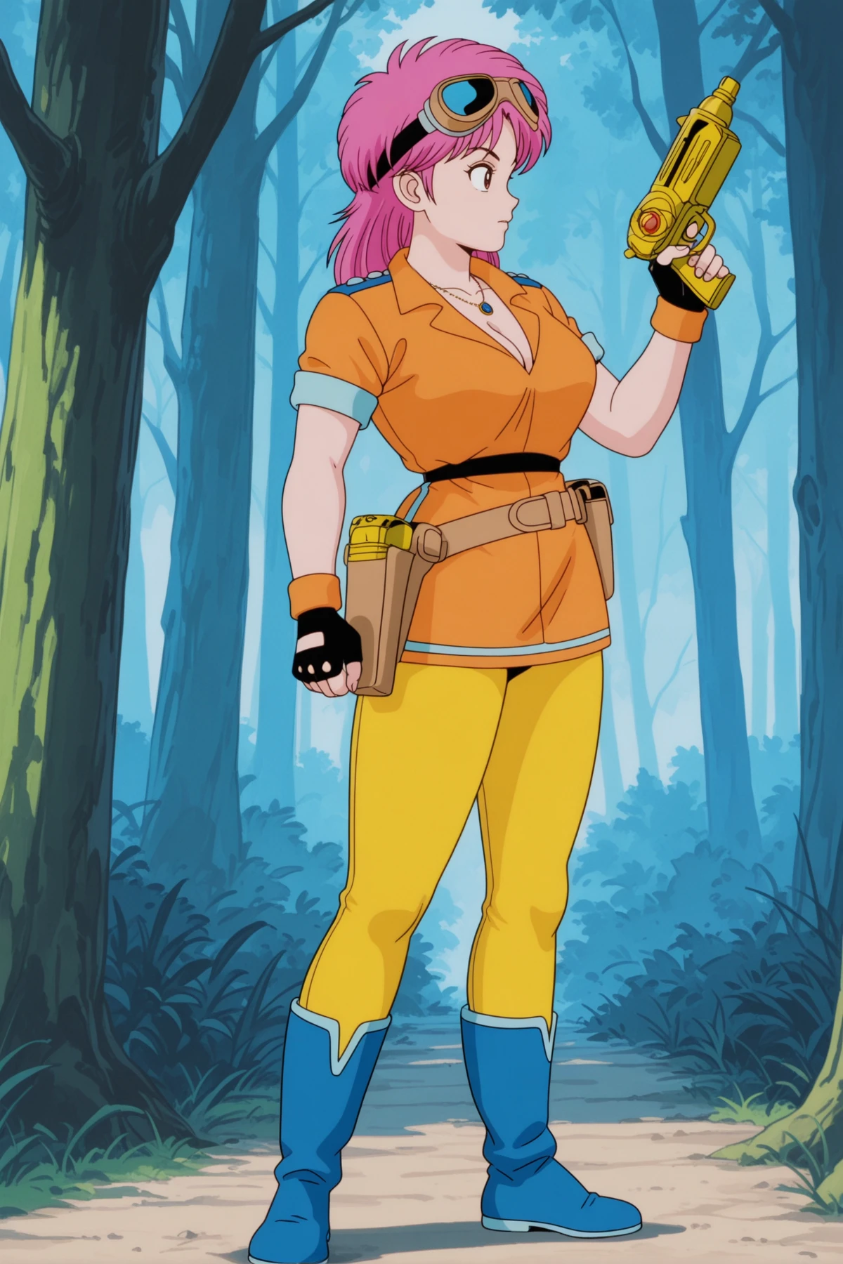 retro artstyle, maam_lomos_ill, magik_gun, goggles, cross_staff, goggles on head, boots, 1980s (style), fingerless gloves, yellow_pants, 1girl, pink hair, short hair, breasts, short sleeves, shirt, fingerless gloves, orange shirt, jewelry, belt, necklace, cleavage, orange skirt, big breasts,
