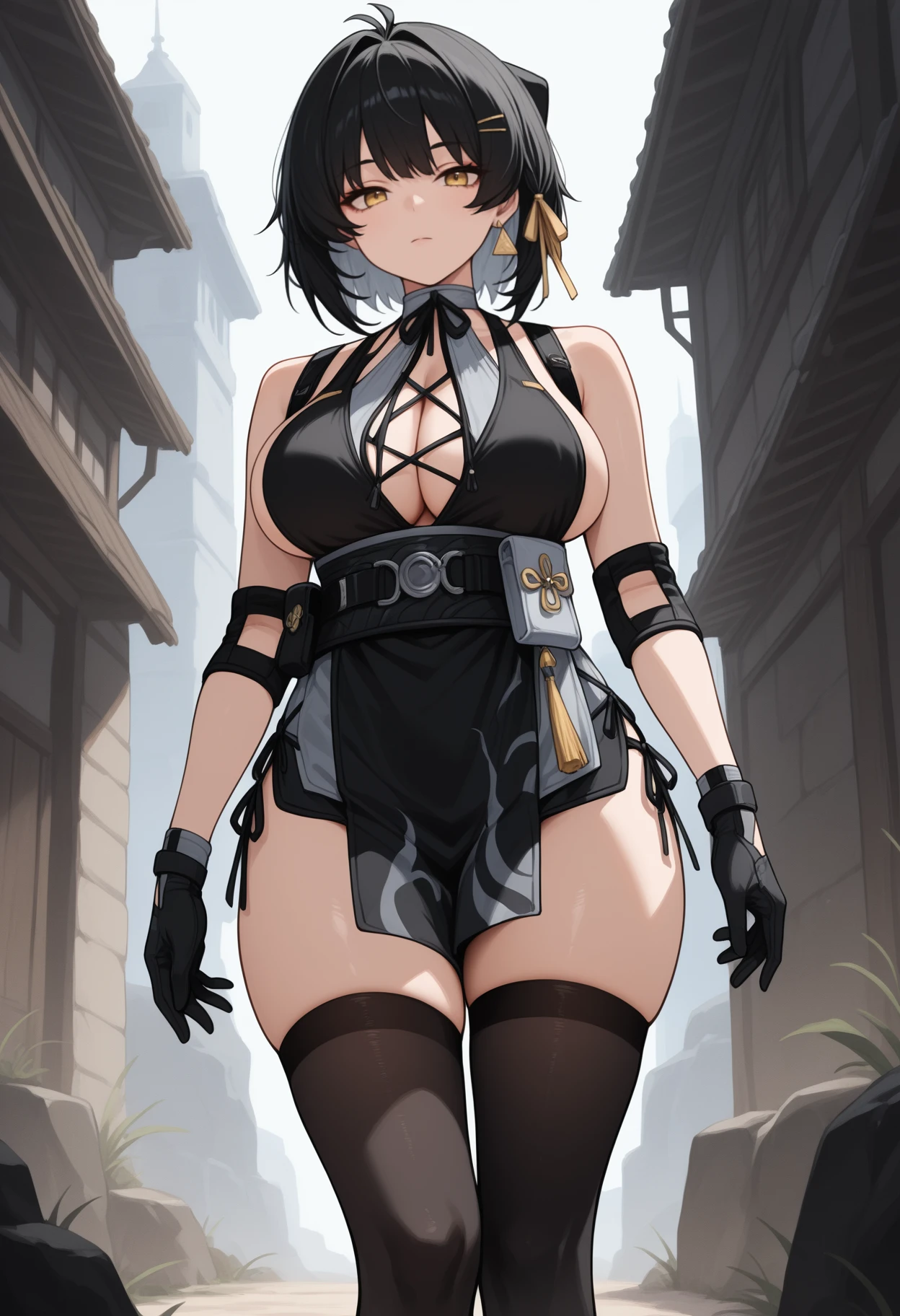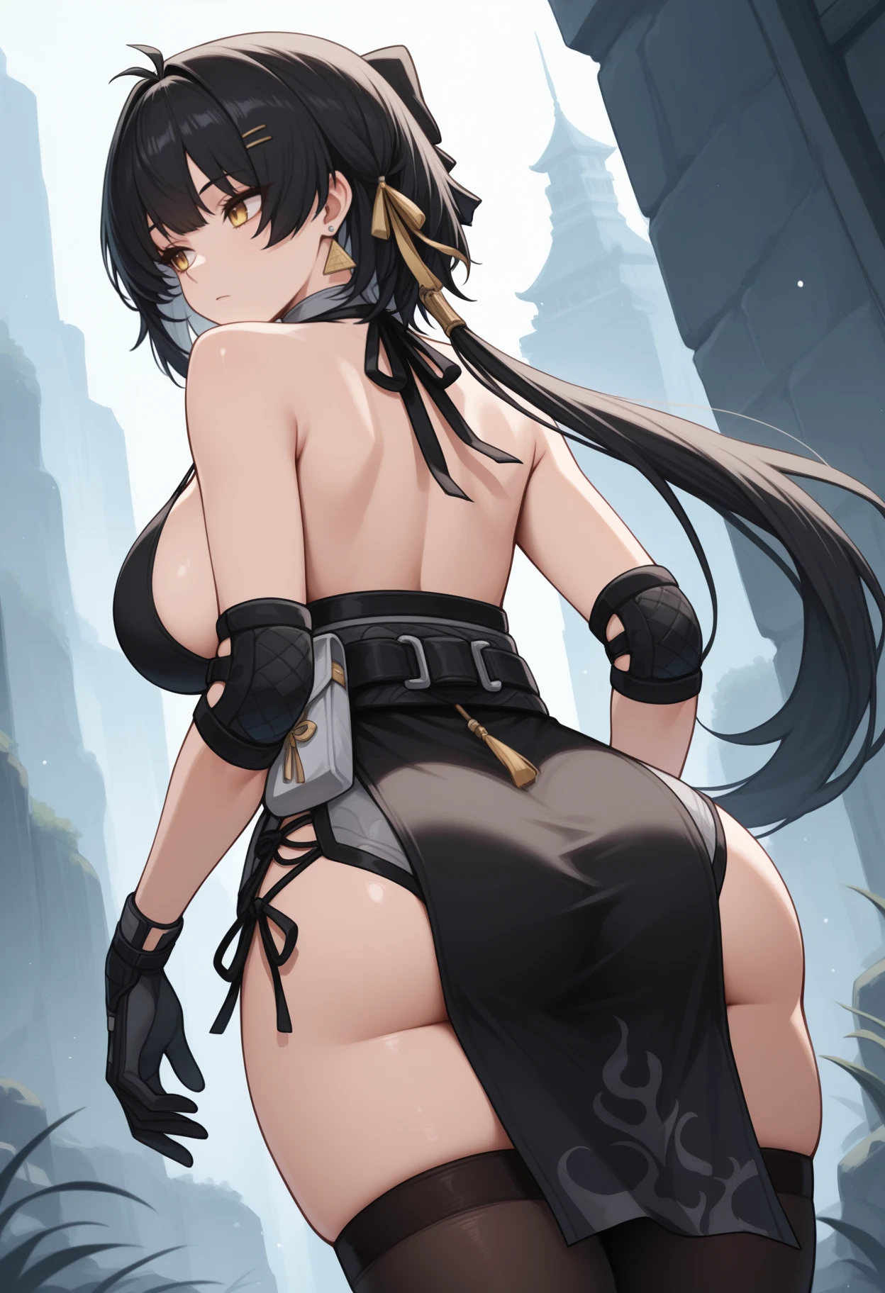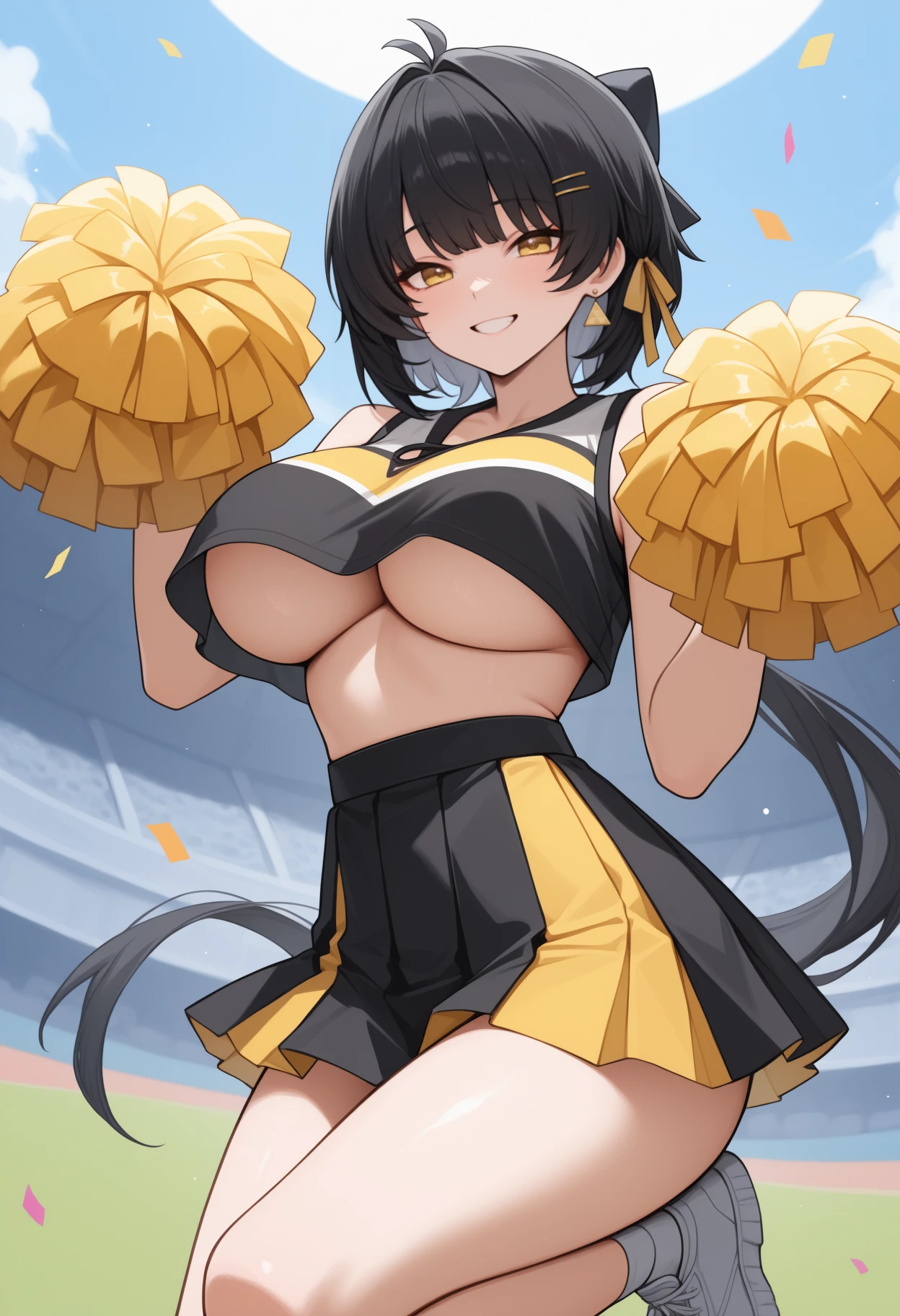 Trigger + Appearance: femr0ver, long hair, black hair, hair ornament, hairclip, yellow eyes, large breasts