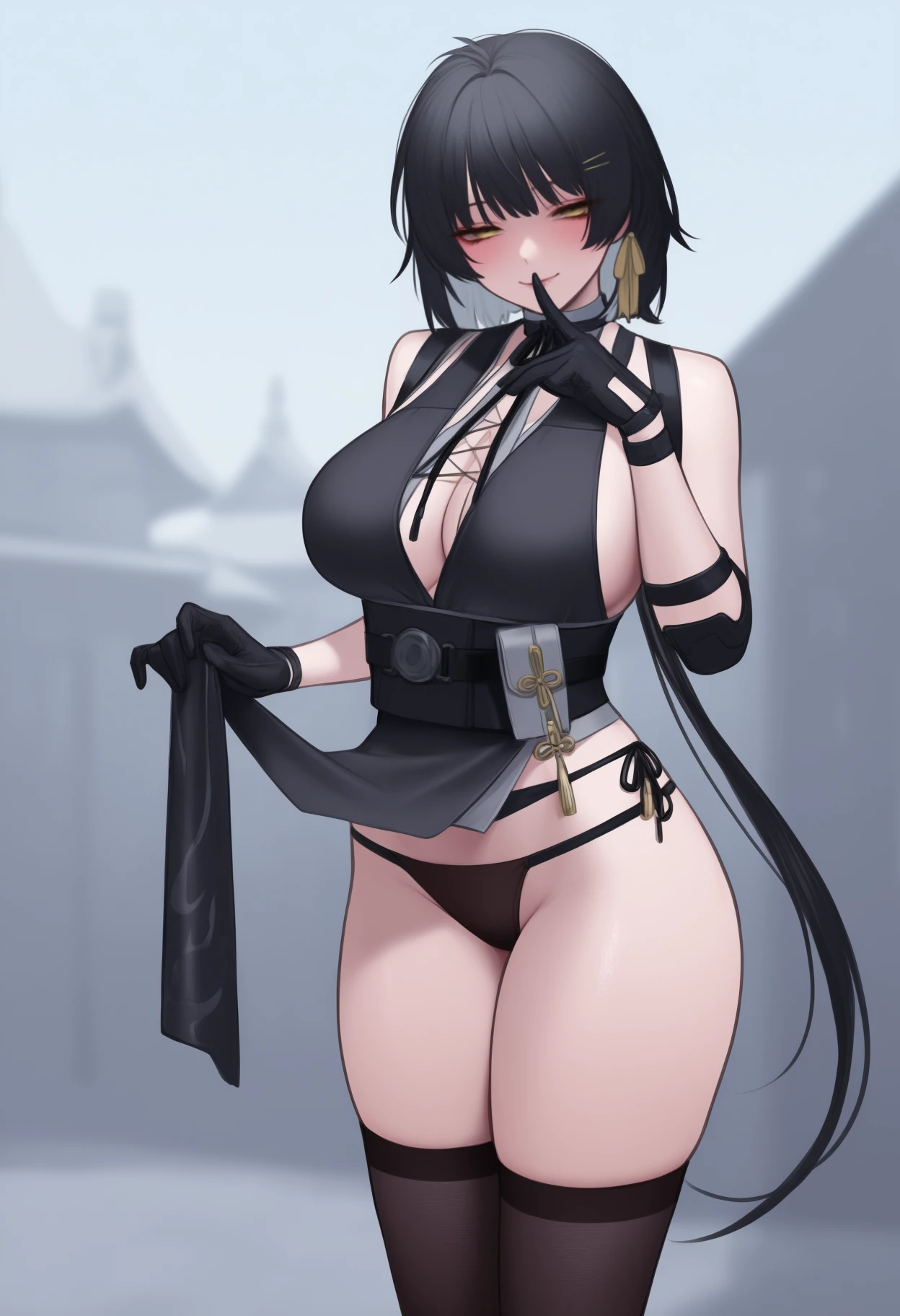femr0ver, long hair, black hair, hair ornament, hairclip, yellow eyes, large breasts