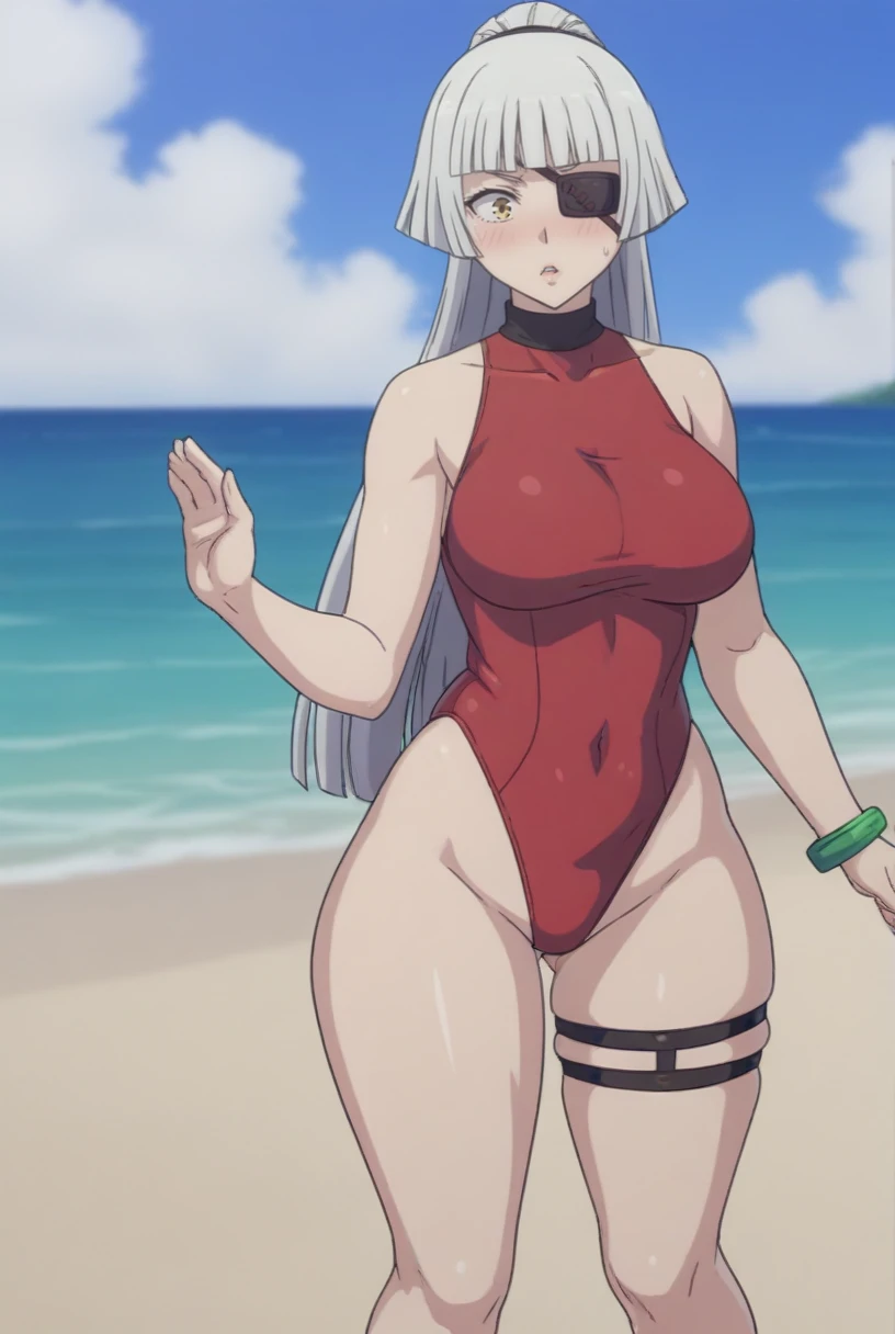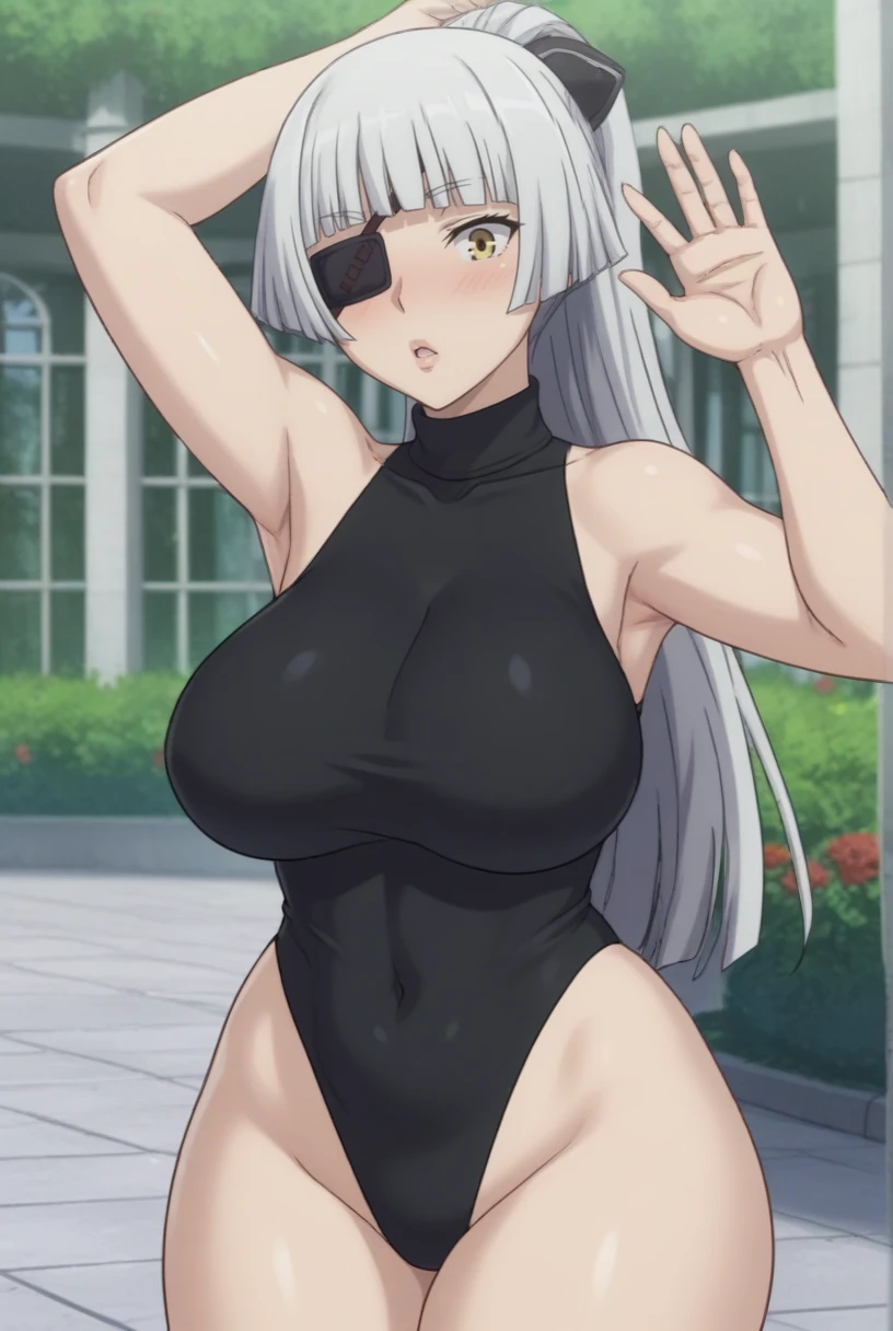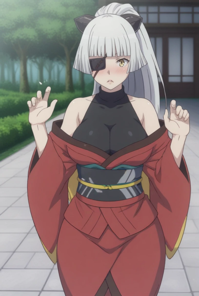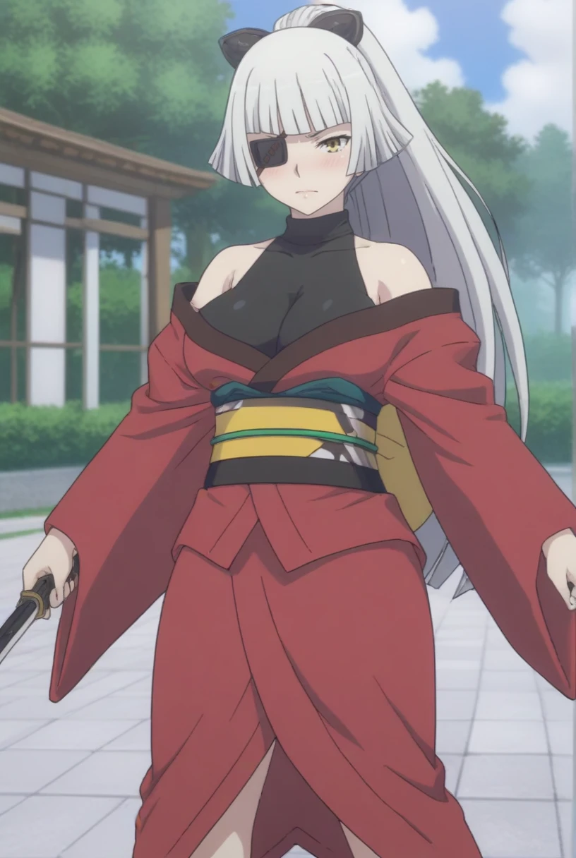 School Outfit: ["lugh, yellow eyes, eyepatch, white hair, long hair, ponytail, blunt bangs, japanese clothes, red kimono, wide sleeves, off shoulder, sash, obi, sleeveless turtleneck"]