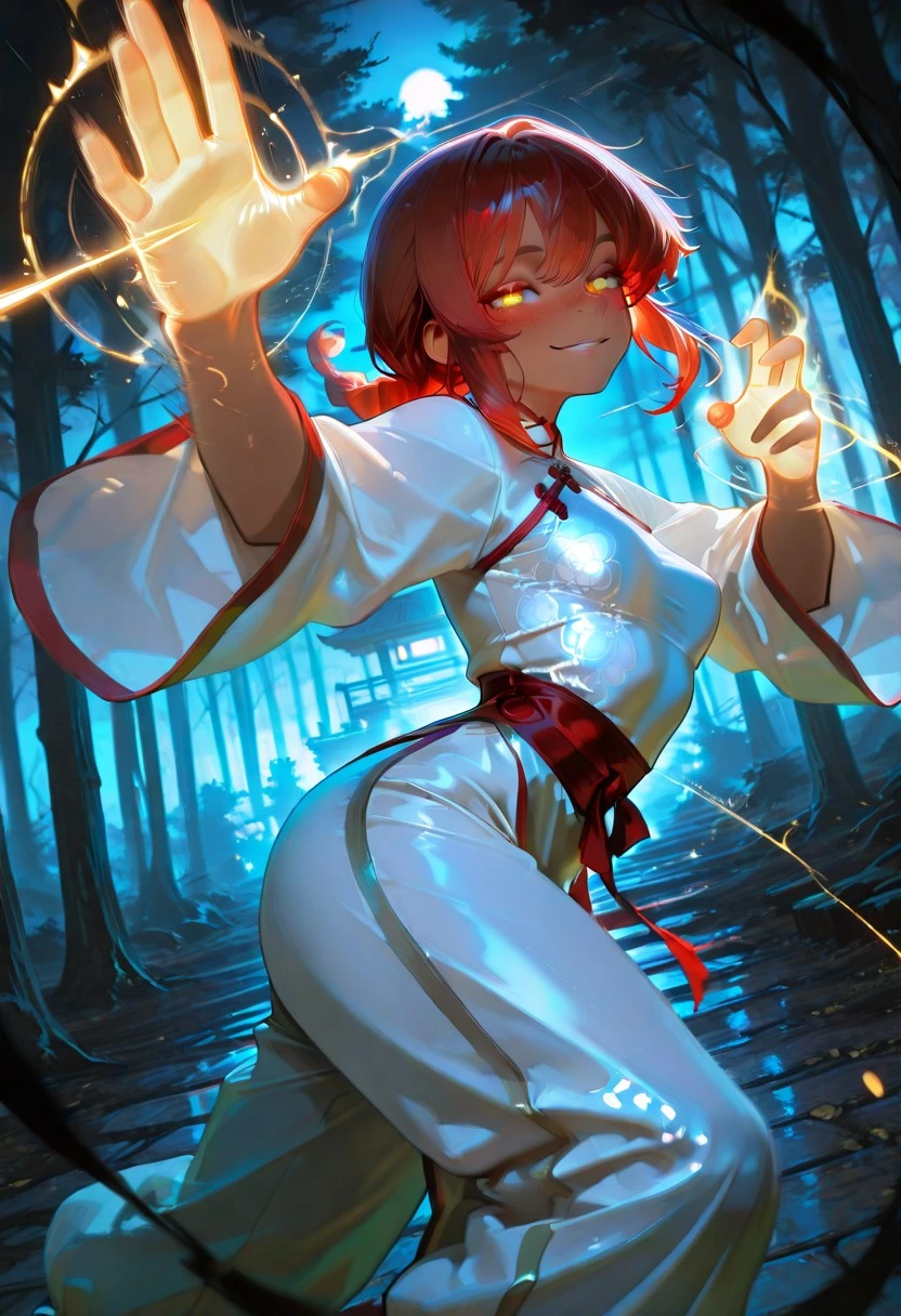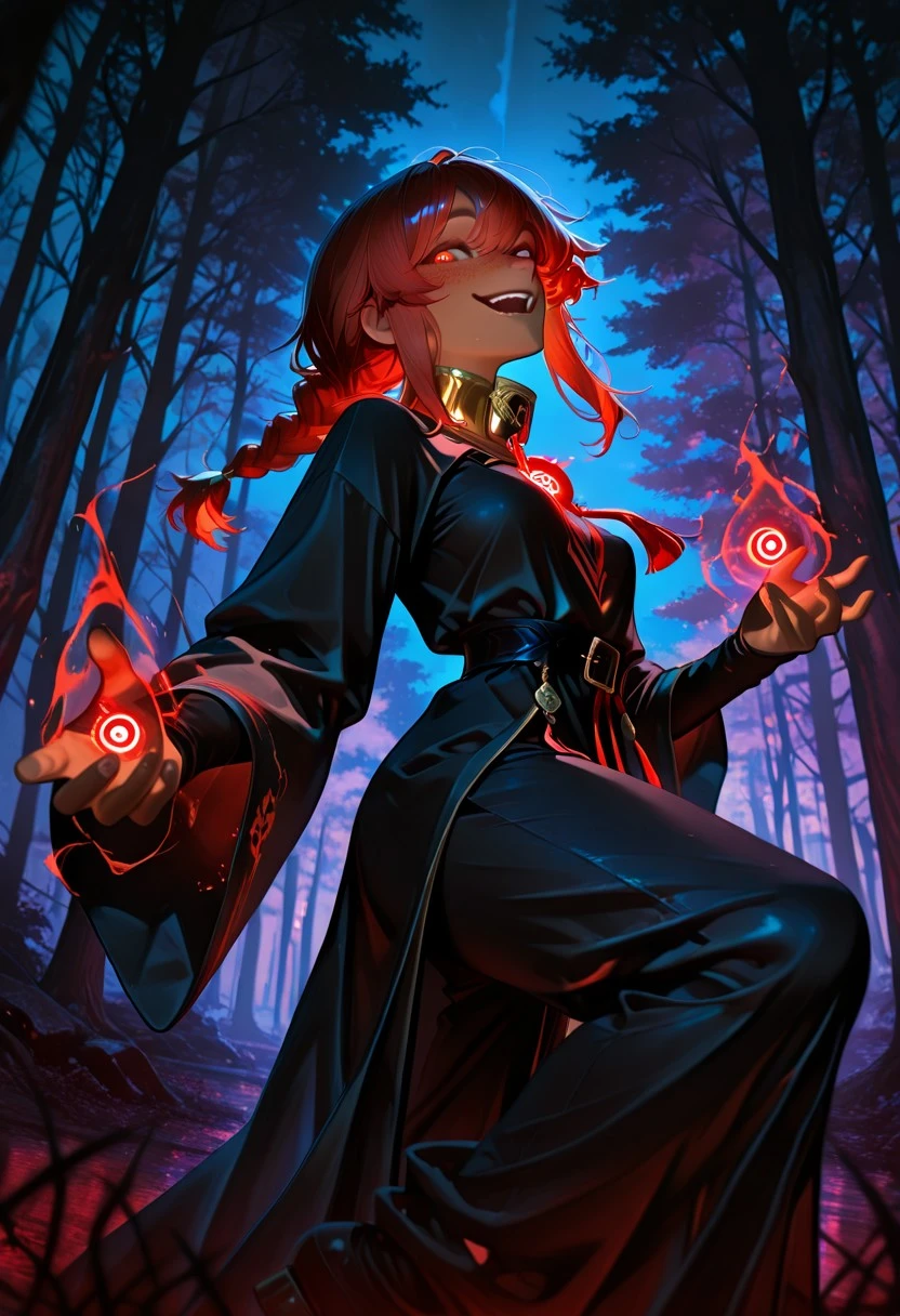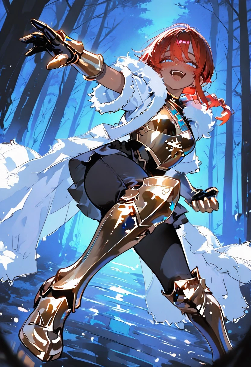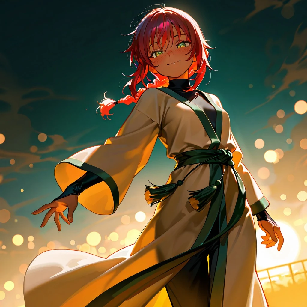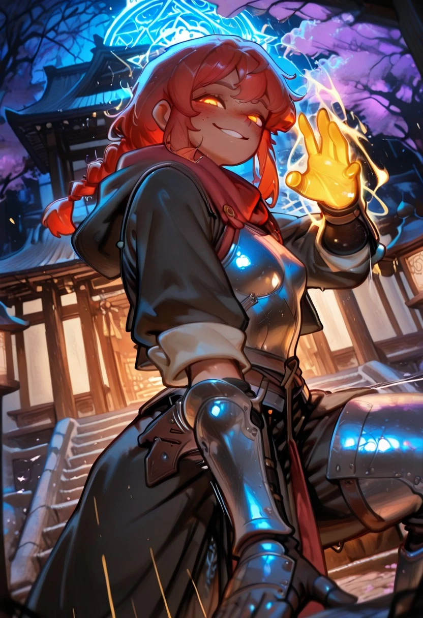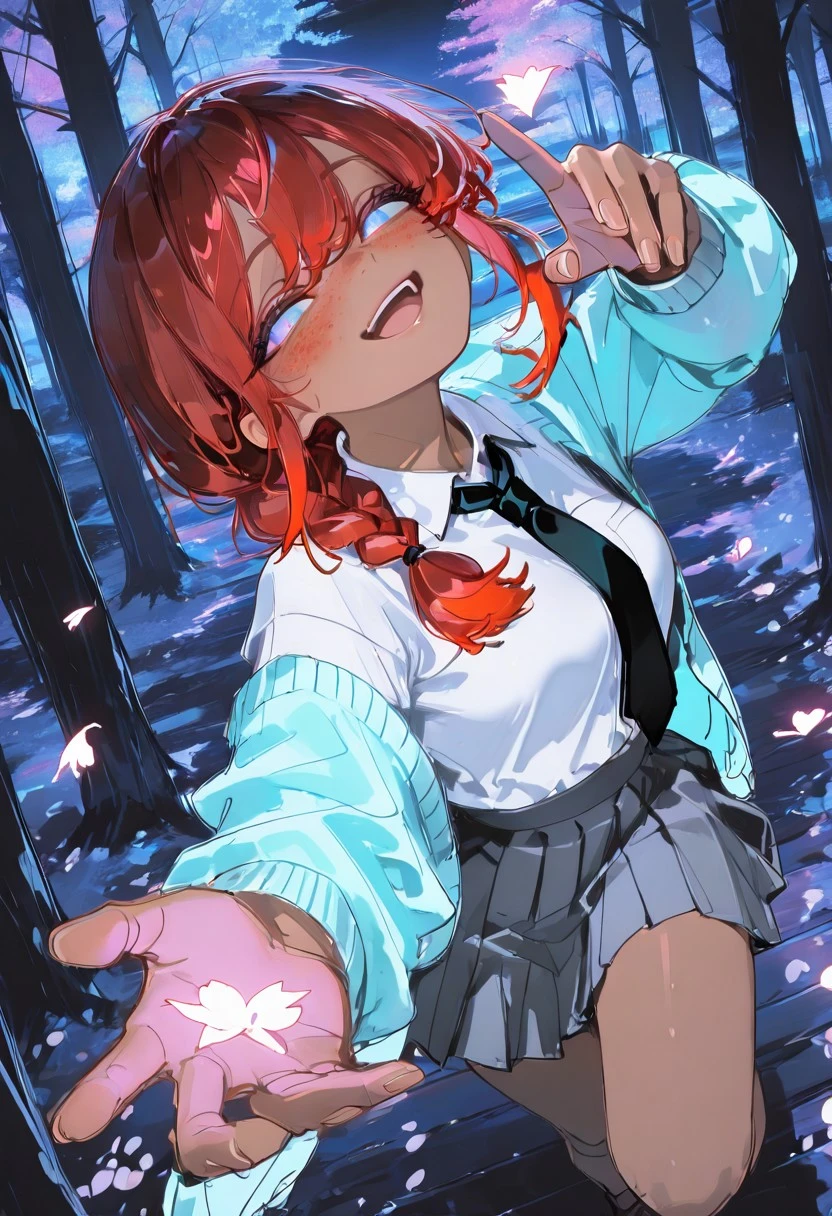 Nalu Tempest, red hair, freckles, tanned skin, braided ponytail, sidelocks, medium hair, long hair, detailed eyes, small perky