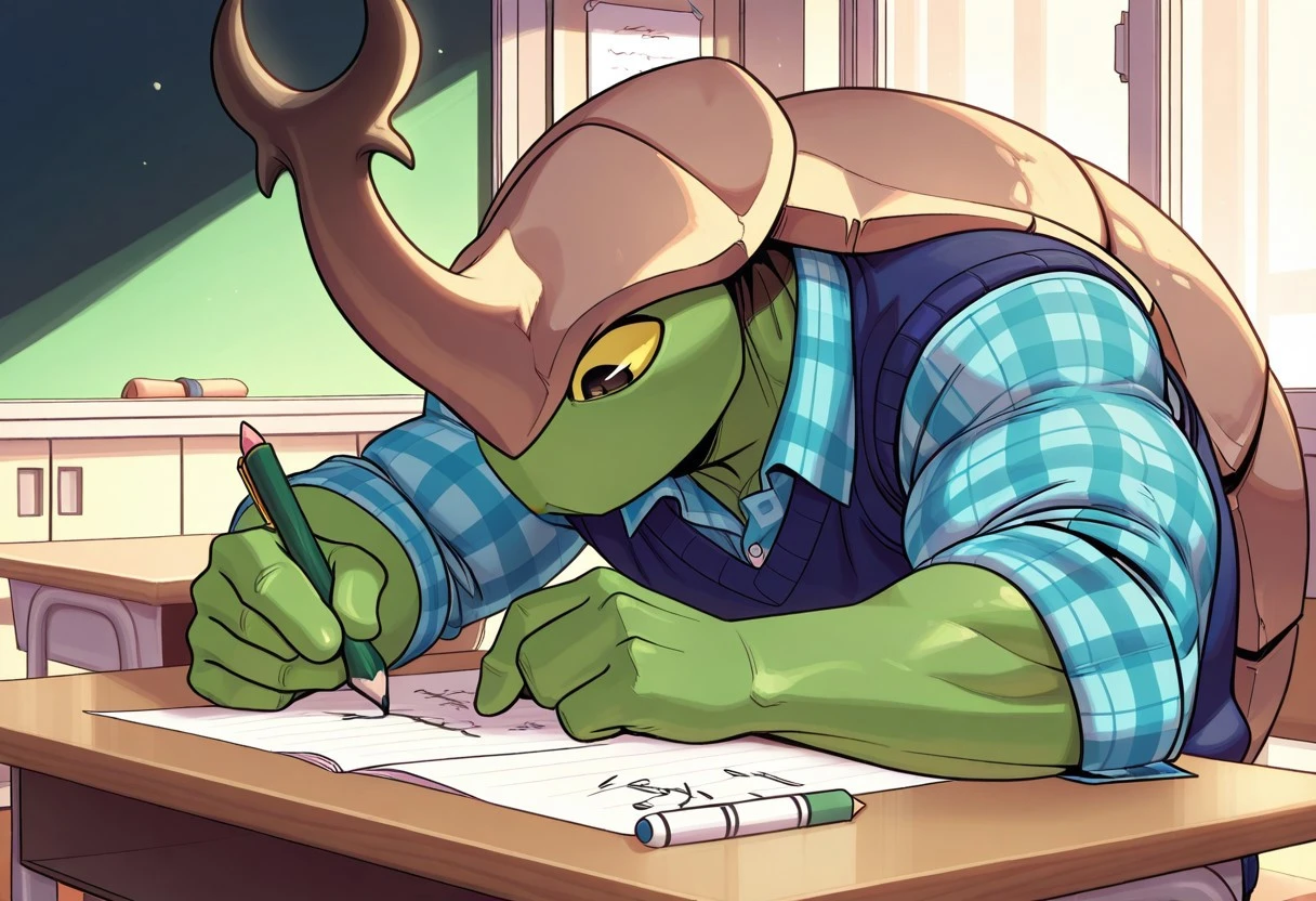 kragglovers, beetle, insect, male, green body, brown shell, horn, muscular, yellow sclera, blue shirt, plaid shirt, sweater vest