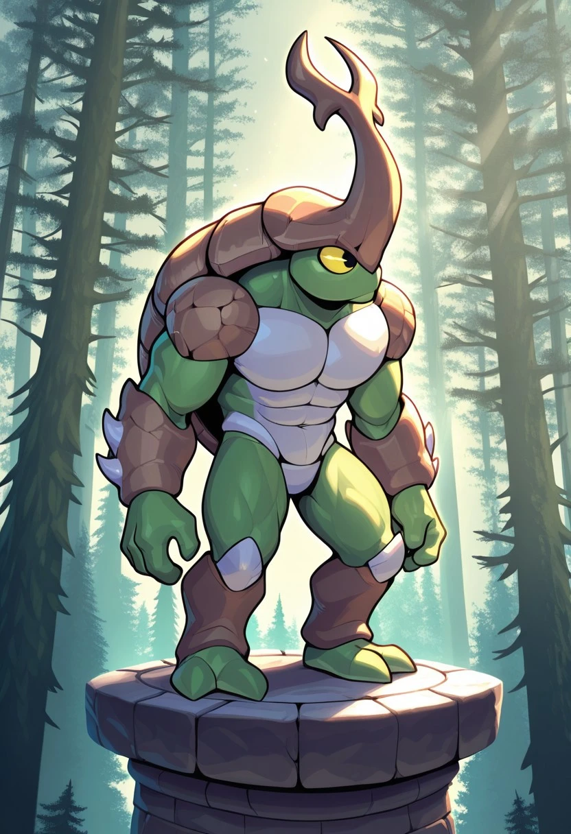 kragg, beetle, insect, male, green body, brown shell, horn, muscular, yellow sclera