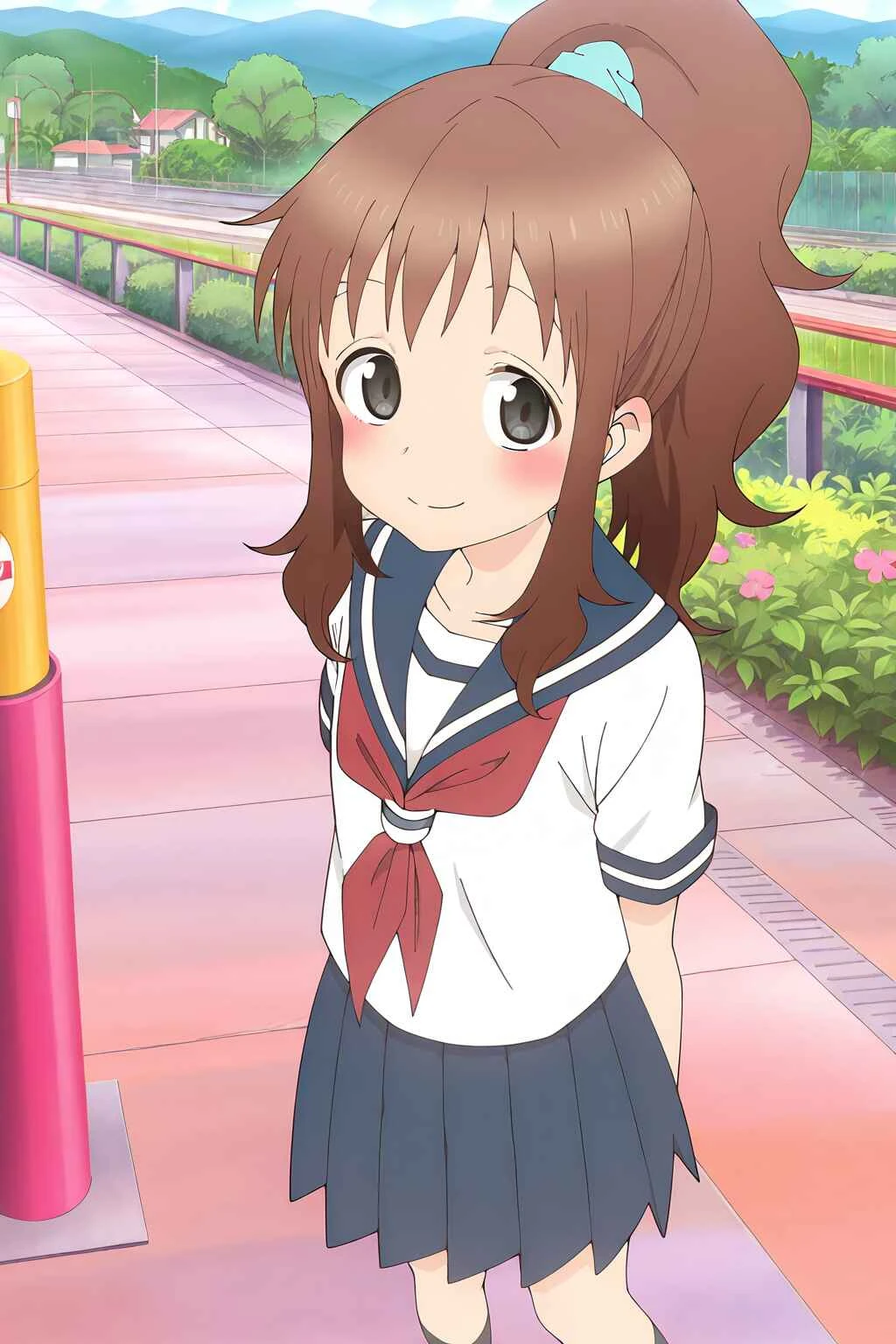 serafuku, red neckerchief, blue sailor collar, short sleeves, white shirt,blue skirt,black socks以下のプロンプトを適宜追加することで、よりアニメのスクリーンショット風の効果が得られます:
