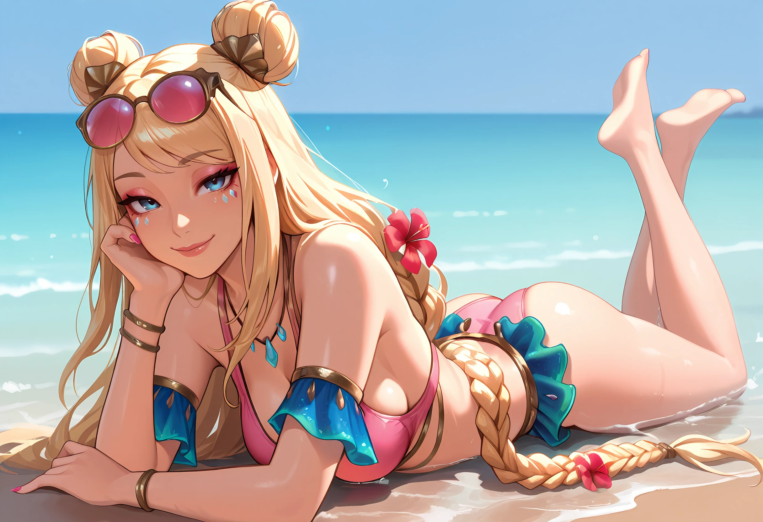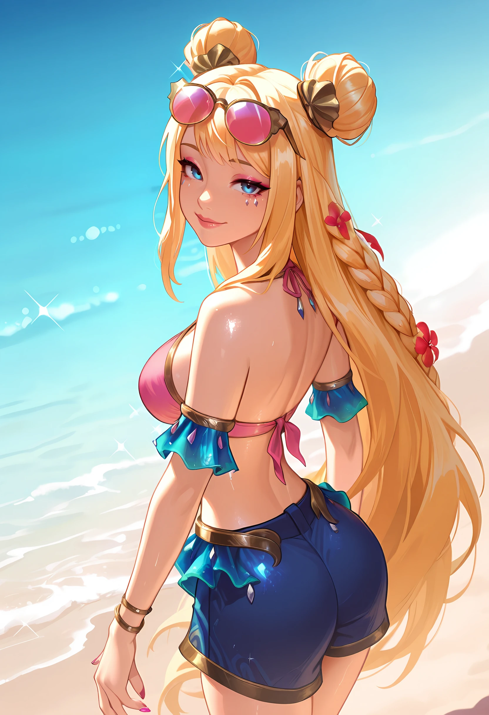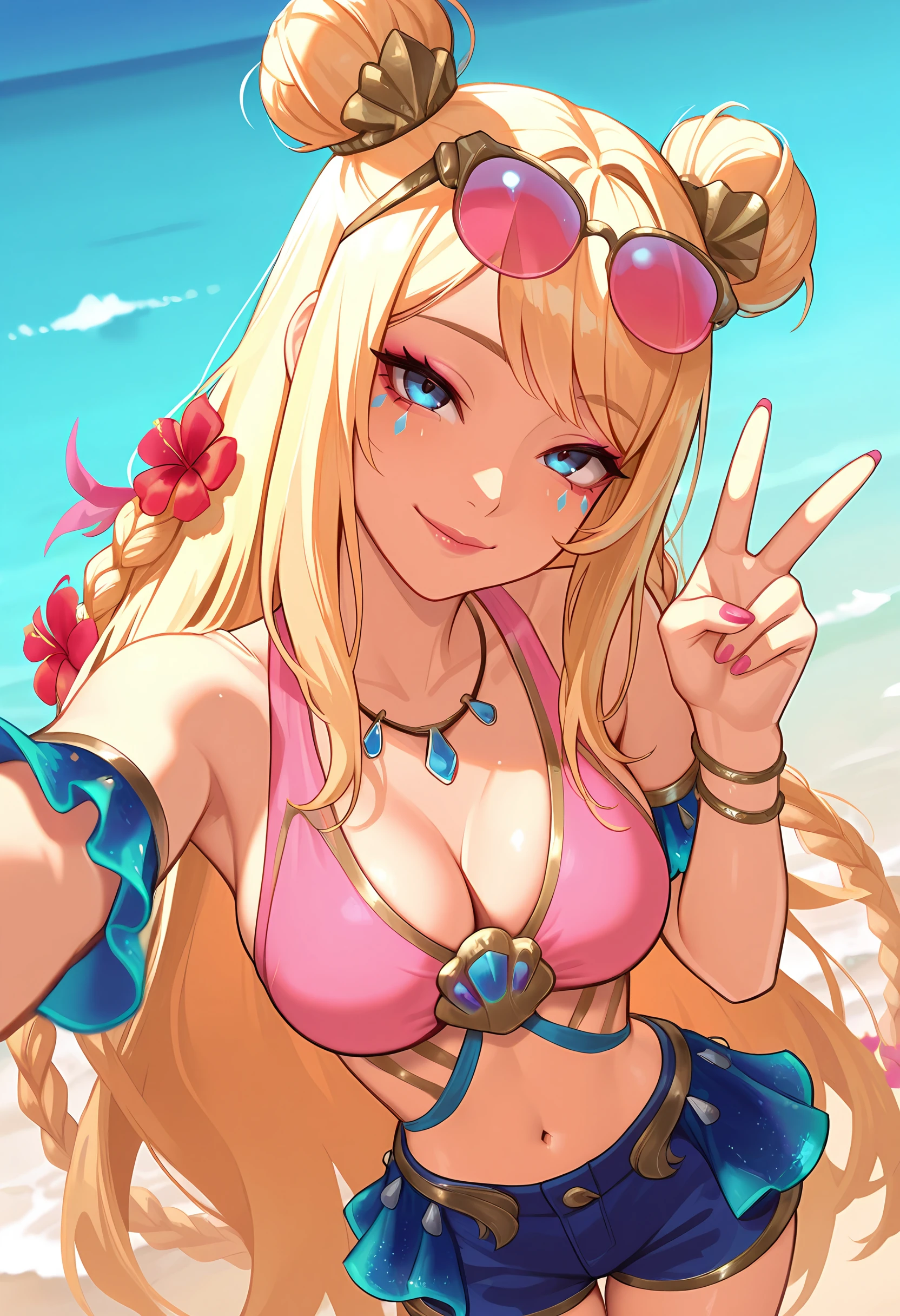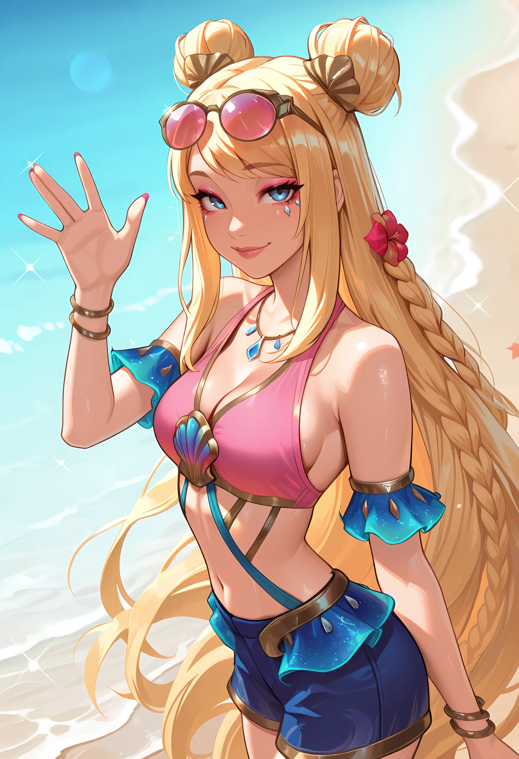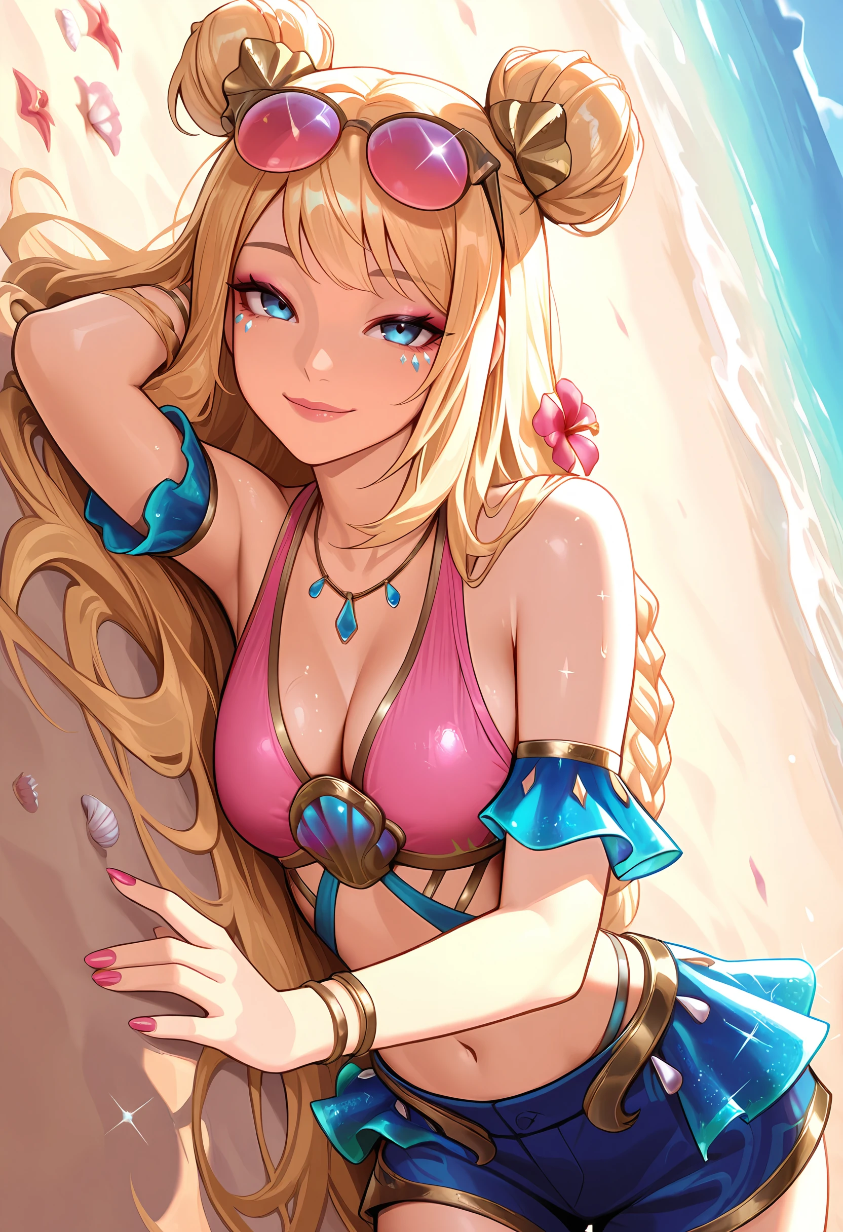 osseraphineil, medium breasts, blonde hair, double bun, very long hair, twin braid, blue eyes, facial mark, eyewear on head, hair ornament, tinted eyewear, navel, necklace, pink swimsuit, blue shorts, arm cuffs, pink nails, bracelet, flower braid, makeup, lips, shell,