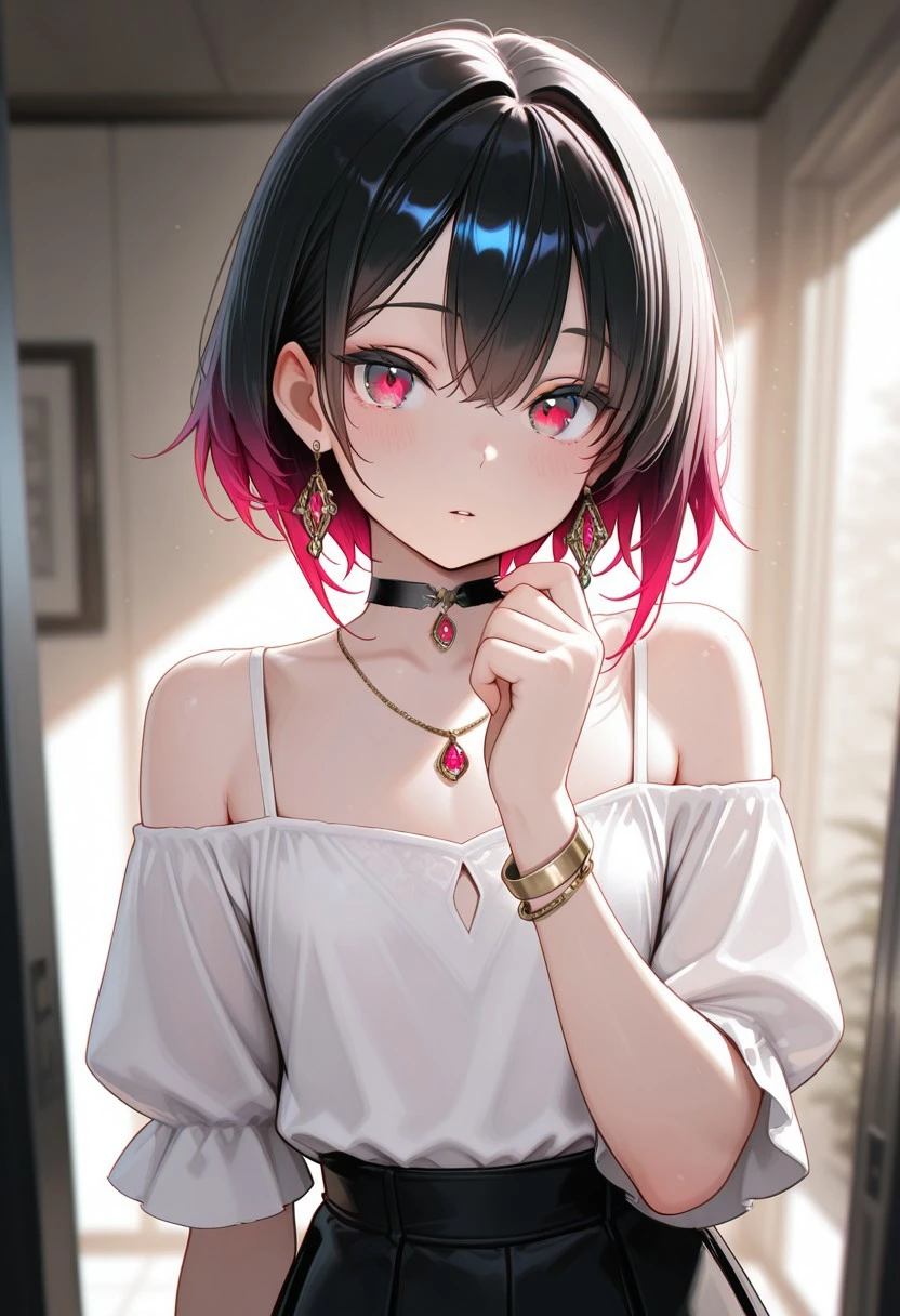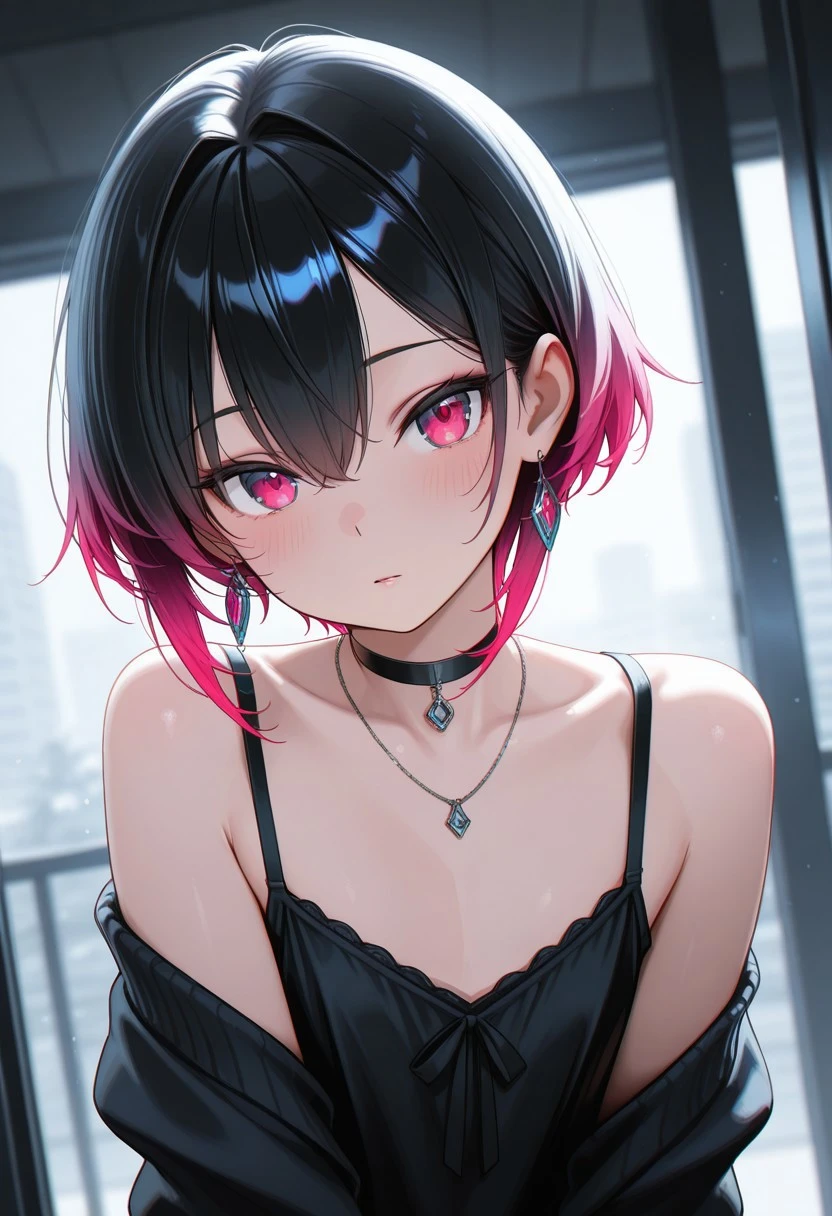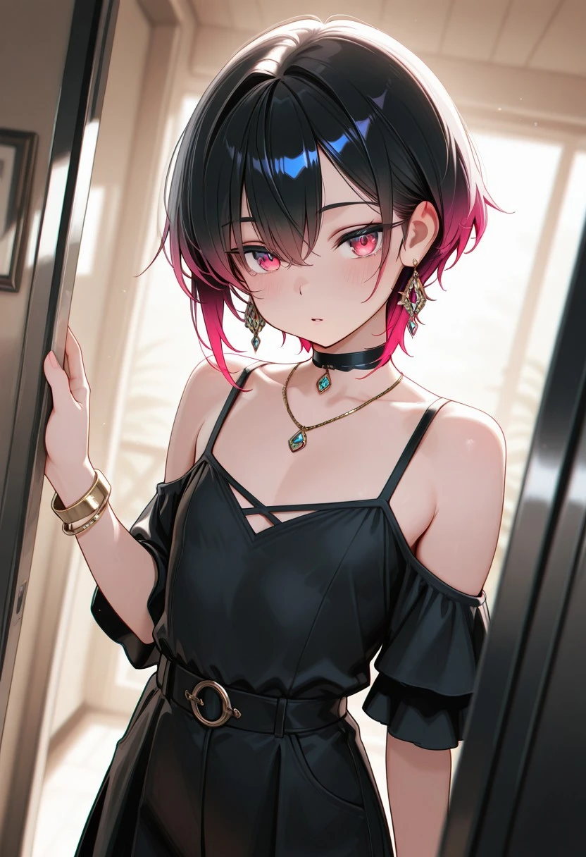 1boy, male focus, kaoru, otoko-no-ko, femboy, crossdresser boy, choker, jewelry, bracelet, earrings, necklace, black hair, short hair, wolfcut, one side longer, gradient hair, hair between eyes, parted lips, two-tone hair, red hair, flat chest, sometimes "flat chest" won't work cuz civit will think that it violates TOS (maybe cuz there's 1boy prompts?) but you could just remove it and add these negative-