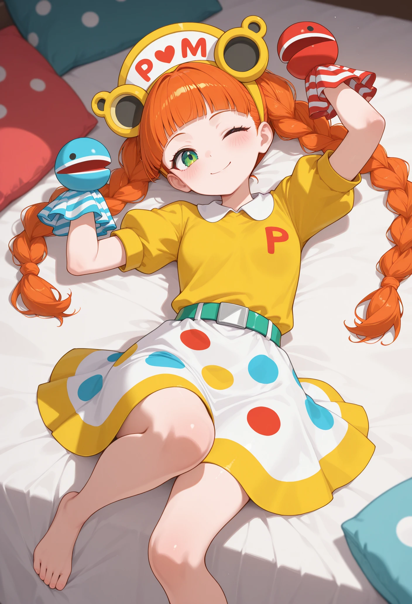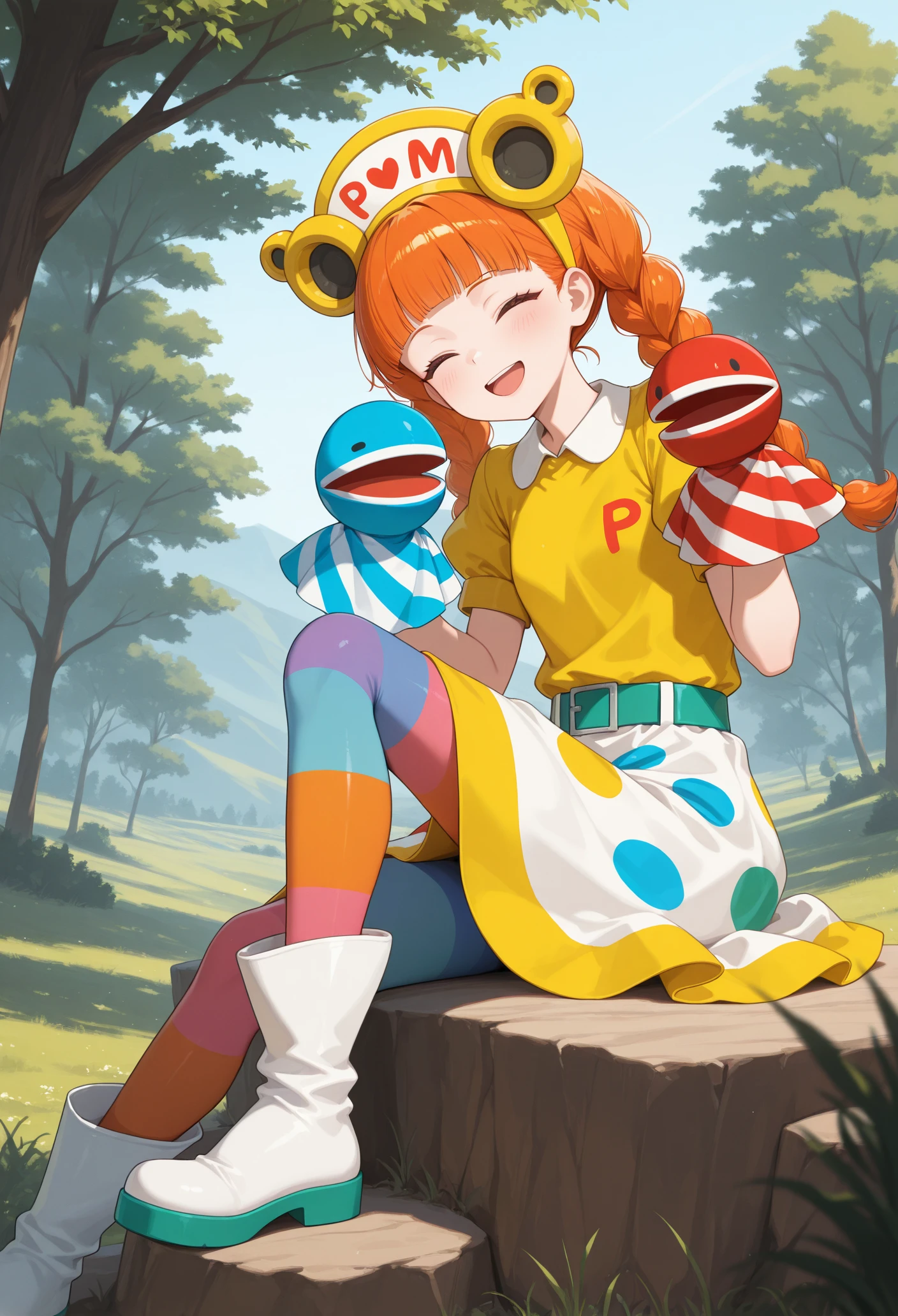 red puppet,blue puppet,hand puppet,striped,hat,dress,short sleeves,polka dot skirt,colorful polka dot,belt,pantyhose,