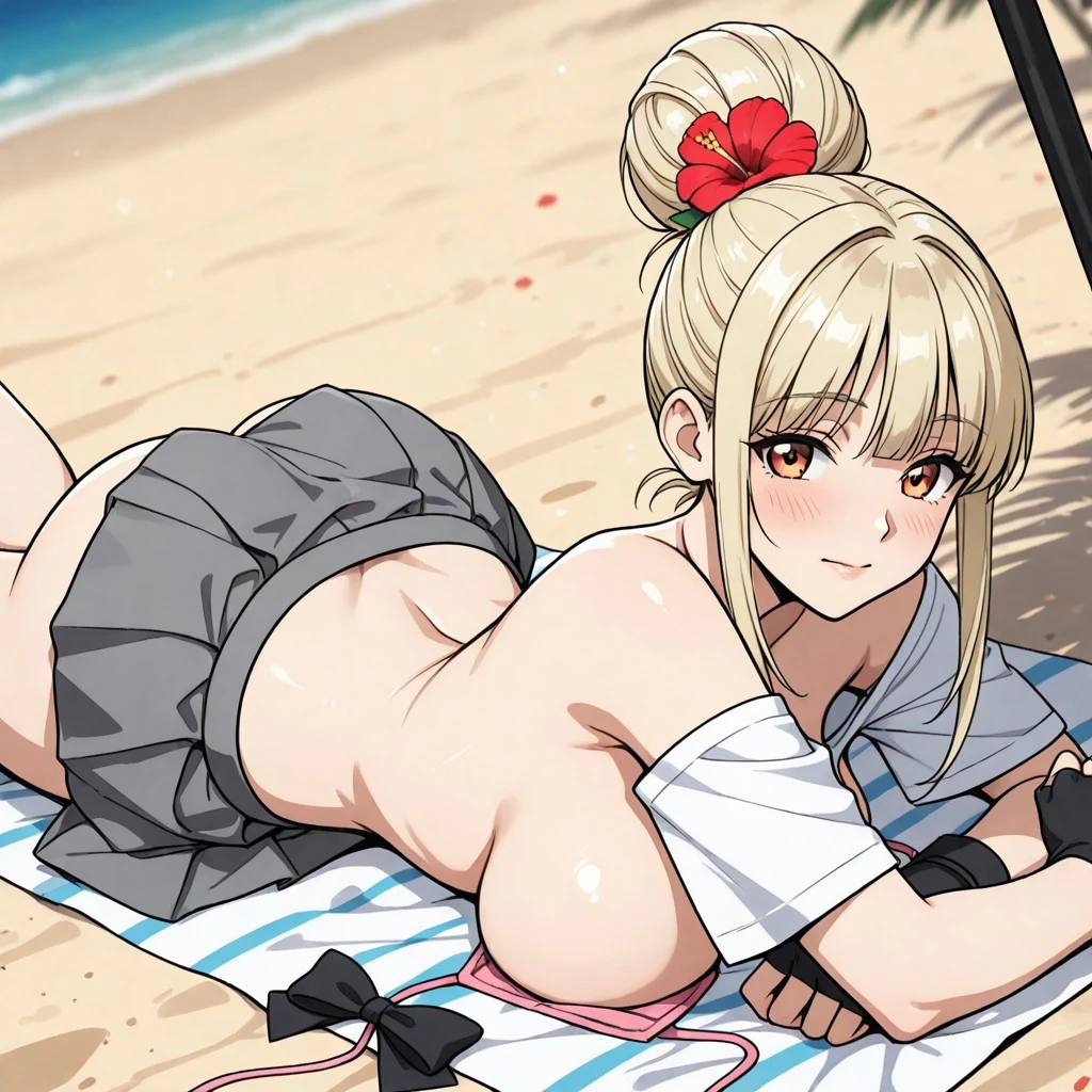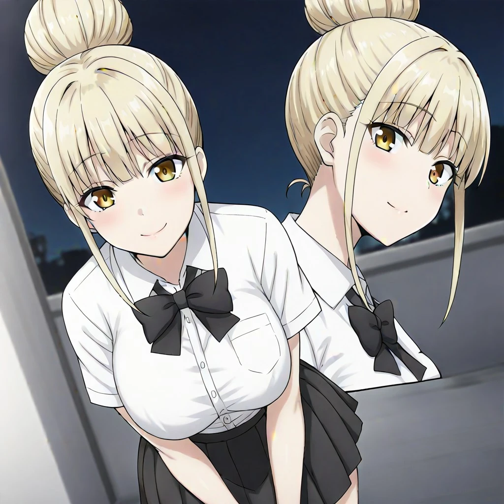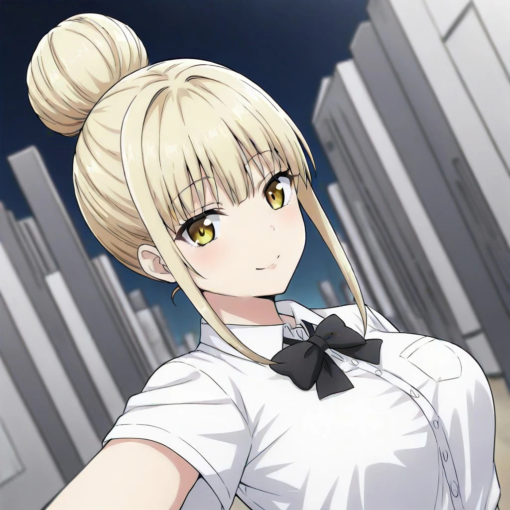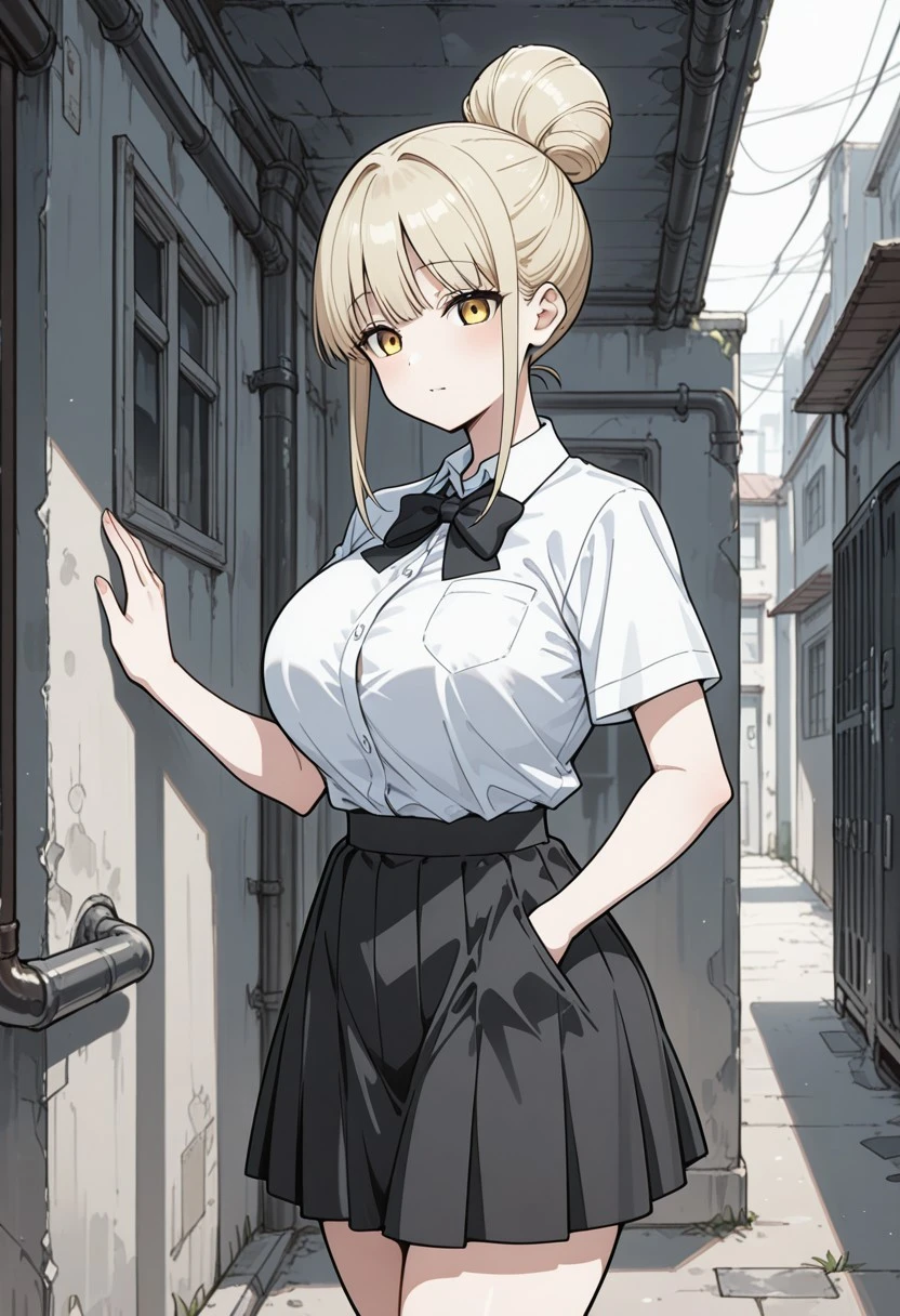 bundBlond3, 1girl, light blonde hair, large high hair bun, hair pulled back, straight blunt bangs, long sidelocks, hair tucked behind ears, yellow eyes, white t-shirt, black bow, black grey ploated skirt,