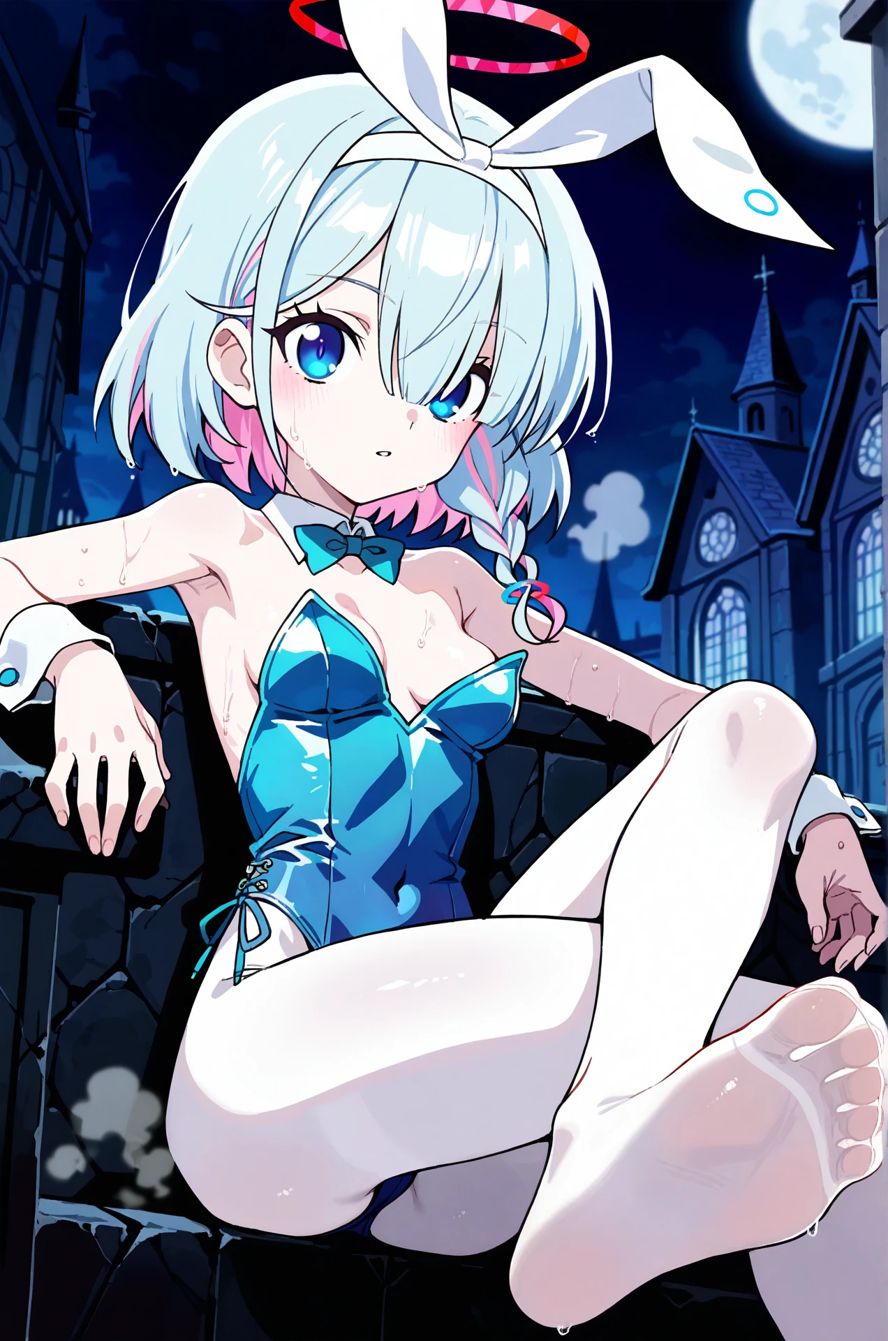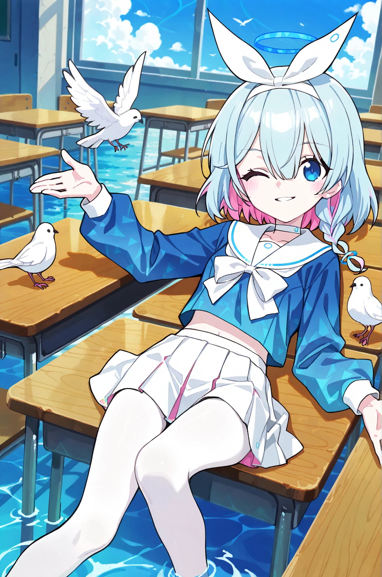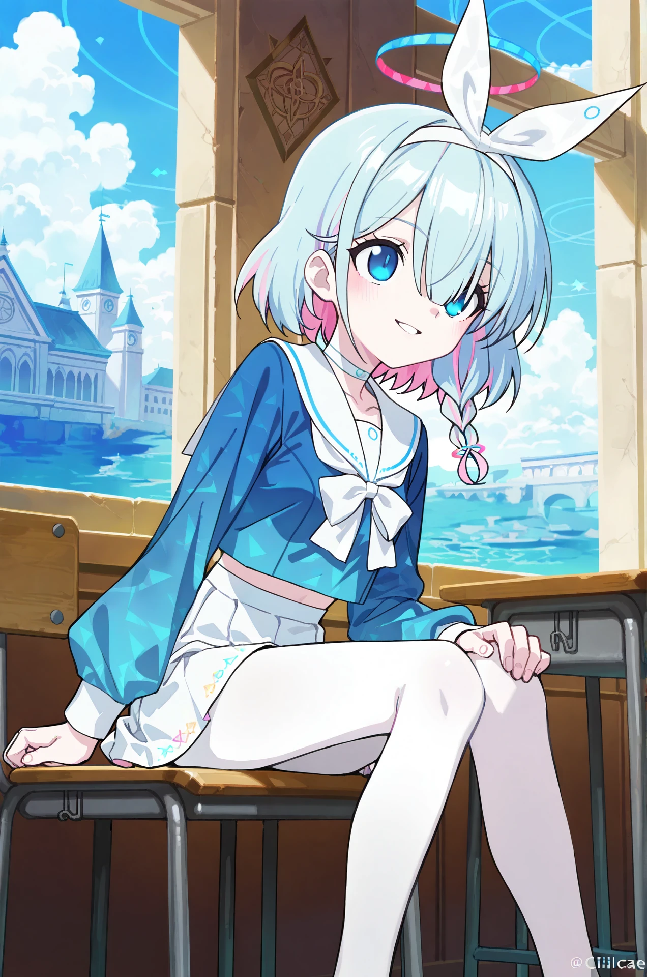 1girl, arona (blue archive), arona \(blue archive\), blue hair, blue eyes, blue halo, halo, medium hair, multicolored hair, colored inner hair, two-tone hair, hair over one eye, (one eye covered), hair ribbon, white ribbon, Original outfit:
