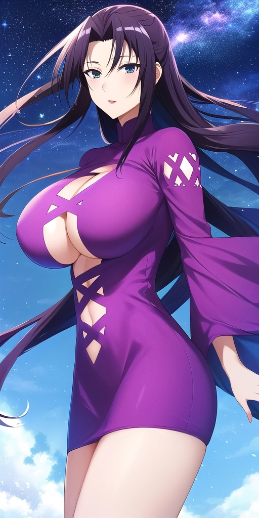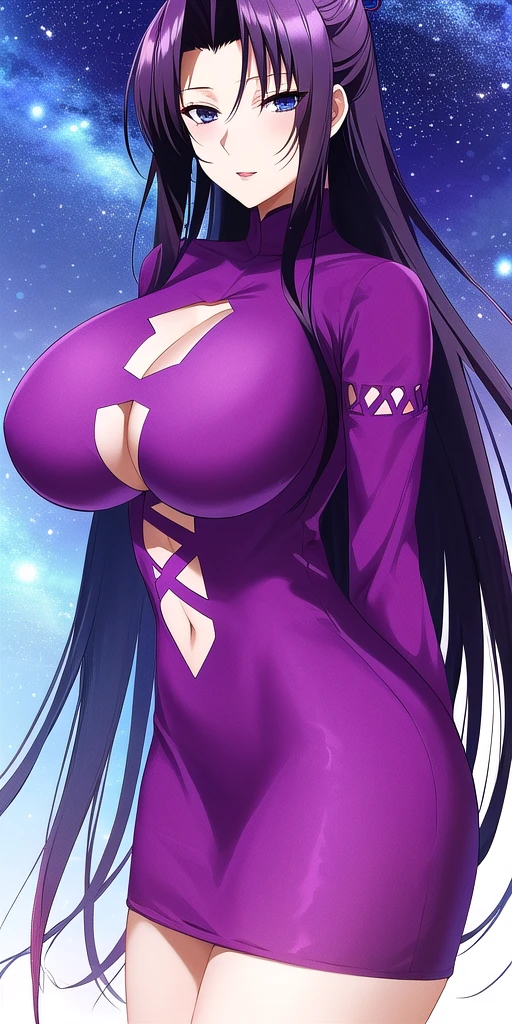 purple_turtleneck_short_dress_wide_sleeves_clothing_cutout_cross-laced_clothes