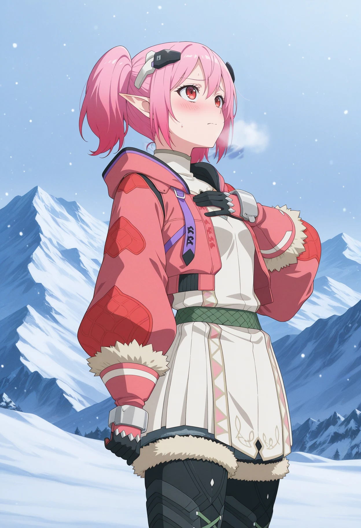 science fiction, red eyes, pointy ears, twintails, hair ornament, gradient hair, pink hair, cropped jacket, short dress, white dress, gloves, thigh boots, fur trim, fur-trimmed leg warmers