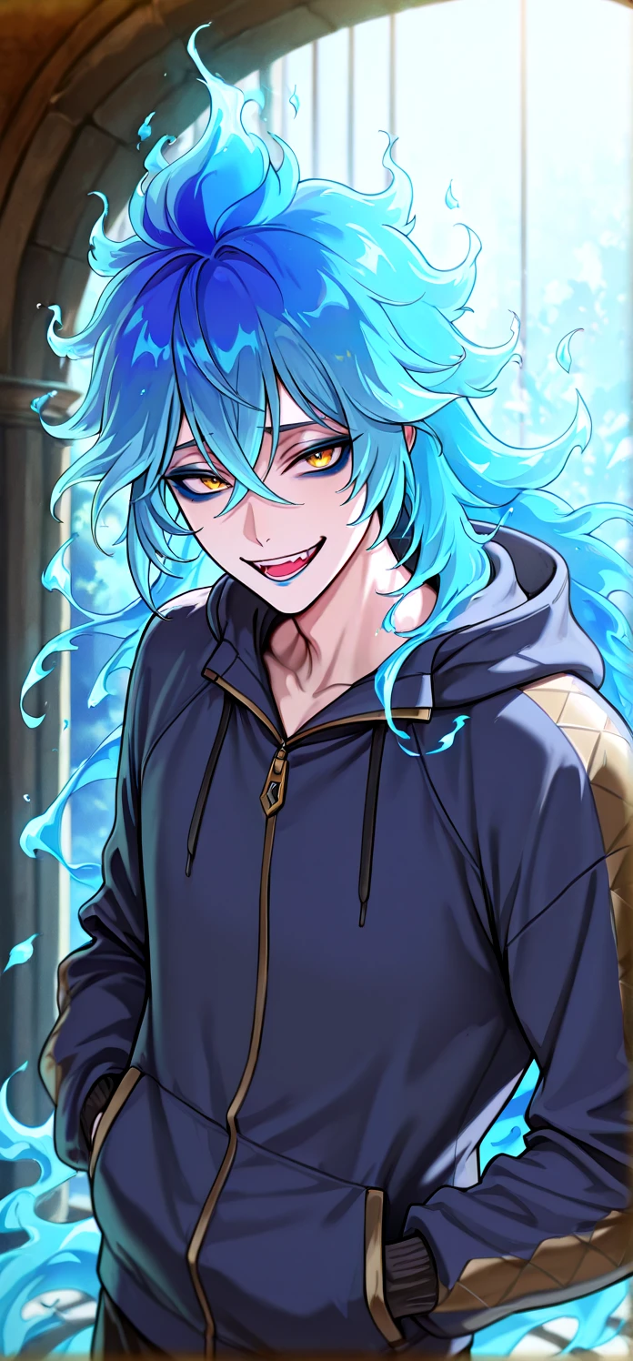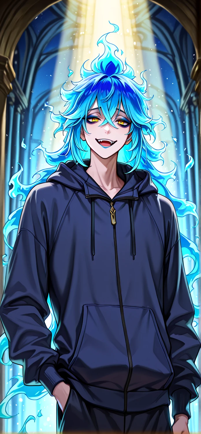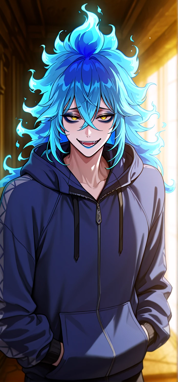 idia shroud,blue hair,long hair,hair between eyes,makeup,yellow eyes,eyeshadow,blue lips,fiery hair,blue eyeshadow,crossed bangs,lipstick,sidelocks,eyelines,bangs under eyes,sharth teeth