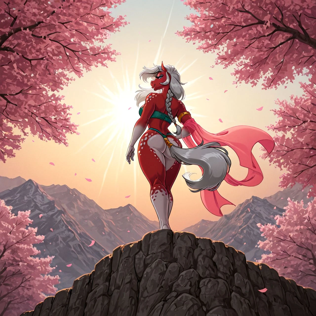 mojita, equine, white hair, yellow eyes, eyeshadow, braided hair, red body, countershade torso, white spots, white countershading, purple eyeshadow, white hands,