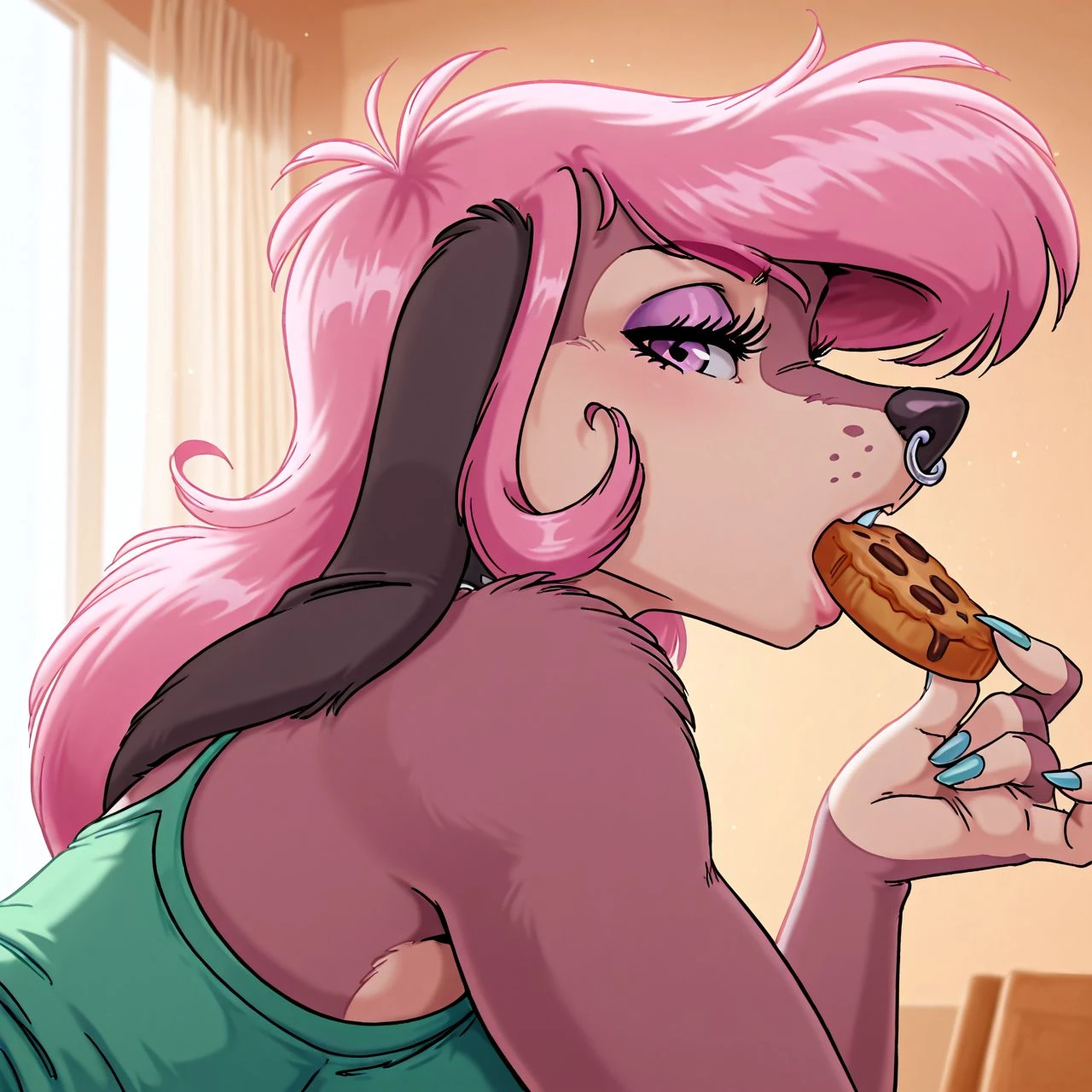 bianca, canine, floppy ears, black ears, eyeshadow, nose piercing, pink hair, black nose, countershading,