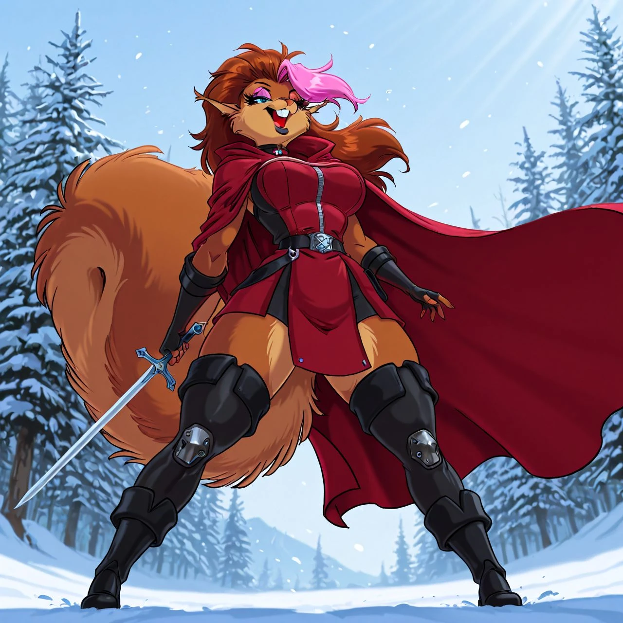 marika, tree squirrel, brown body, countershading, two tone hair, brown hair, pink highlights, blue eyes, eyeshadow, buckteeth, pointy ears, ear tuft,