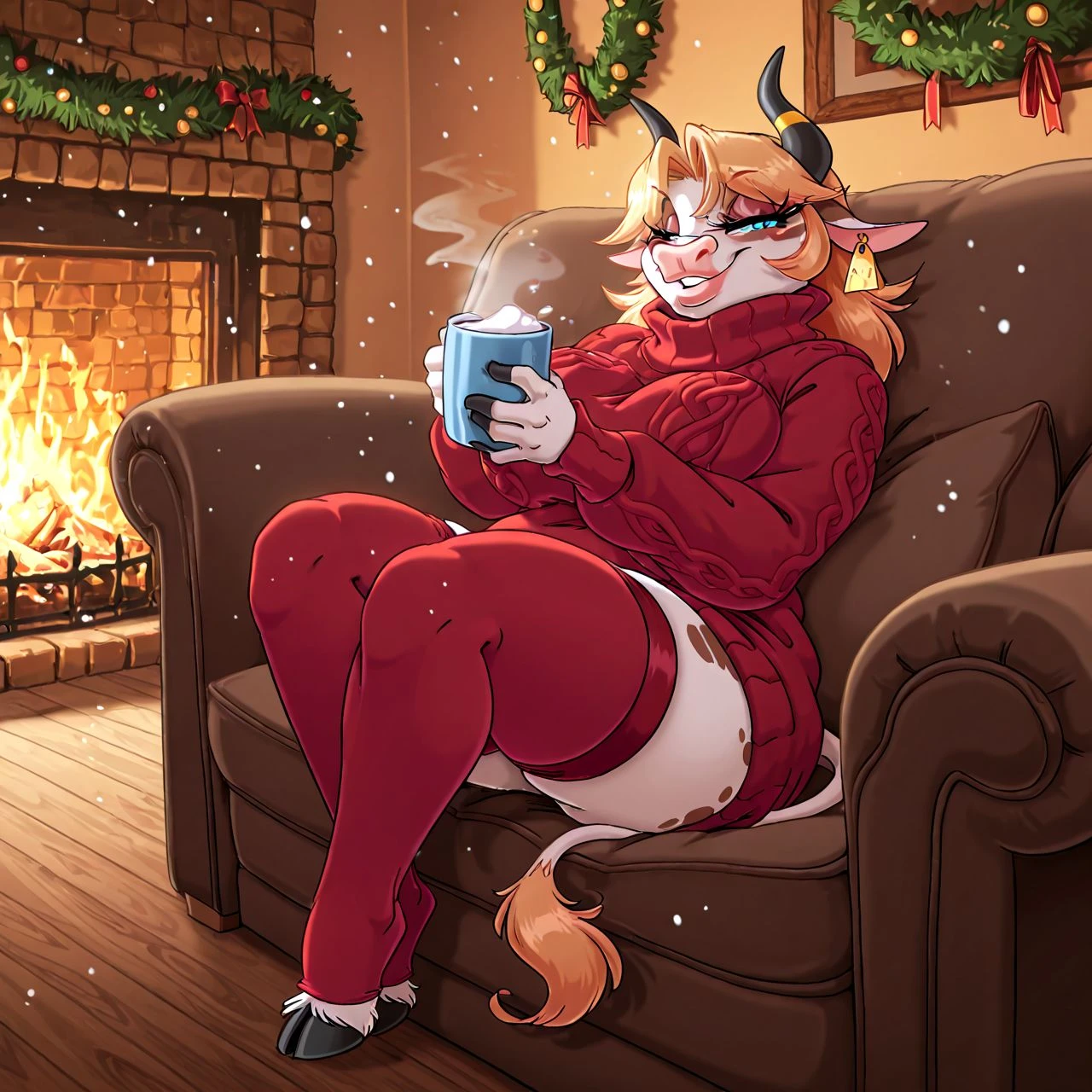 babette,bovine, cattle, horns, brown spots, eye markings, older, blue_eyes, septum_piercing, hooves, blonde hair, white body, hands , chubby,