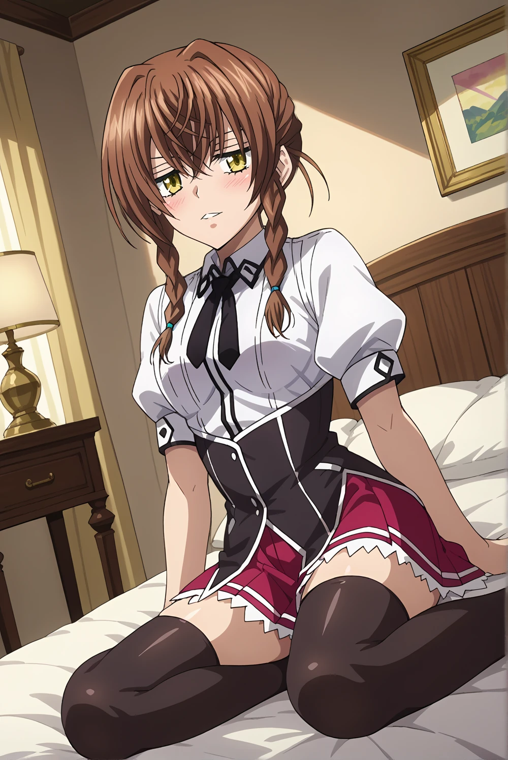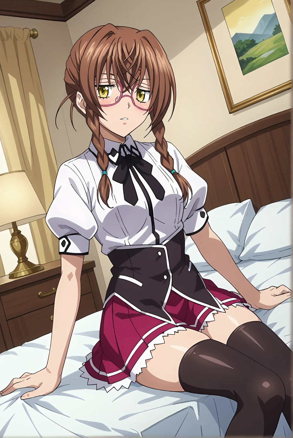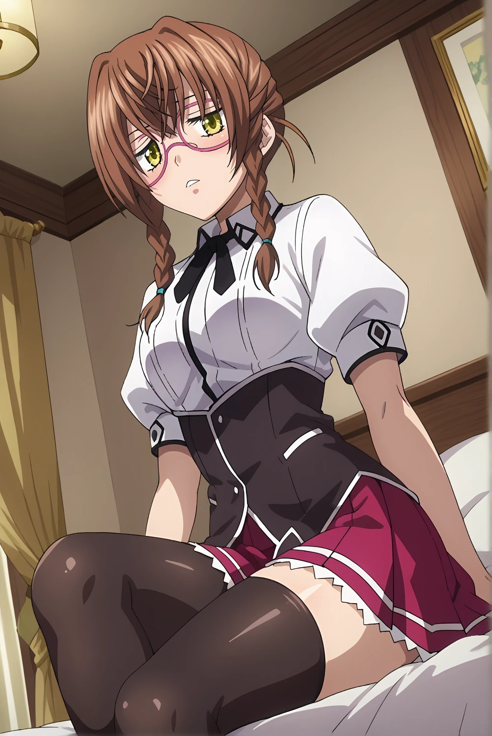 kiryuu-dxd, 1girl,glasses, brown hair, braid, twin braids, yellow eyes, golden eyes, shirt, skirt, black, black thighhighs, zettai ryouiki, puffy sleeves, dxd-uniform