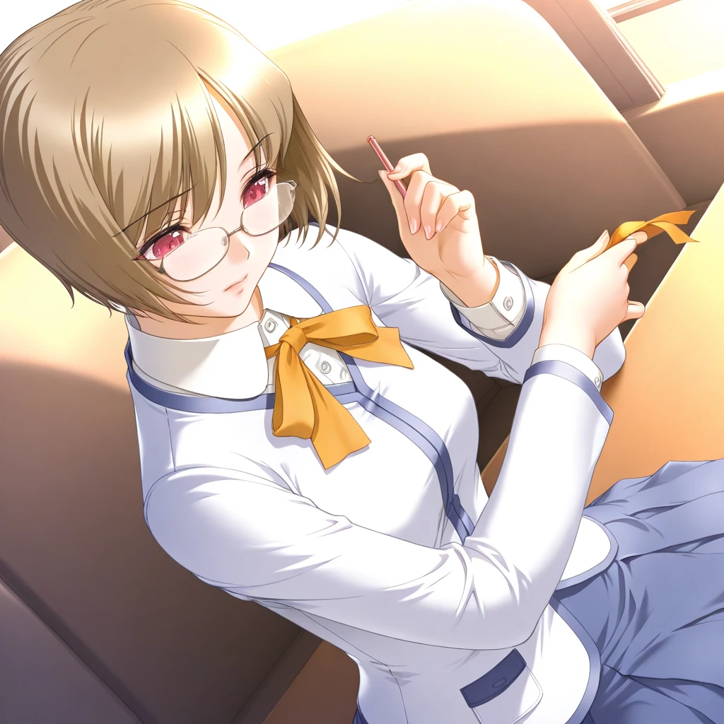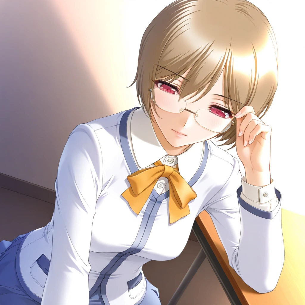 hanamaru_kotona, red eyes, brown hair, short hair, glasses,